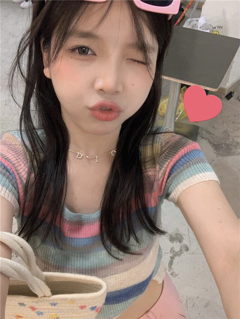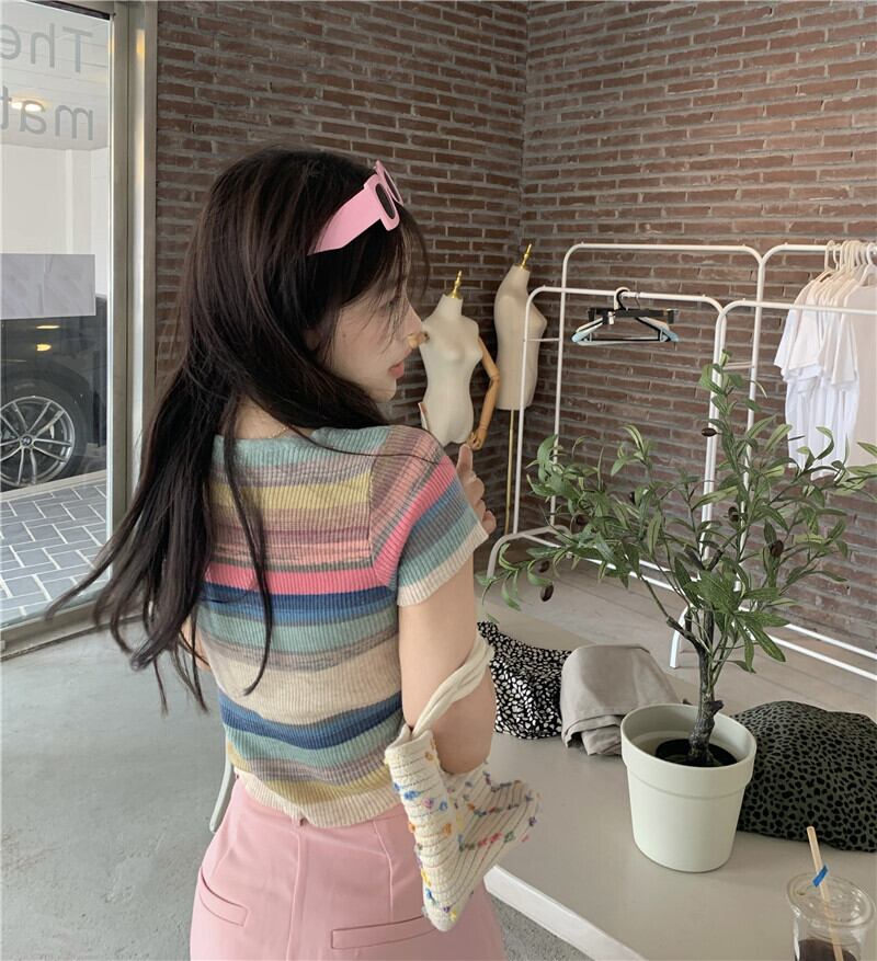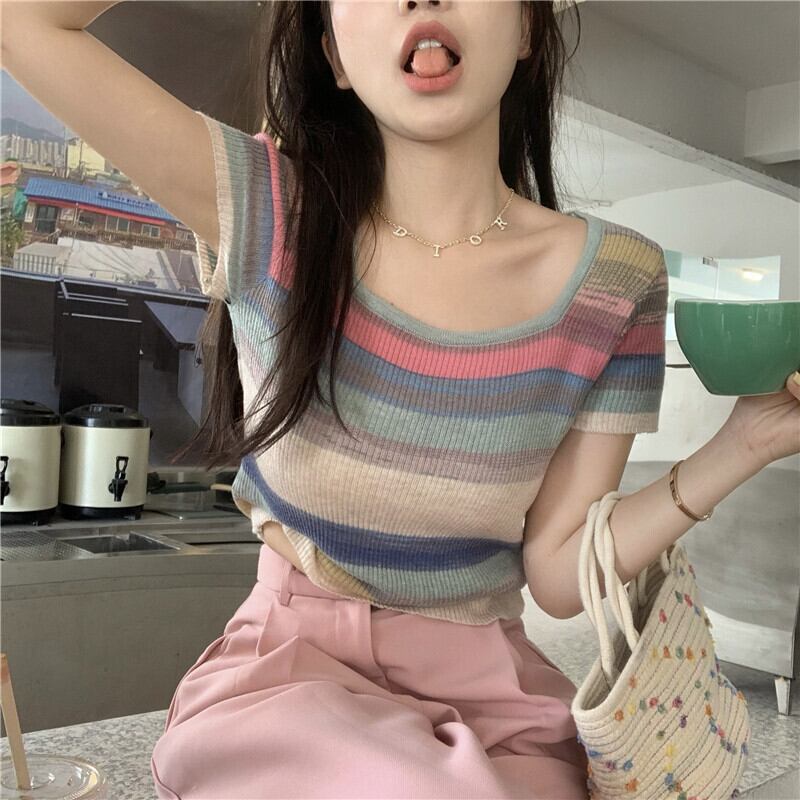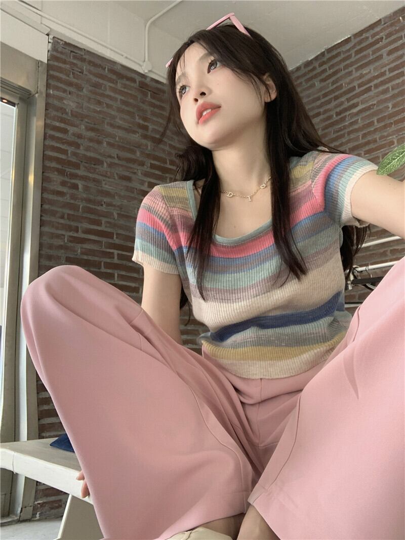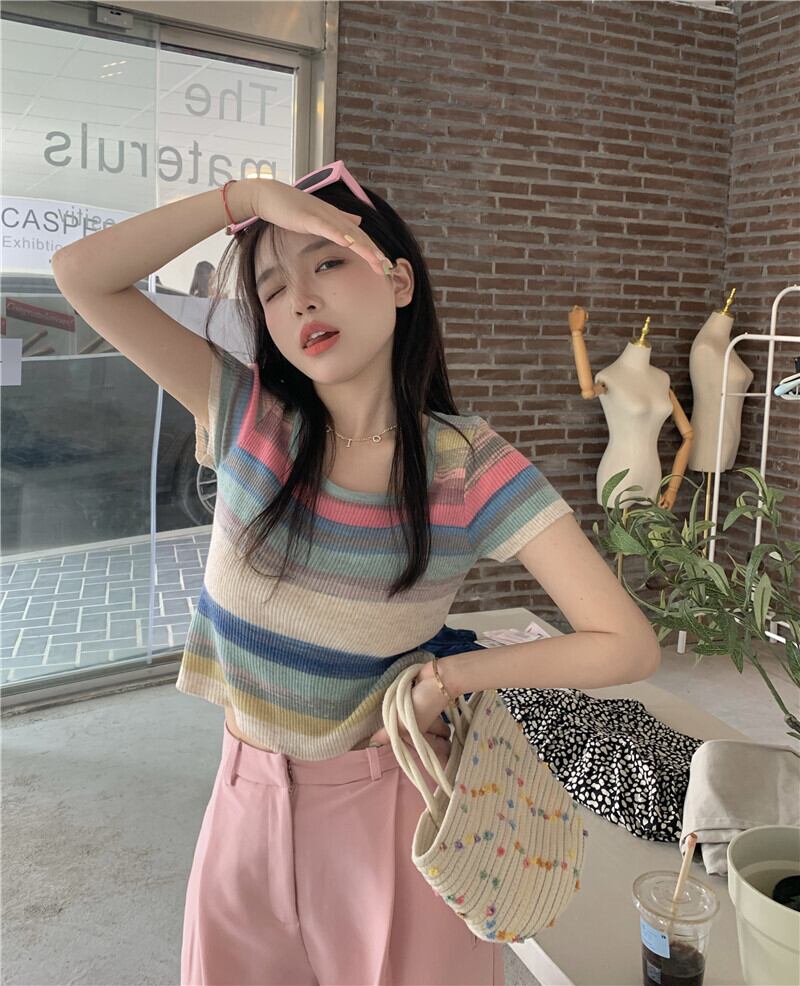 サマーアイスシルクニットストライプTシャツレディース半袖シンデザインニッチフロントショルダーショートハイウエストクロップトップ ハイウェスト 夏物 7460032070070124 | framboise21