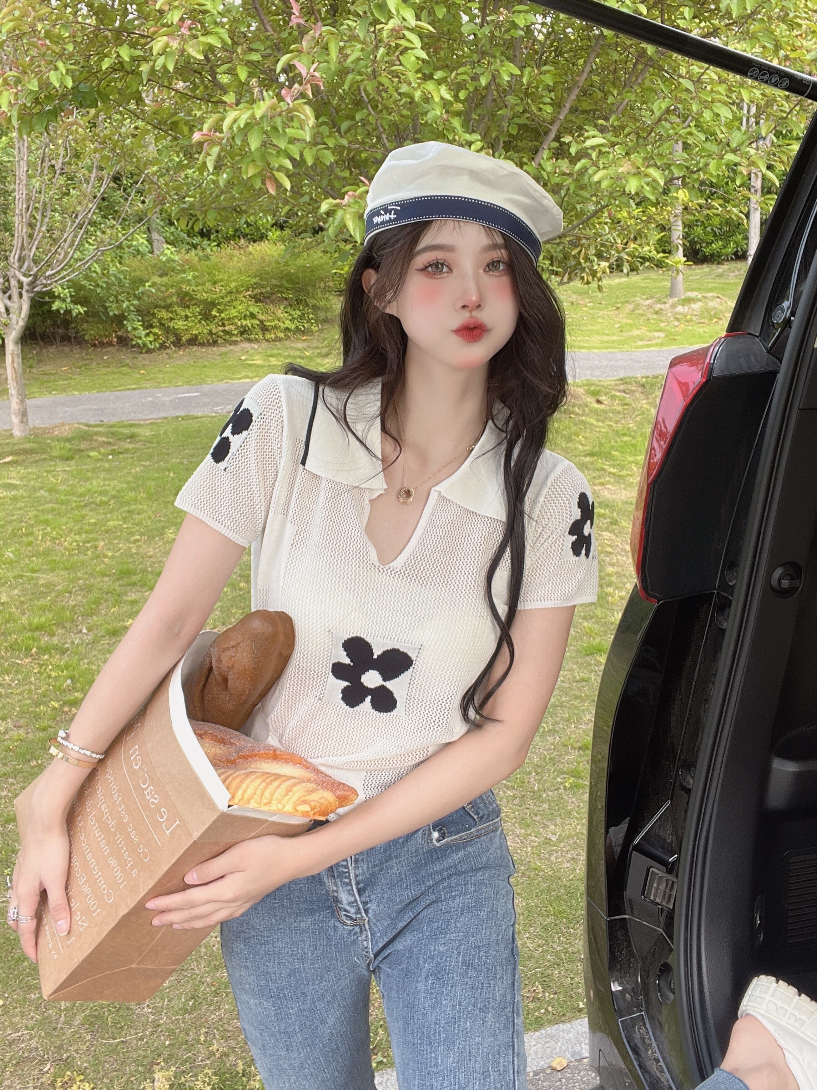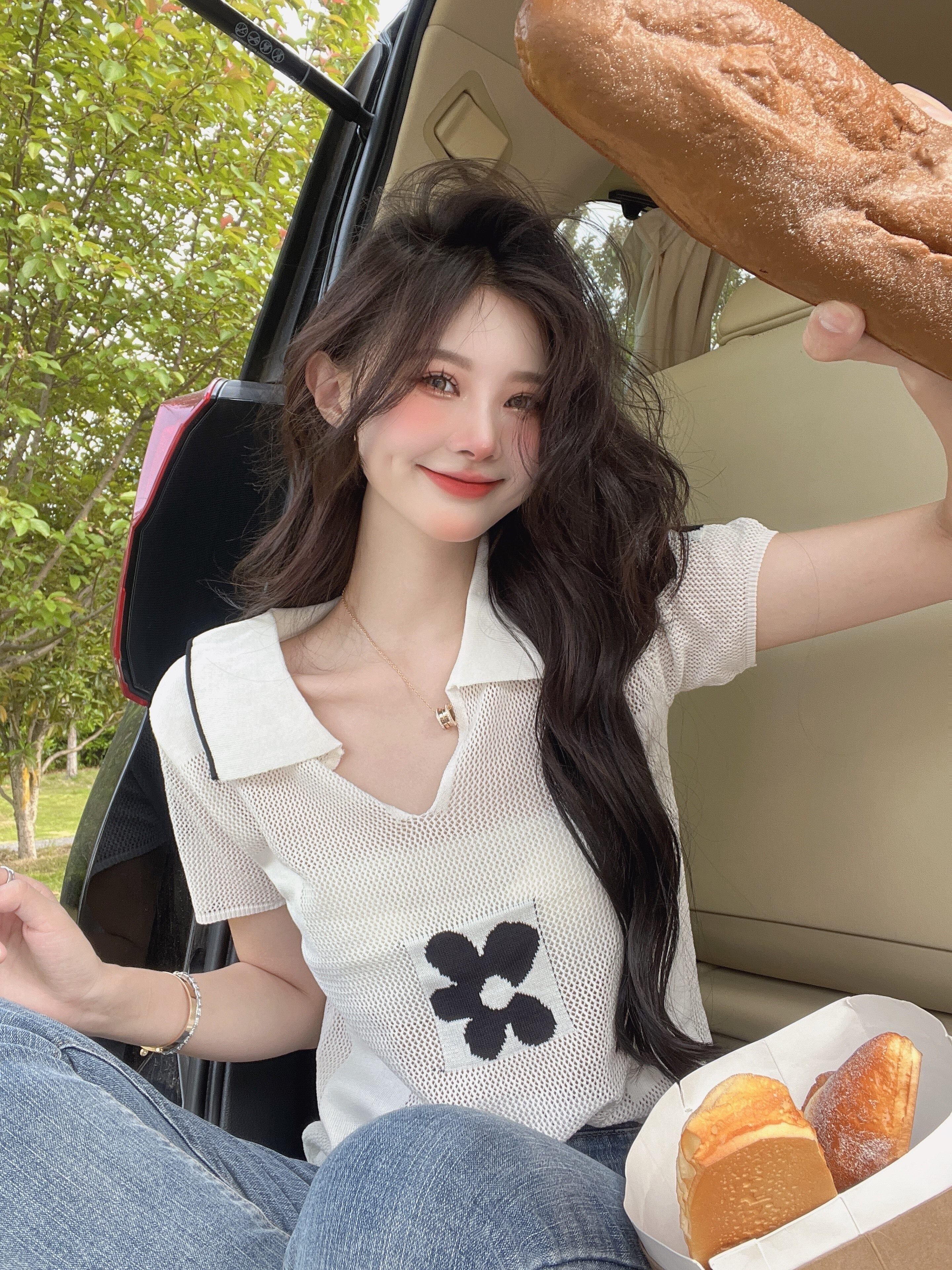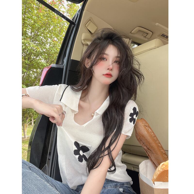 夏のシックなフレンチスタイルの小さな香りのアイスシルクニット半袖Tシャツ女性の純粋な欲望甘いショートポロシャツトップ 大人ガーリー スウィート キュート カジュアル サマー 夏物 ピュア 7460041685224630 | framboise21
