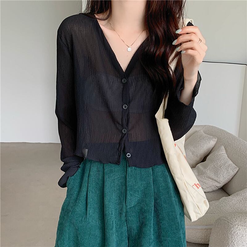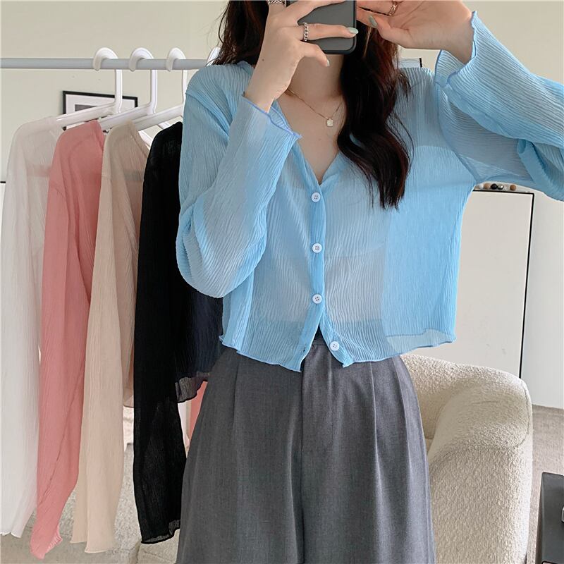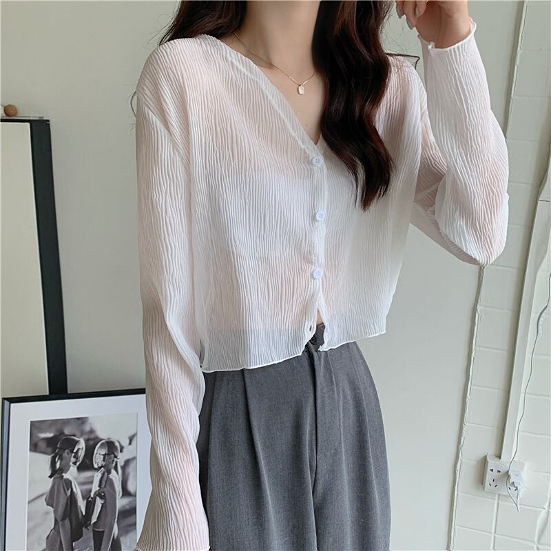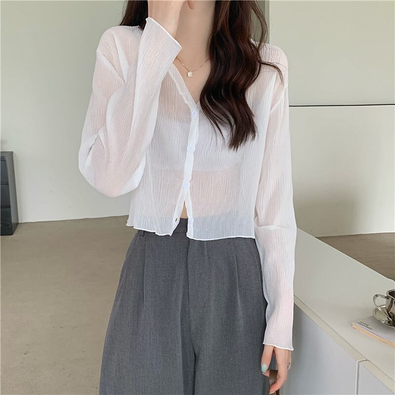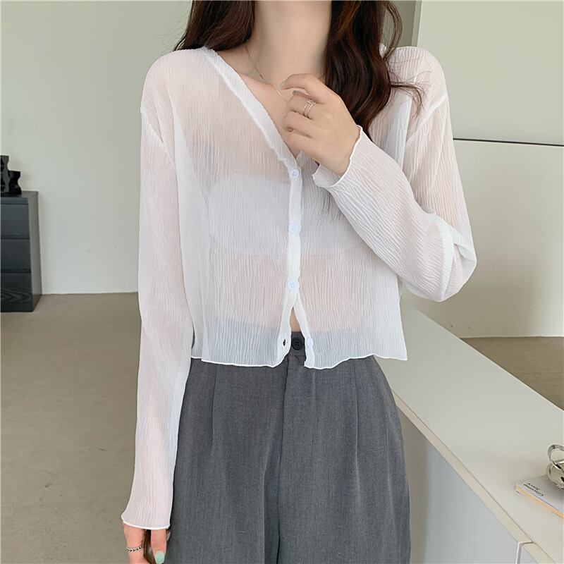 夏の白いニットの日焼け止めカーディガン薄い女性の氷の絹のブラウス ジャケット外サスペンダー付きシフォン長袖エアコン シャツ ロング ホワイト サマー 夏物 シルク 7460096336892356 | framboise21