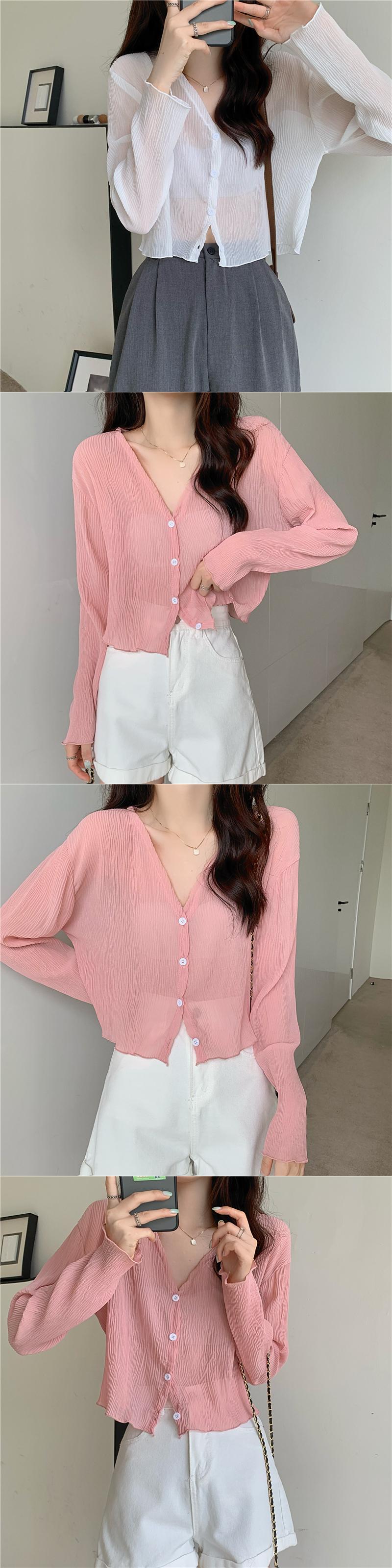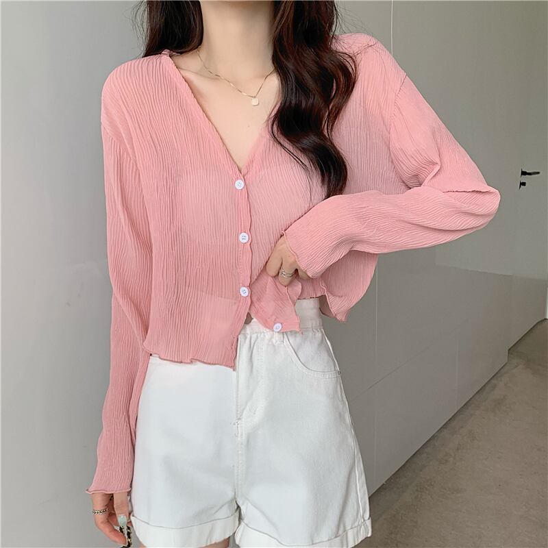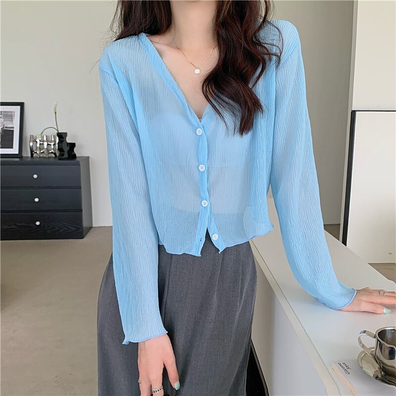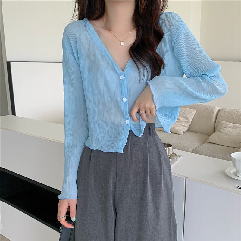 夏の白いニットの日焼け止めカーディガン薄い女性の氷の絹のブラウス ジャケット外サスペンダー付きシフォン長袖エアコン シャツ ロング ホワイト サマー 夏物 シルク 7460096336892356 | framboise21
