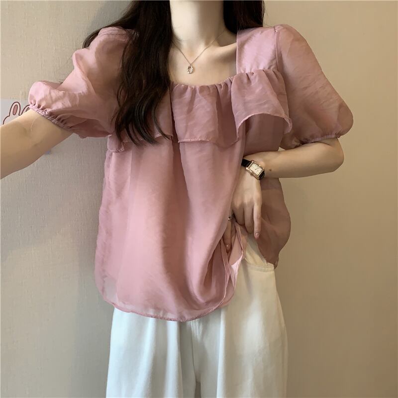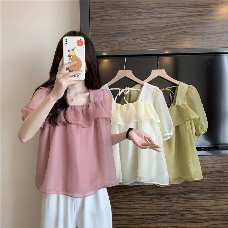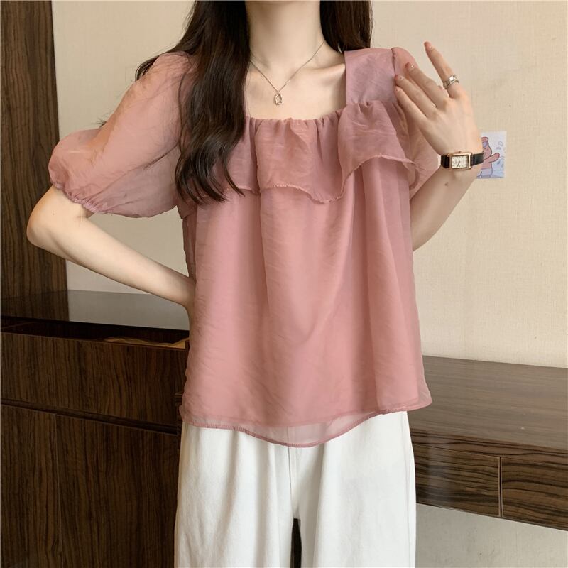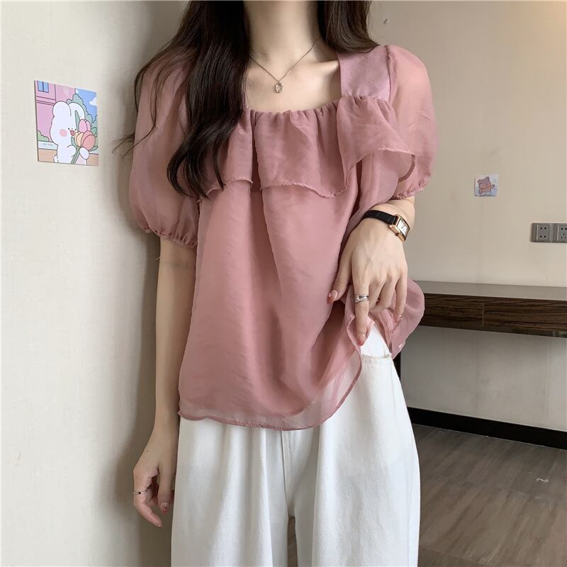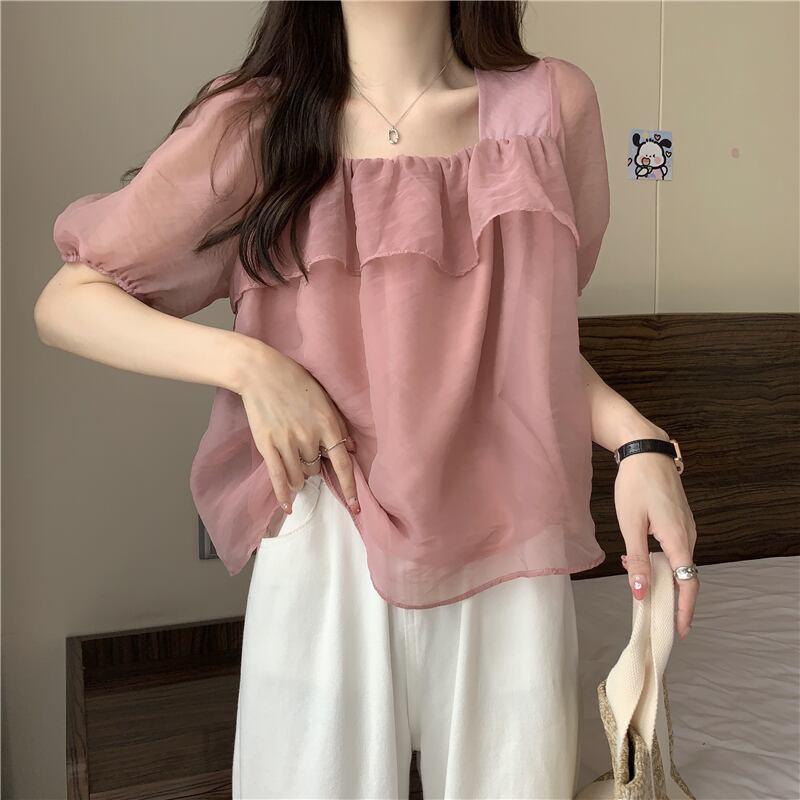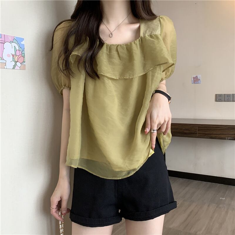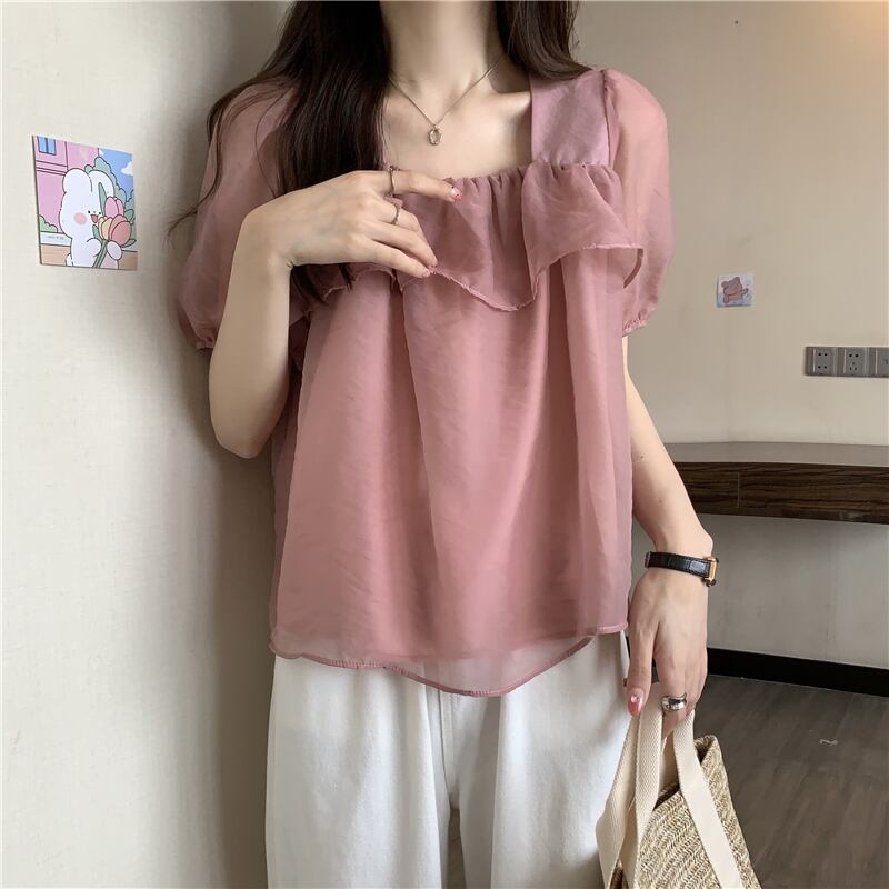 シックで美しい小さなシャツゆったりカバーベリーパフスリーブシフォントップ女性の夏のファッション気質スクエアカラー半袖シャツ サマー 夏物 スクウェア 7460032138552583 | framboise21