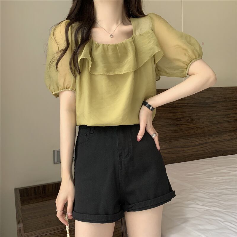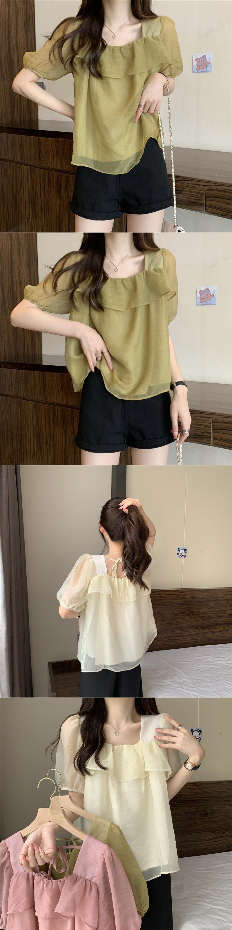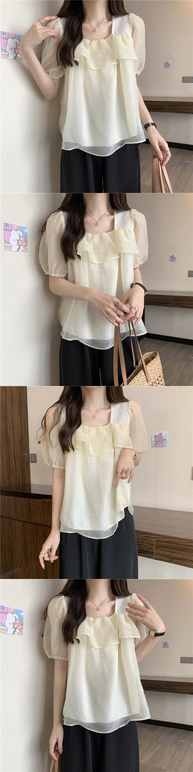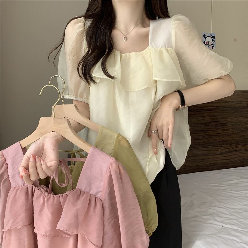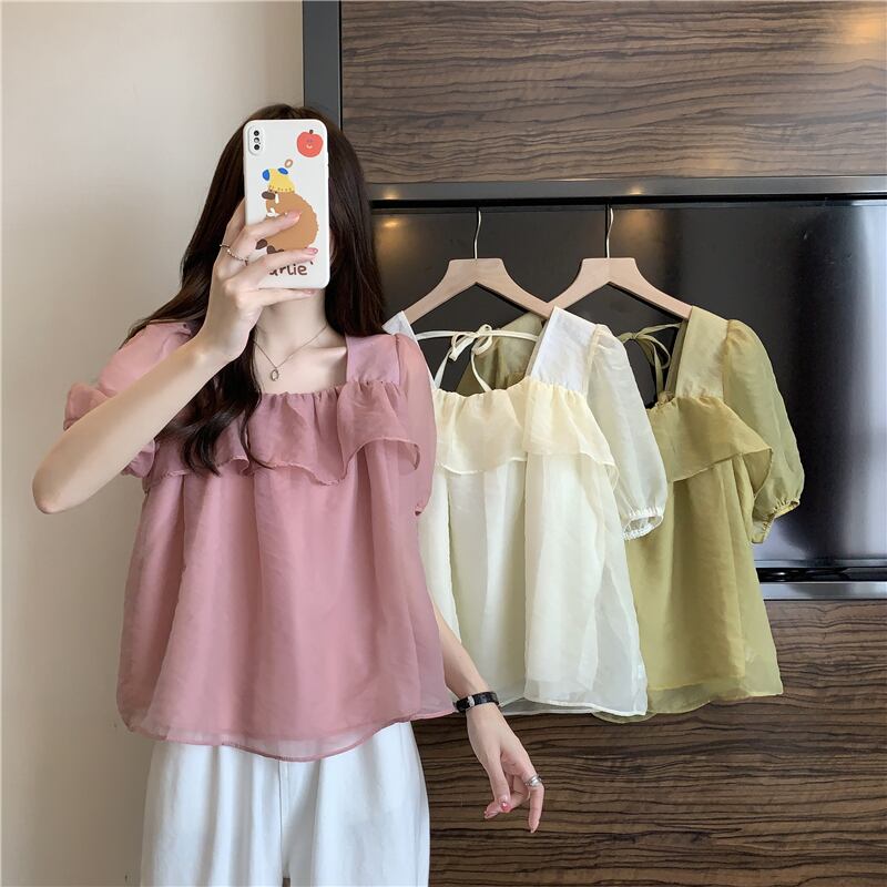 シックで美しい小さなシャツゆったりカバーベリーパフスリーブシフォントップ女性の夏のファッション気質スクエアカラー半袖シャツ サマー 夏物 スクウェア 7460032138552583 | framboise21