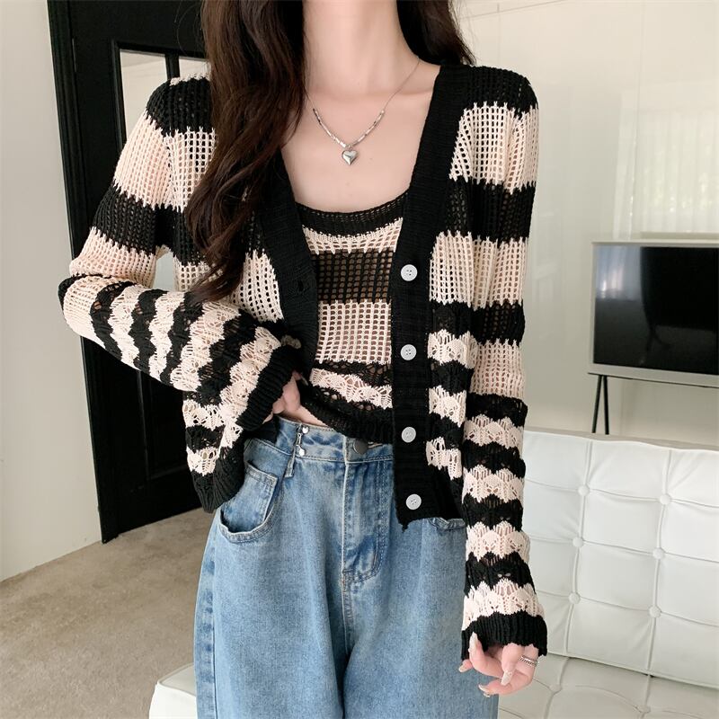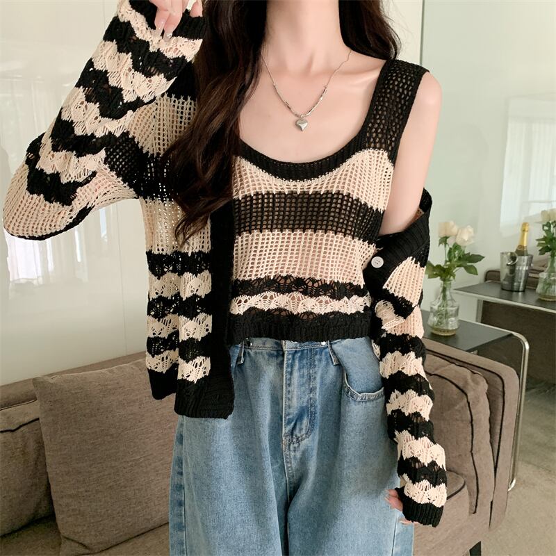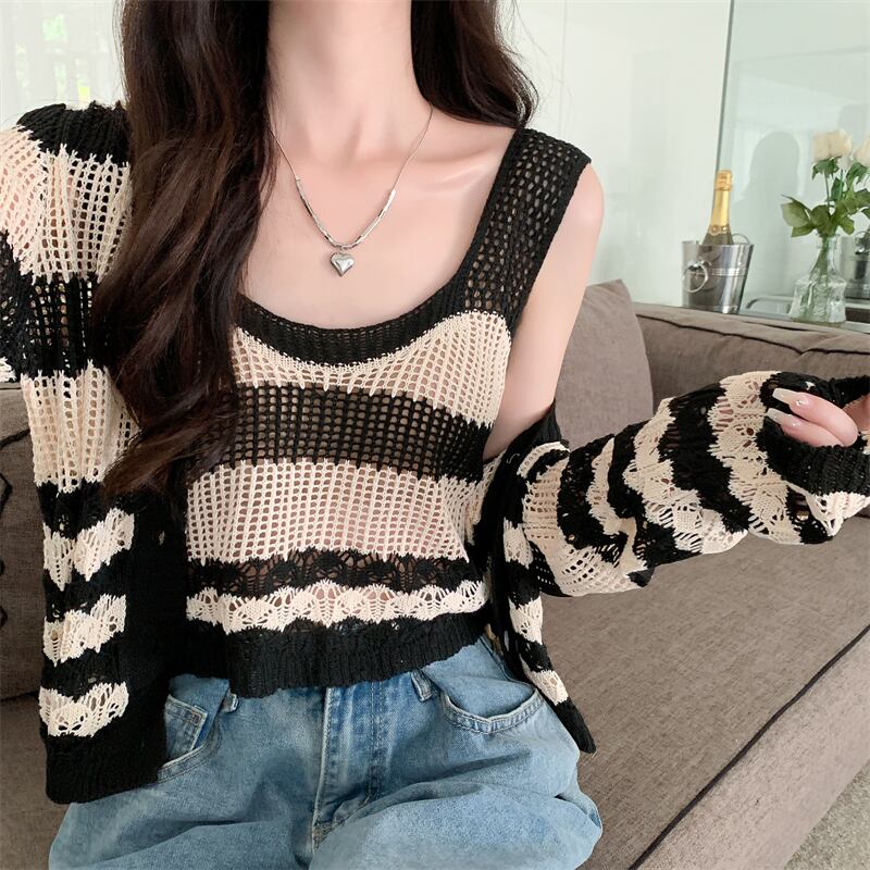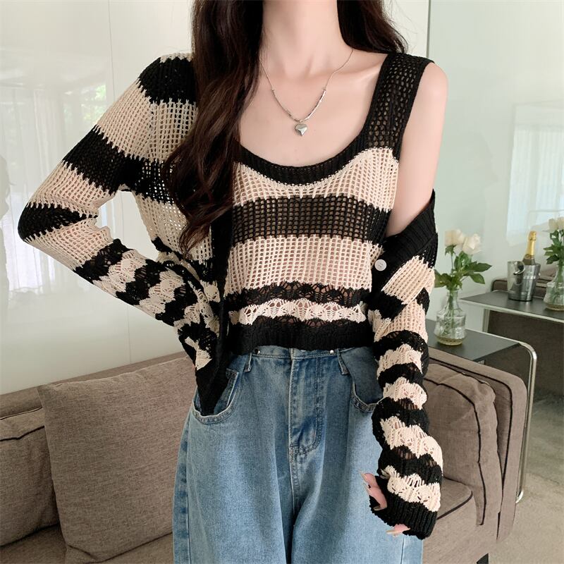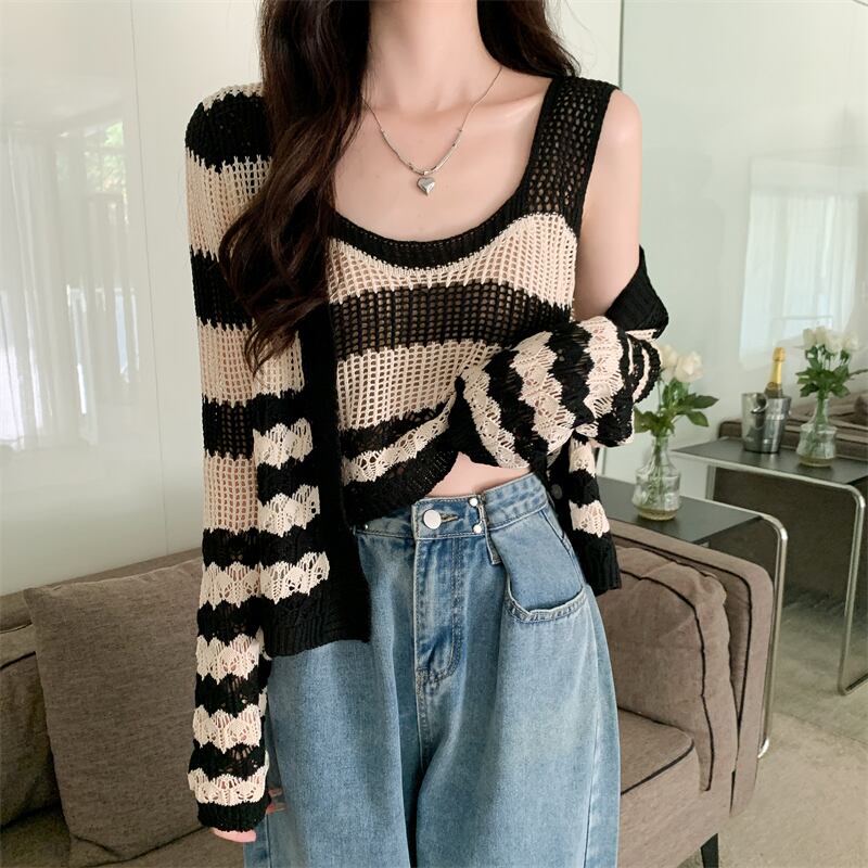 中空 日焼け止め カーディガン レディース 夏 薄手 ニット ブラウス 小さめ コート サスペンダー付き アウター 短め 冷房 シャツ 2点セット ショート サマー 夏物 7460042793178487 | framboise21