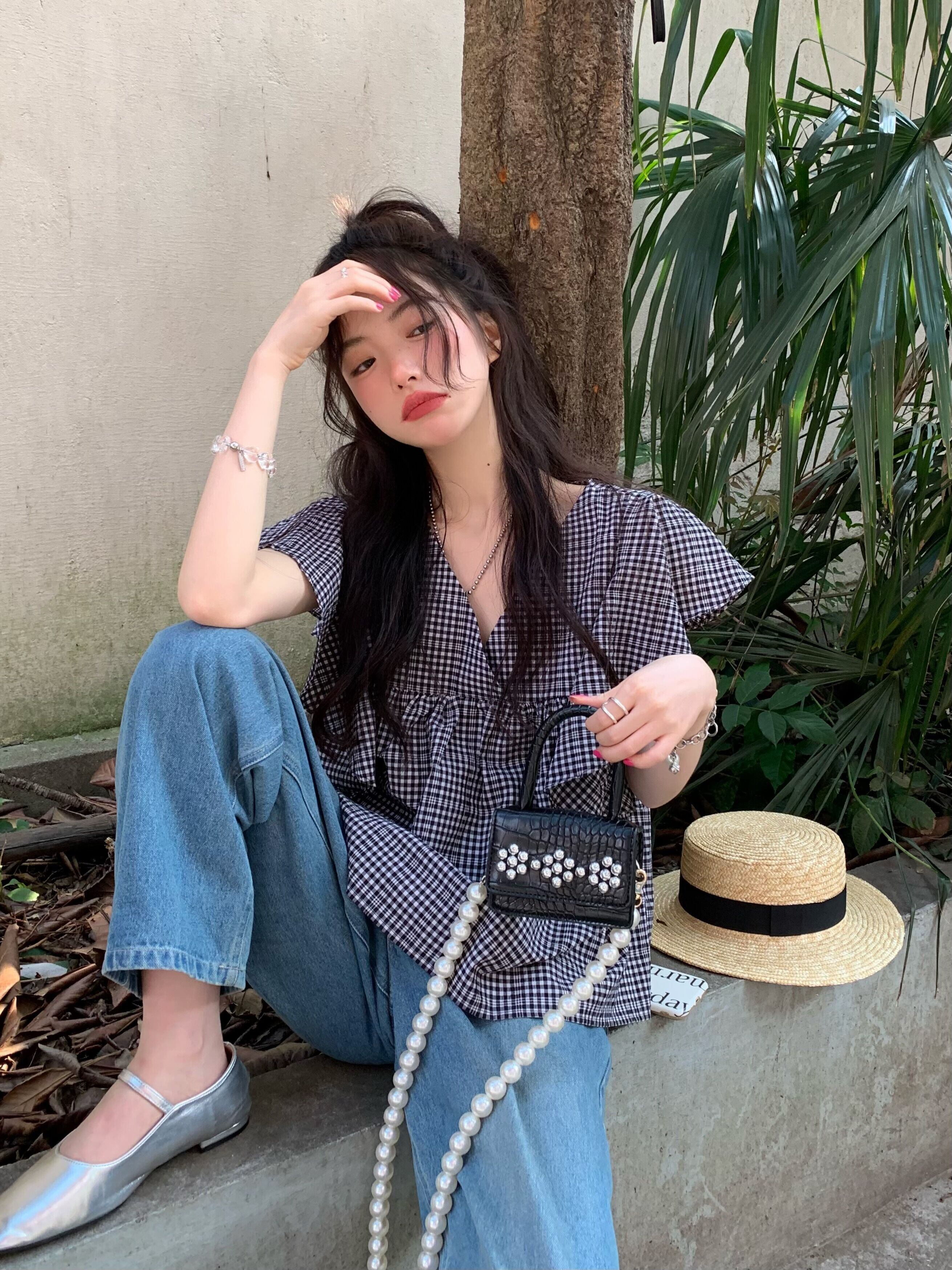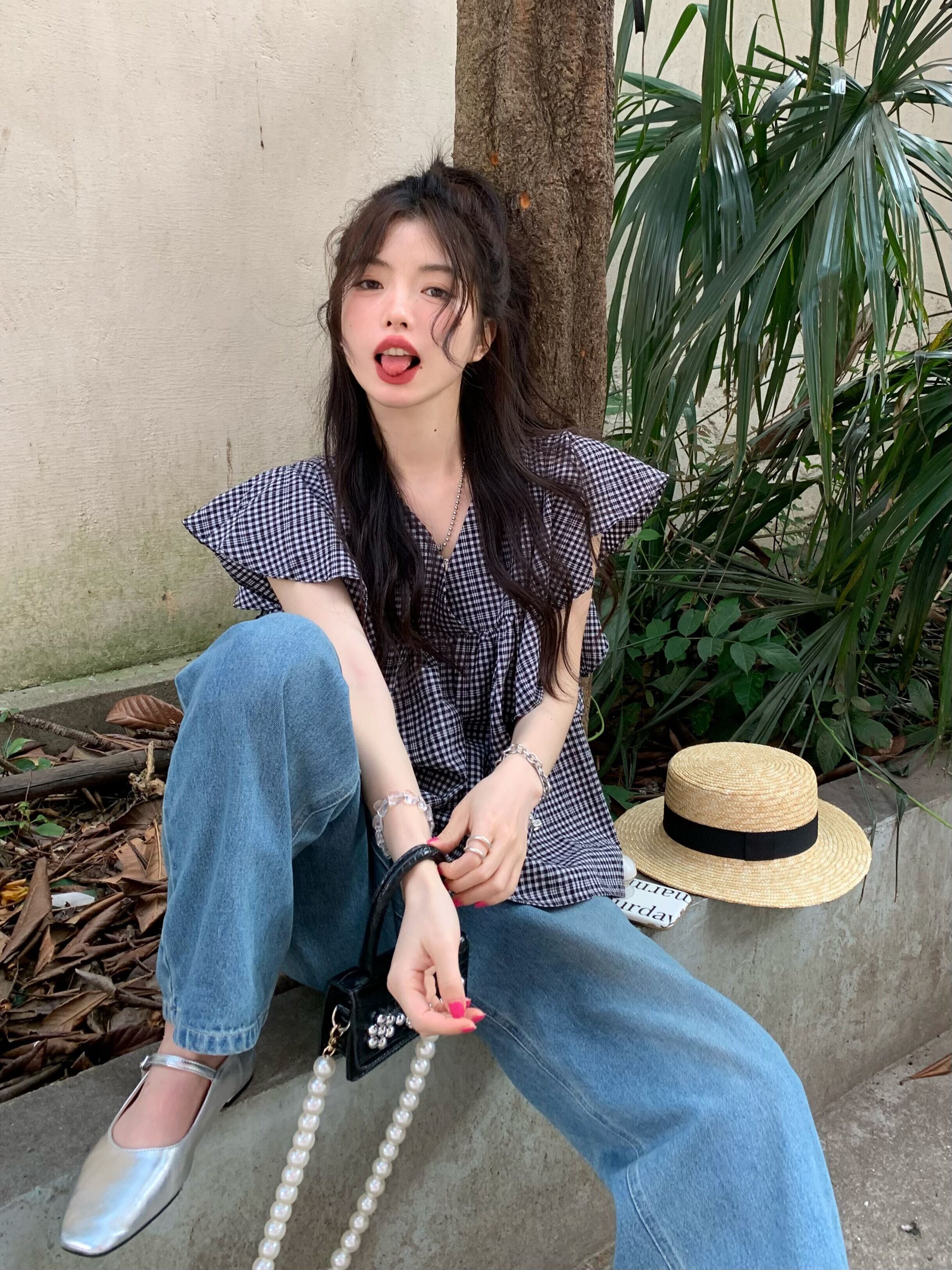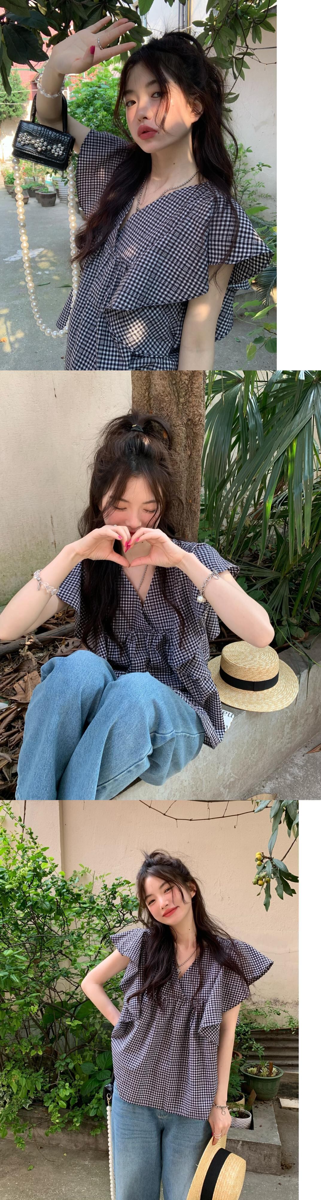 Vネックスモールフライングスリーブチェック柄シャツレディースサマーフレンチフラウンスドールシャツデザインセンスニッチバージョンスウィートトップ 大人ガーリー キュート カジュアル 夏物 7460045342448465 | framboise21