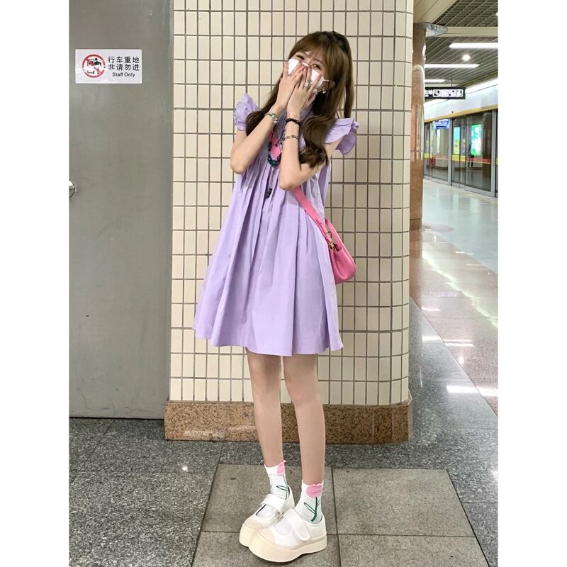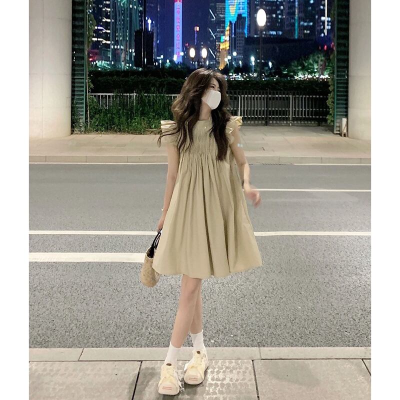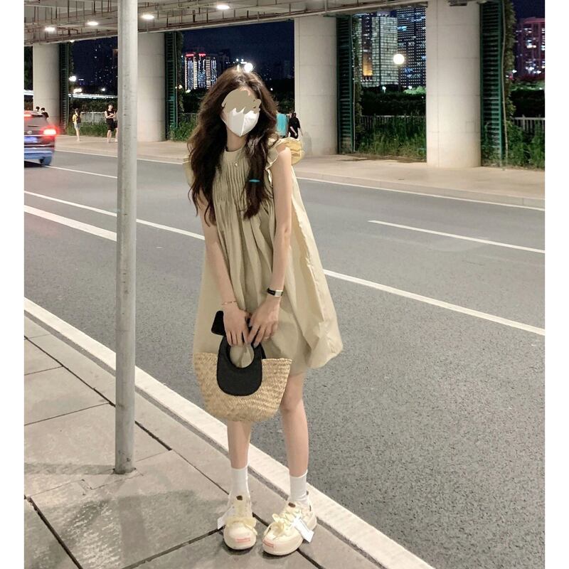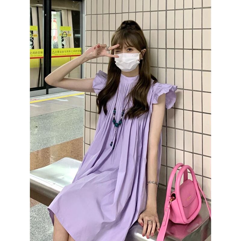 小さなフライング スリーブ アコーディオン プリーツ ドレス女性の夏の甘くてユニークなデザイン ノースリーブ ベスト スカート a ライン ミッドネック スカート 大人ガーリー スウィート キュート カジュアル サマー 夏物 Aライン 7460024079979475 | framboise21