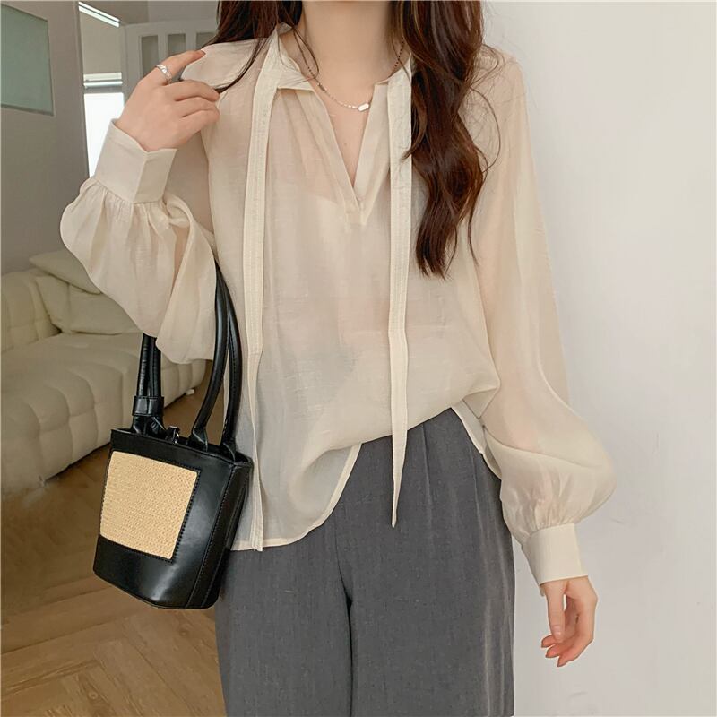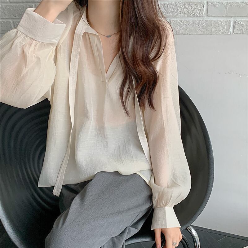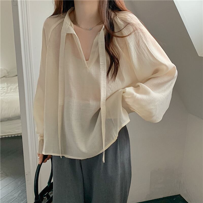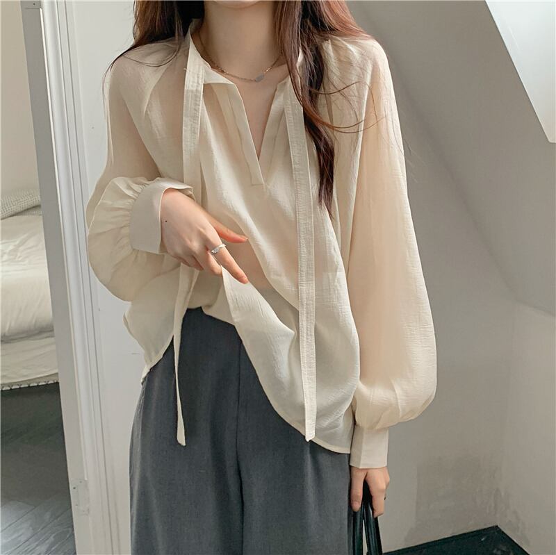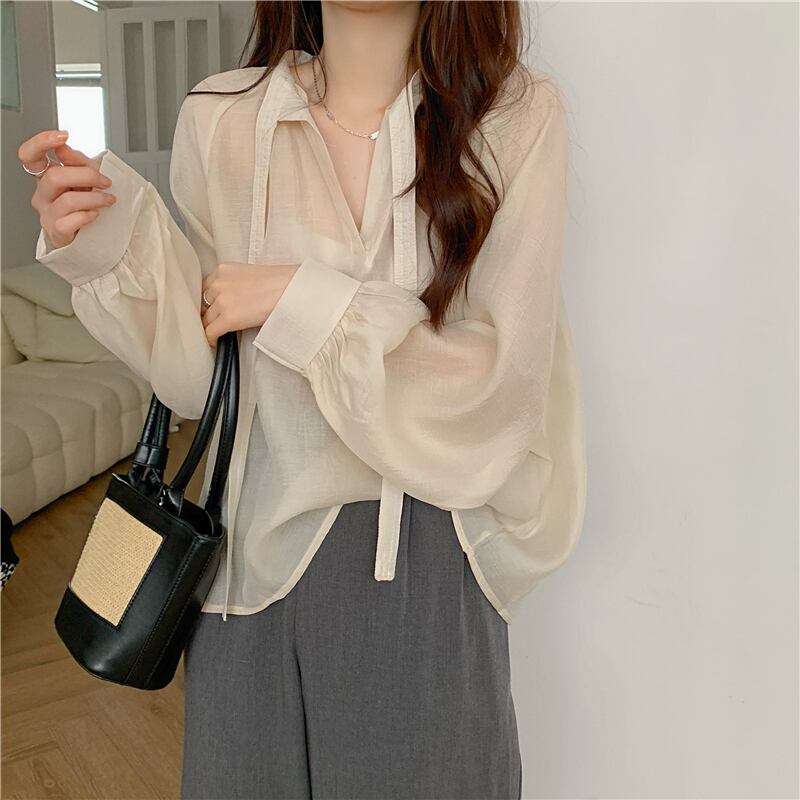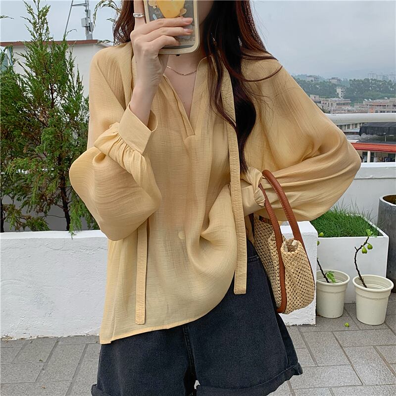 シフォン 日焼け止め レディース 夏 薄手 長袖 シャツ ニッチ デザイン ゆったり 外側 やや透け感 レースアップ トップス トレンド ロング サマー 夏物 7460031761961852 | framboise21