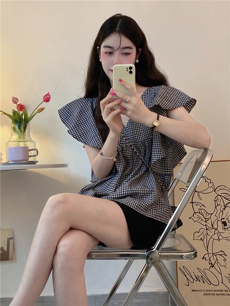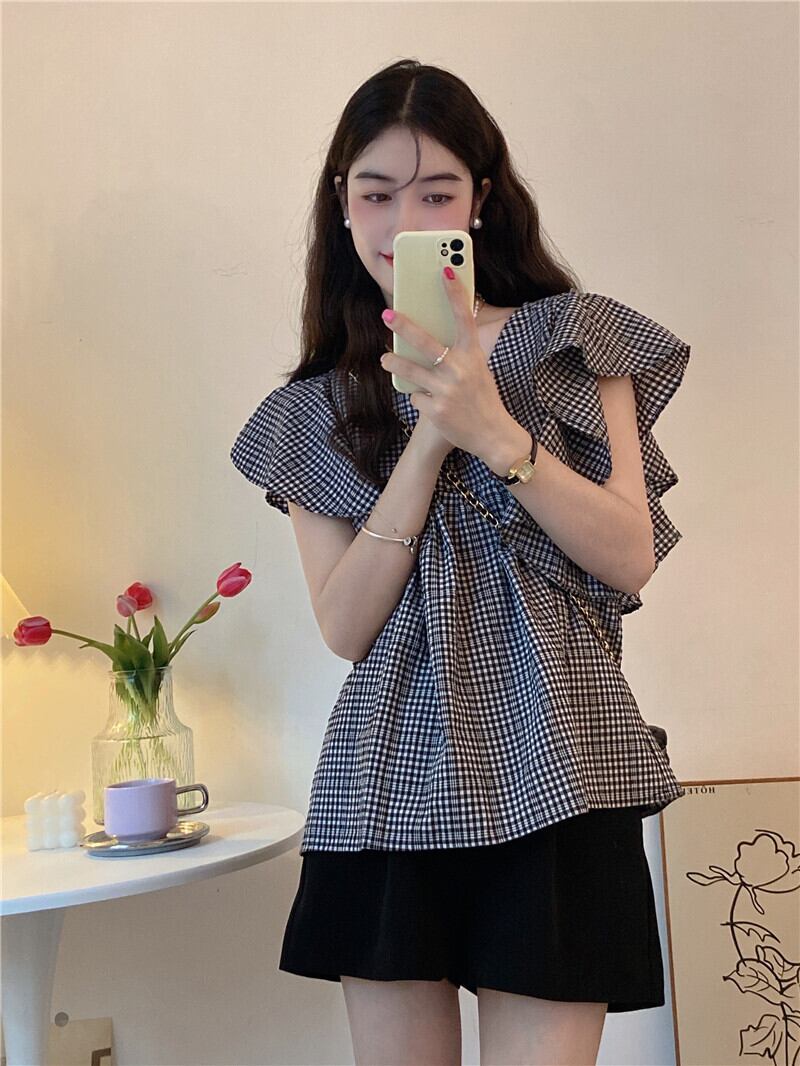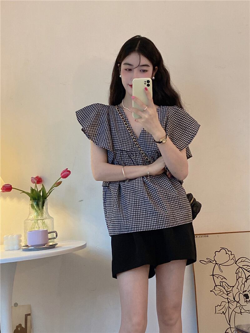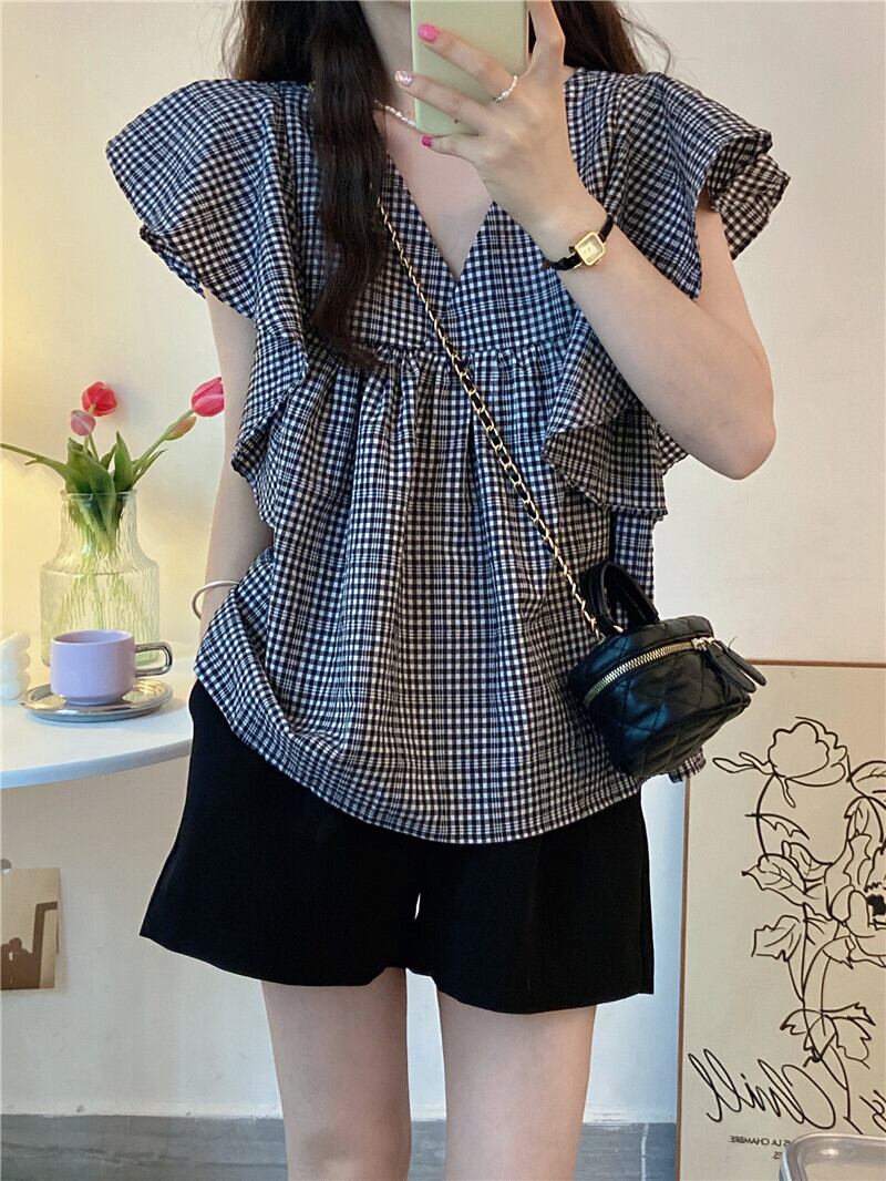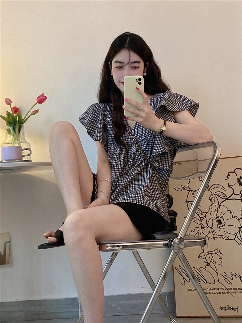 フレンチフラウンスvネックチェック柄スモールフライングスリーブトップレディースサマードールシャツノースリーブシフォンシャツシックなスウィートスモールシャツ 大人ガーリー キュート カジュアル 夏物 7460063982464973 | framboise21