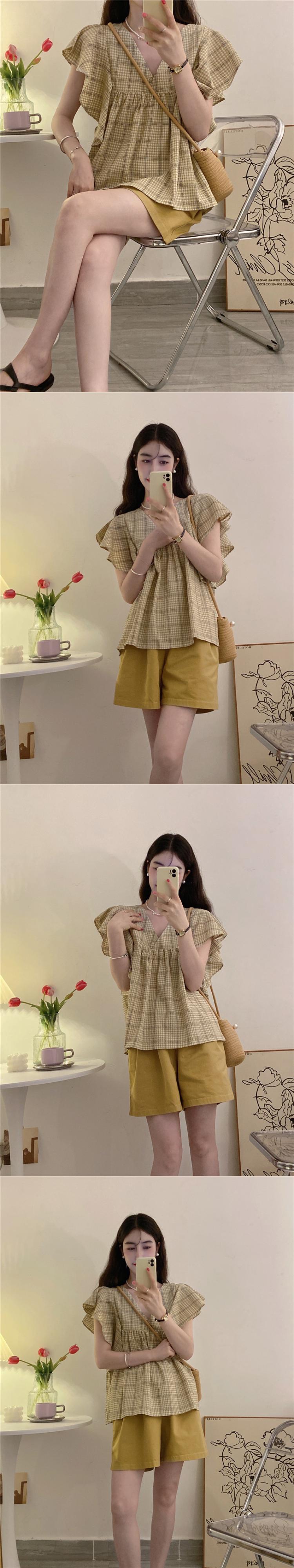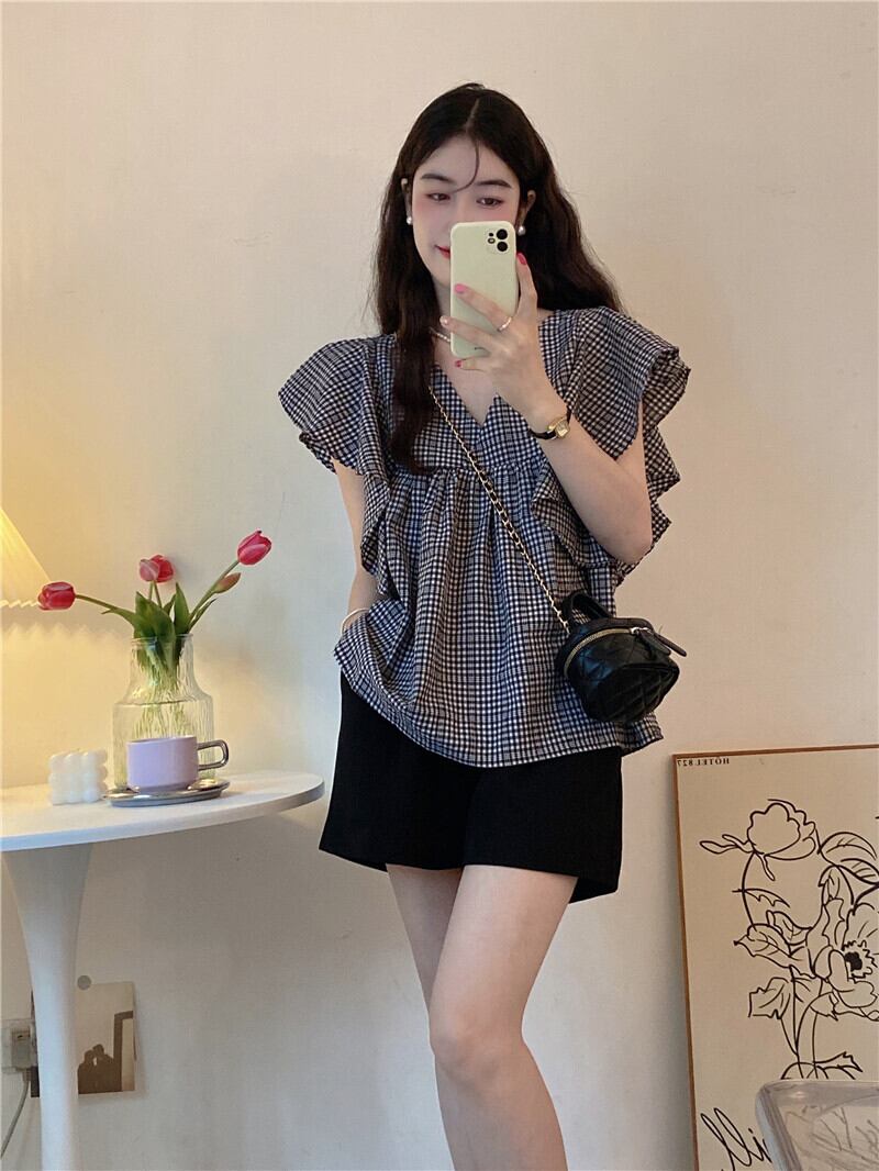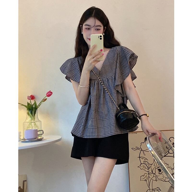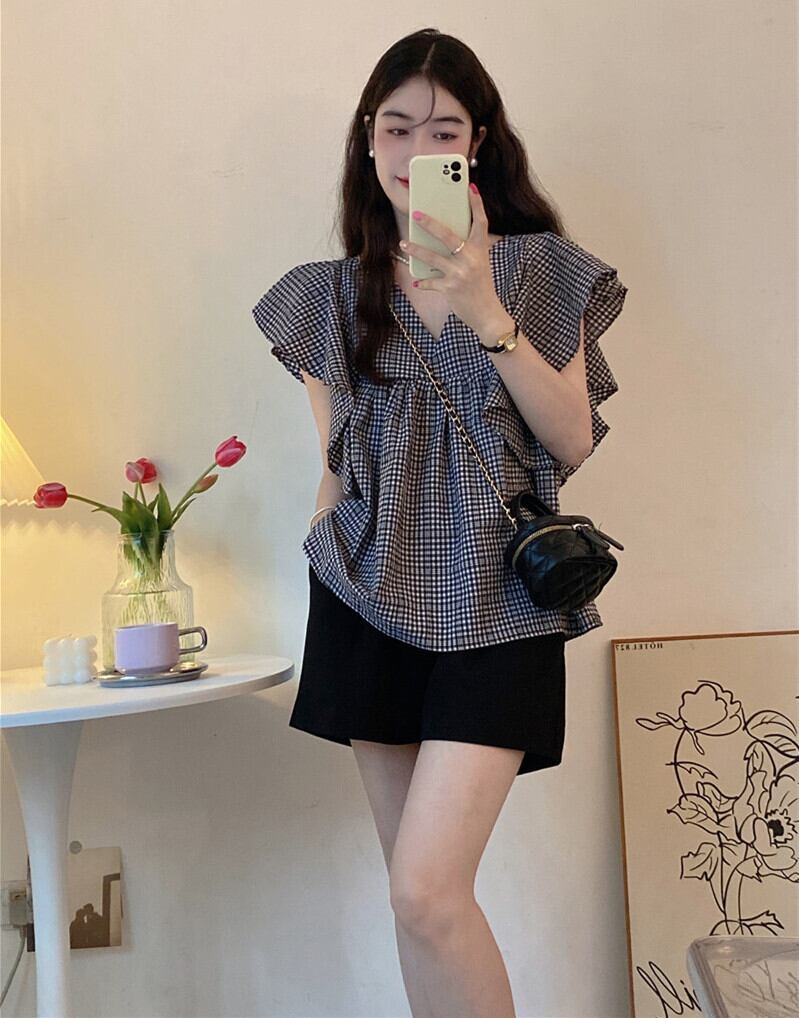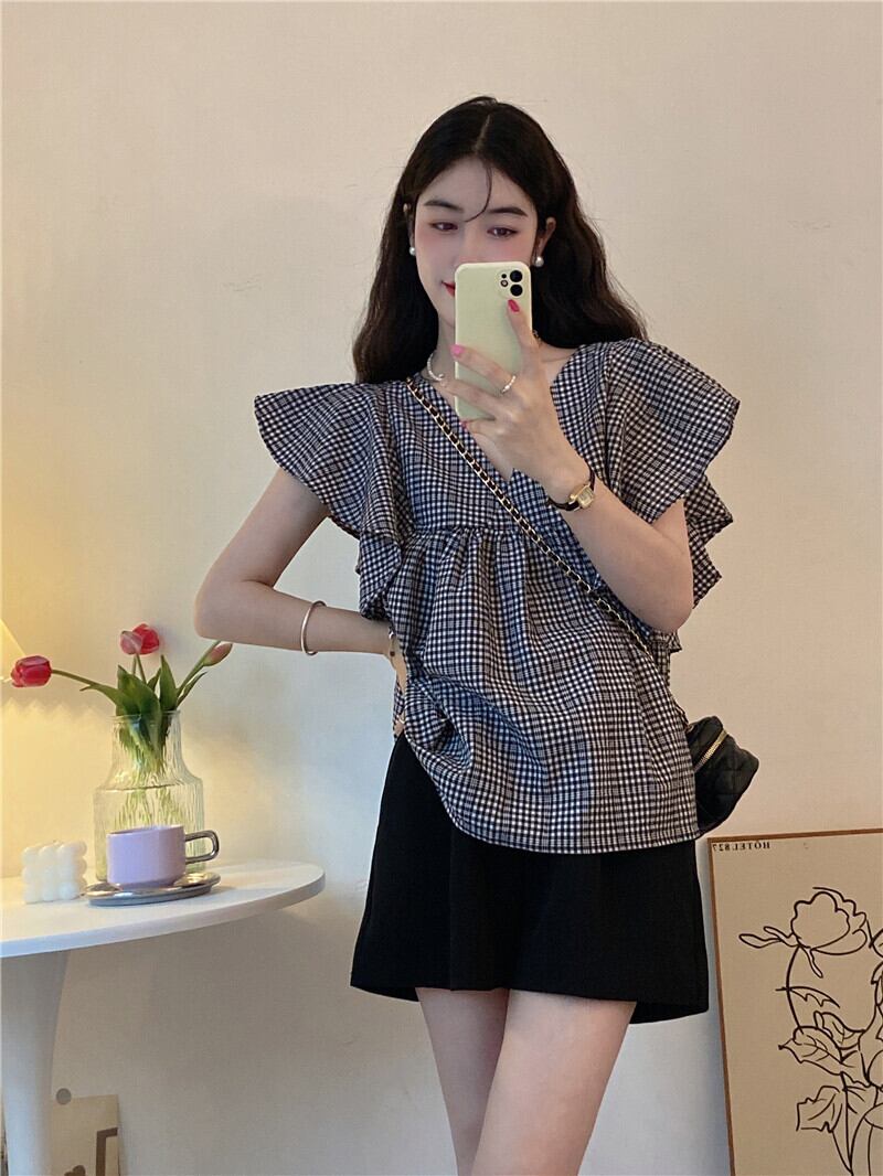 フレンチフラウンスvネックチェック柄スモールフライングスリーブトップレディースサマードールシャツノースリーブシフォンシャツシックなスウィートスモールシャツ 大人ガーリー キュート カジュアル 夏物 7460063982464973 | framboise21