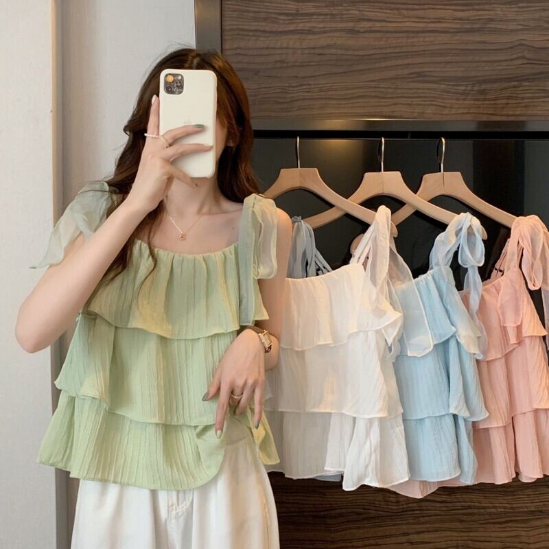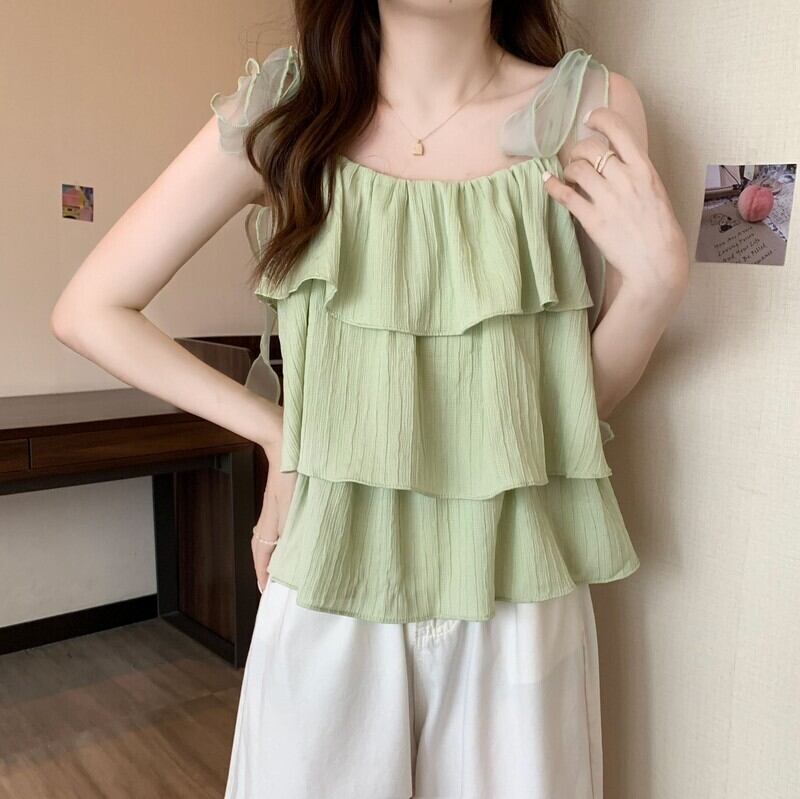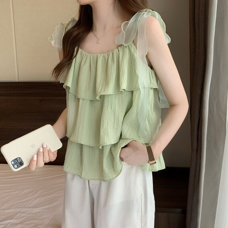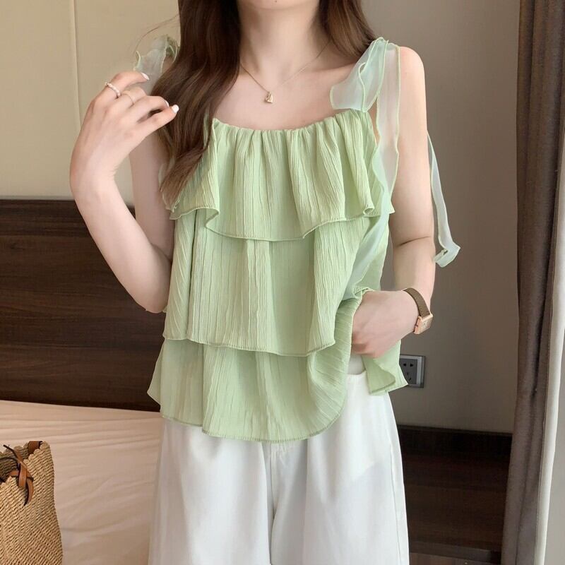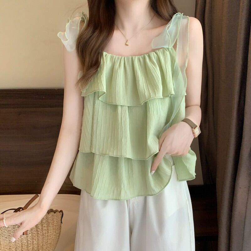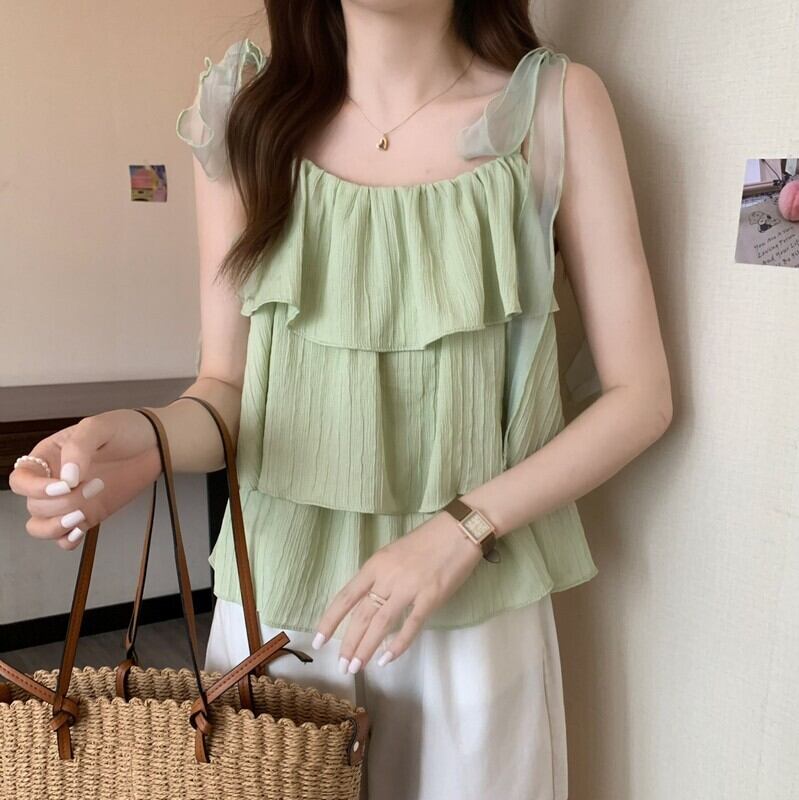 グリーンサスペンダーシフォンシャツレディースサマーデザインセンスニッチハスリーフピュアスイートウィンドノースリーブトップベビーシャツ 大人ガーリー スウィート キュート カジュアル 夏物 7460090499774204 | framboise21