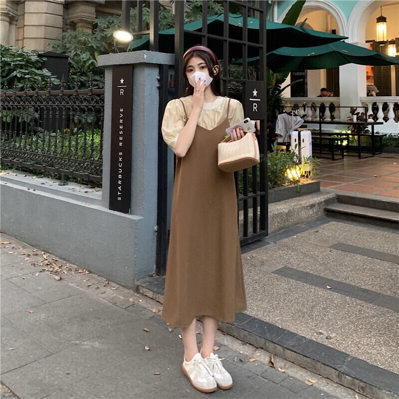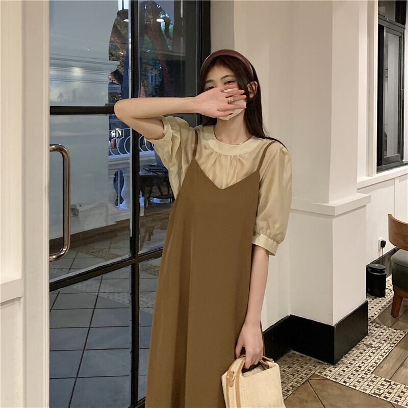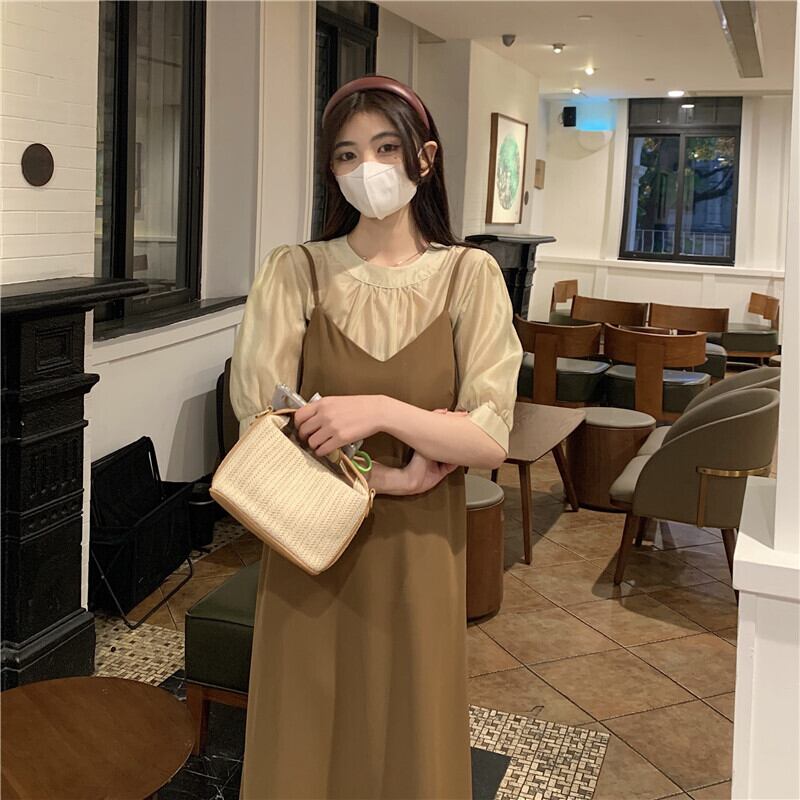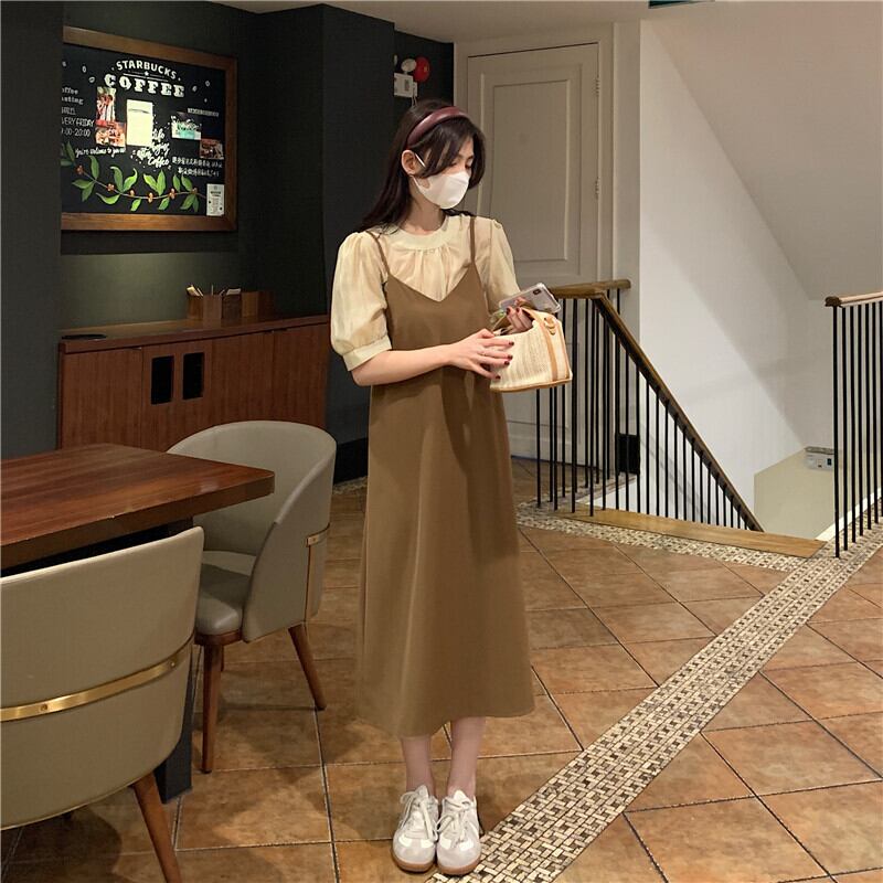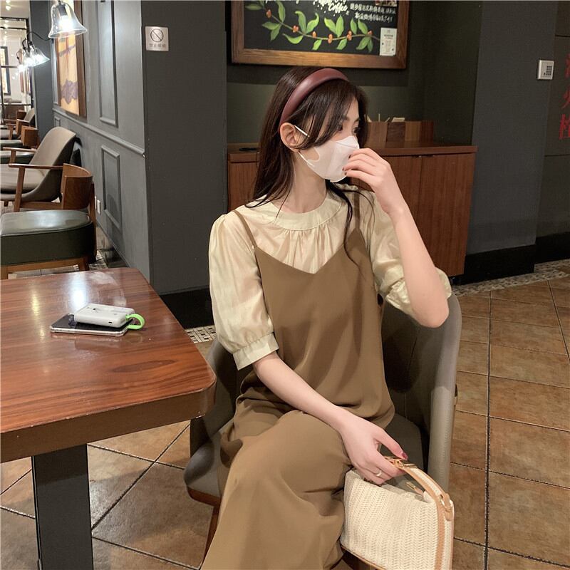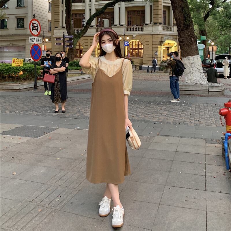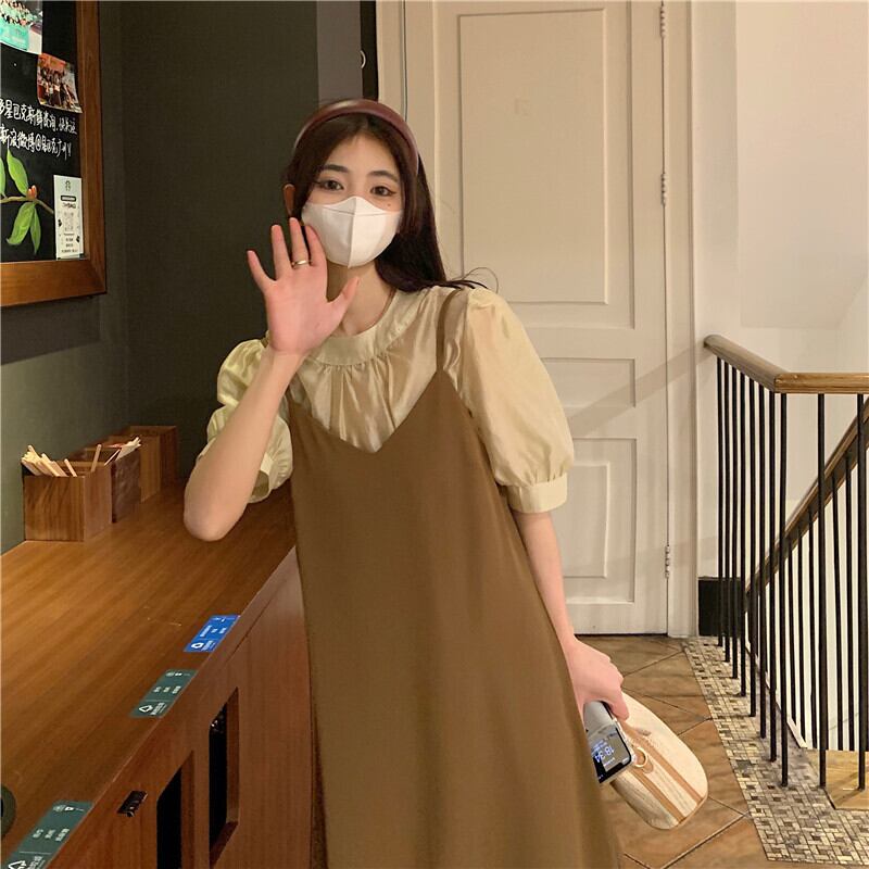 2022 新夏パフスリーブトップサスペンダードレスツーピースレトロ無地女性のハイウエストルーズミディスカート ハイウェスト サマー 夏物 ソリッドカラー 7460049773130532 | framboise21