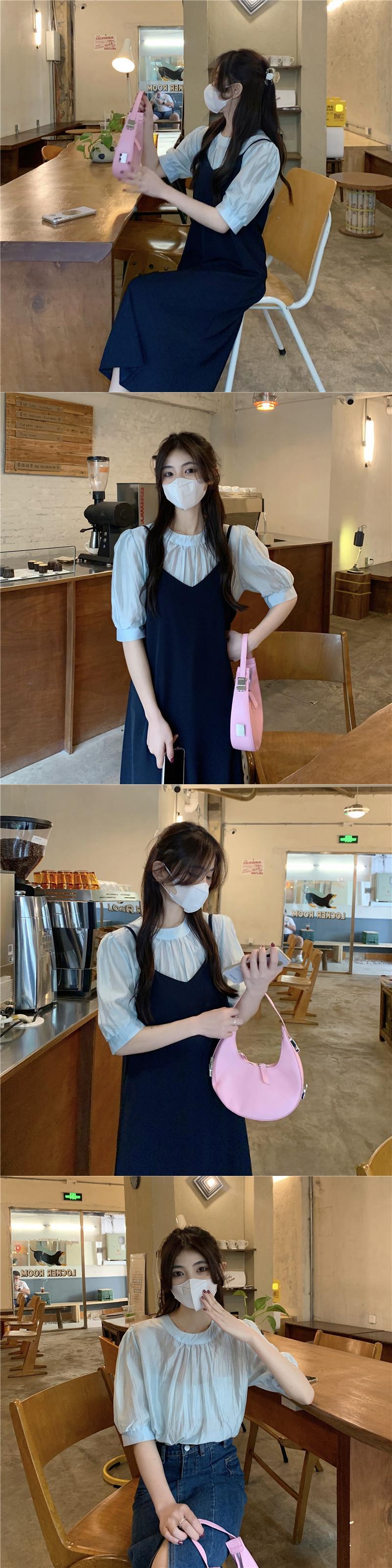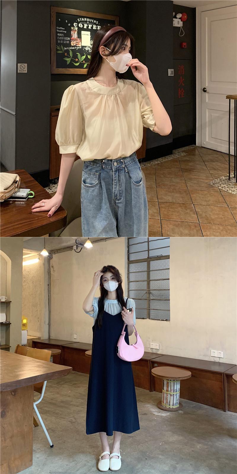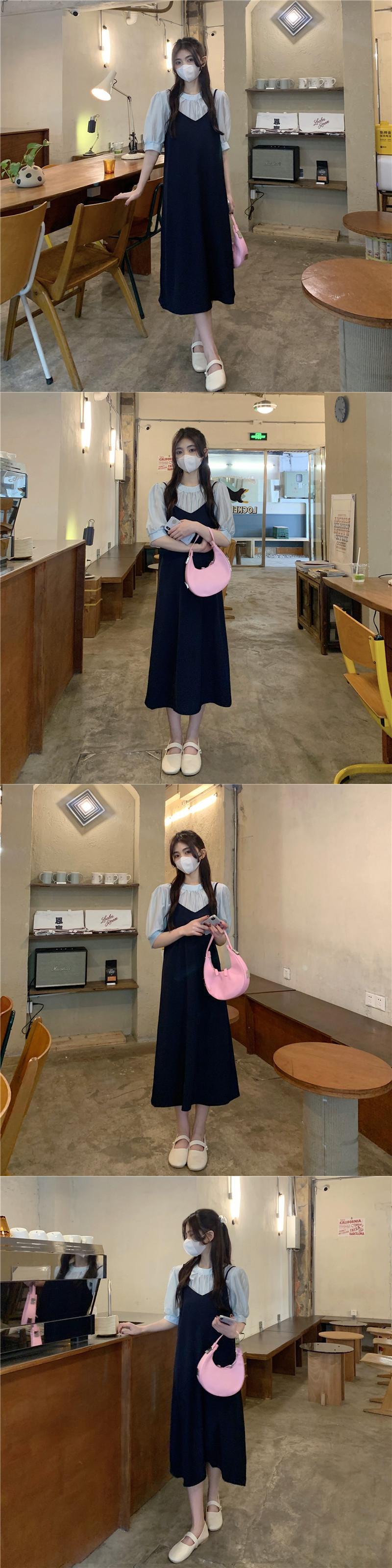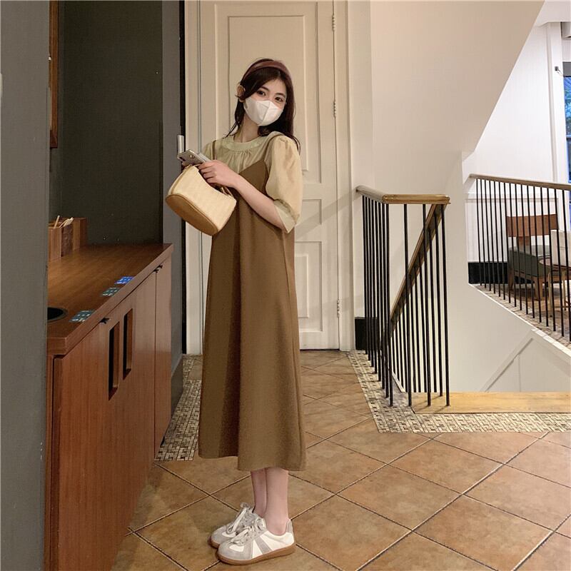 2022 新夏パフスリーブトップサスペンダードレスツーピースレトロ無地女性のハイウエストルーズミディスカート ハイウェスト サマー 夏物 ソリッドカラー 7460049773130532 | framboise21