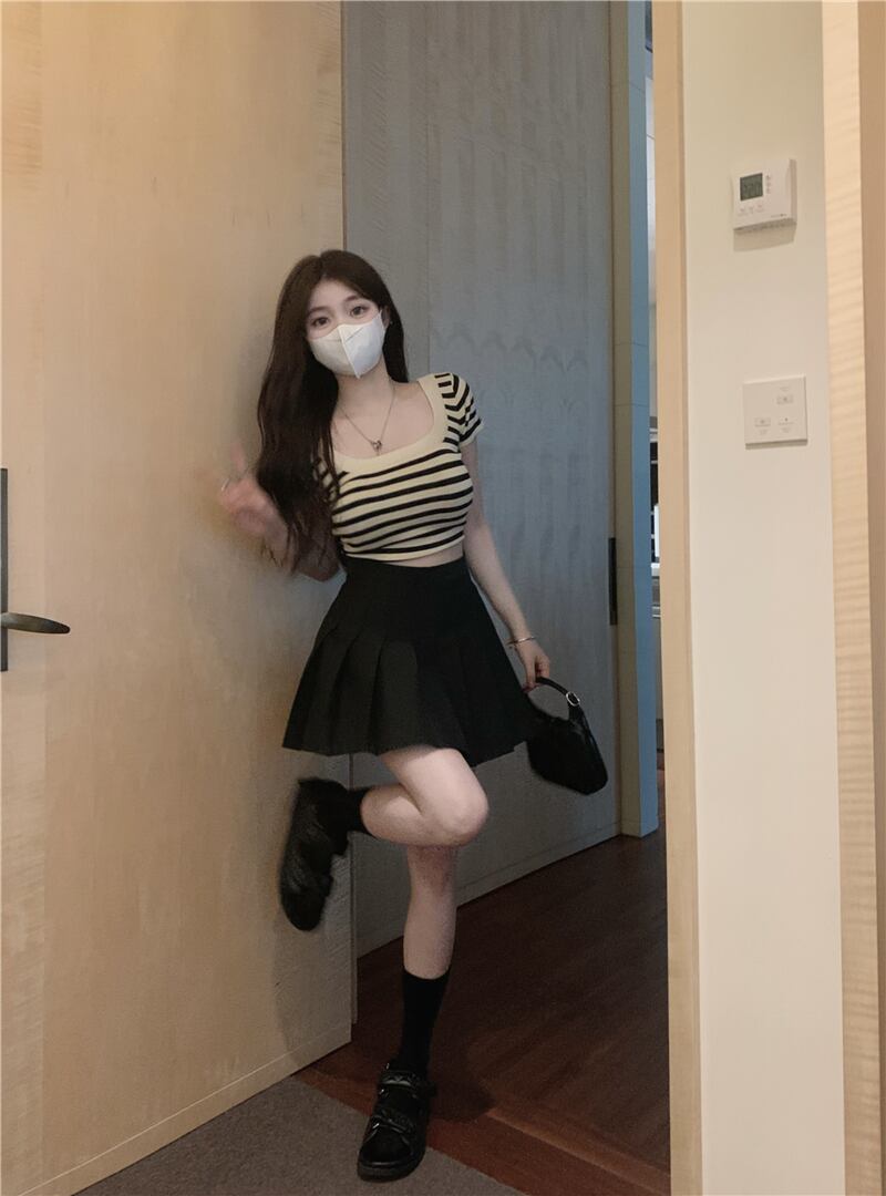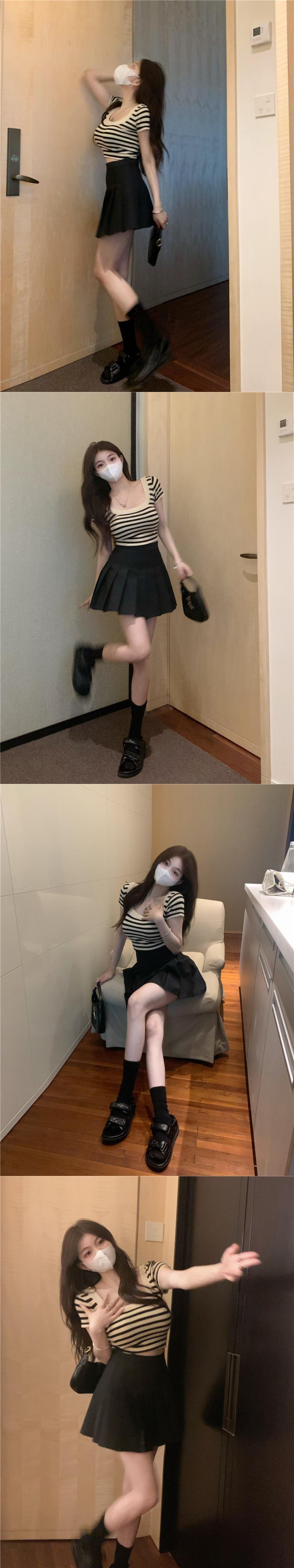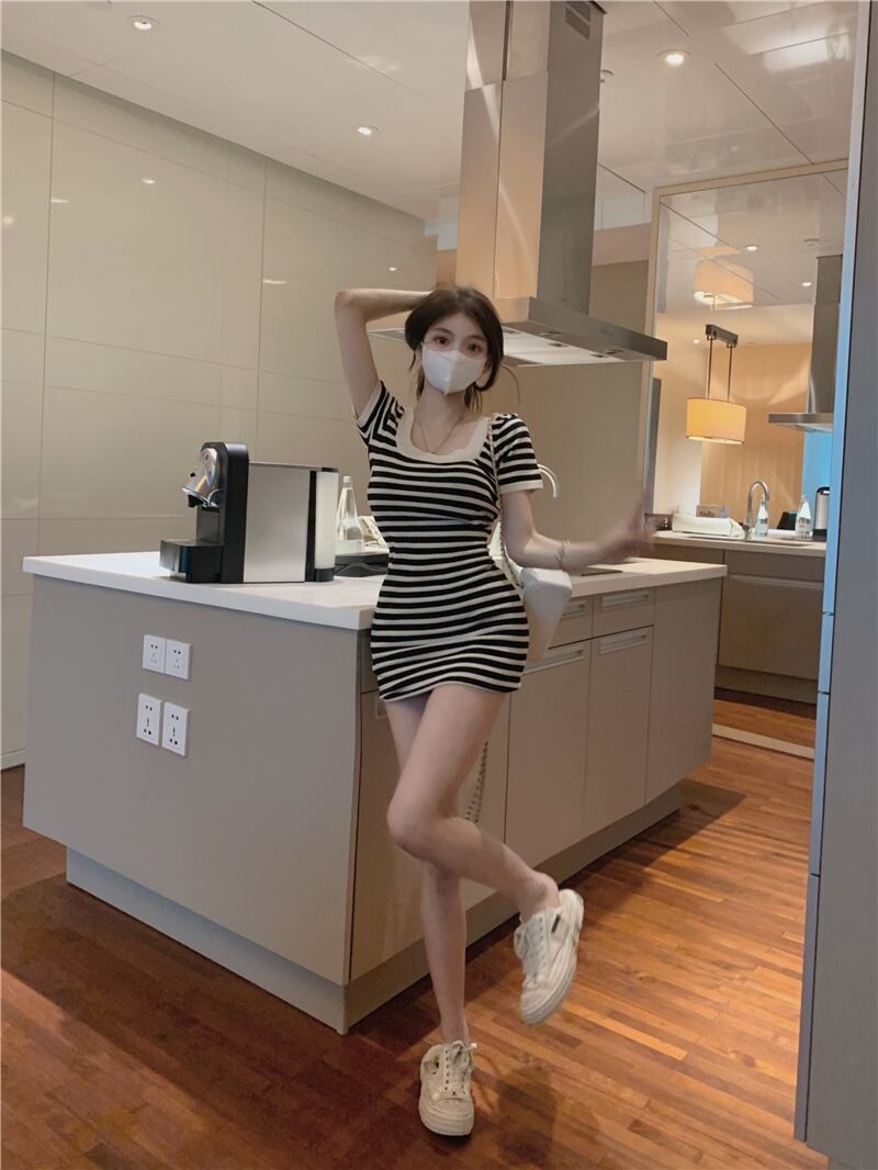 ホットレトロストライプスクエアネックドレス女性の夏のニッチデザインスリムスリムスカート純粋な欲望パッケージヒップスカート サマー 夏物 ピュア スクウェア 7460040269643435 | framboise21
