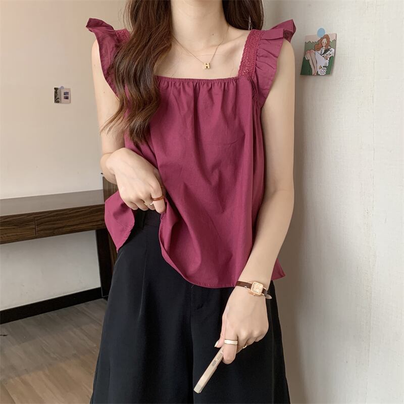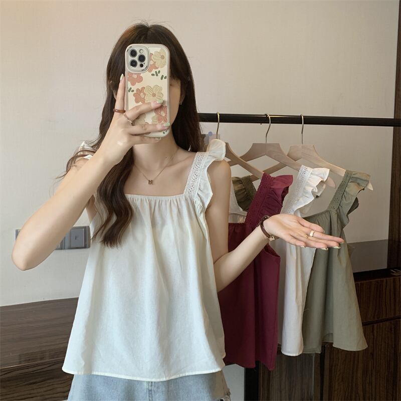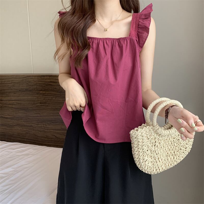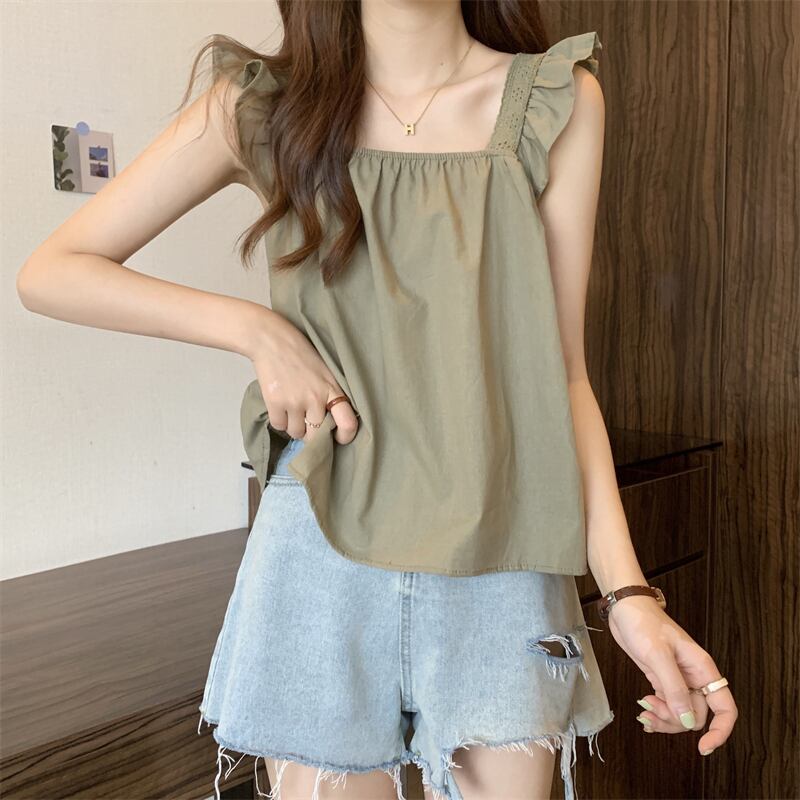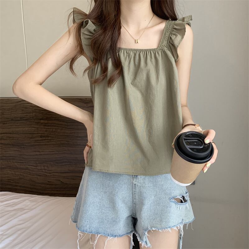 ベビーシャツフレンチスクエアカラーノースリーブシャツ女性の夏のユニークなデザインシックな見事なサスペンダーショートスモールフライングスリーブトップ サマー 夏物 スクウェア 7460052542816806 | framboise21