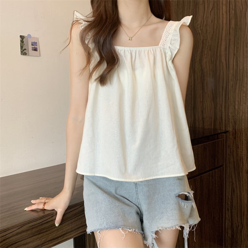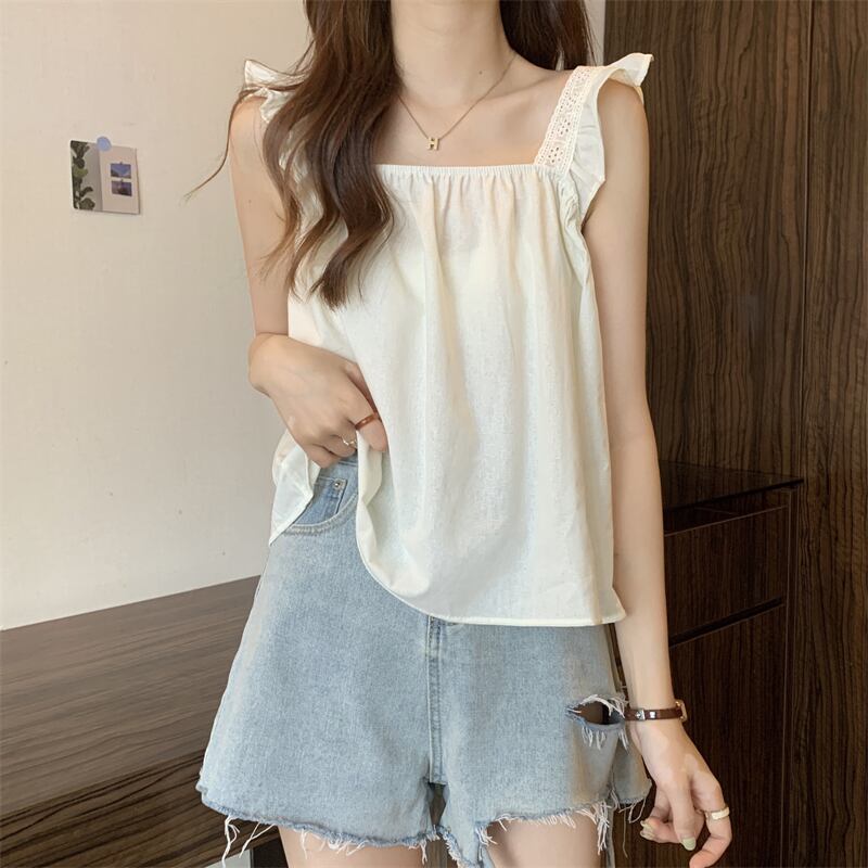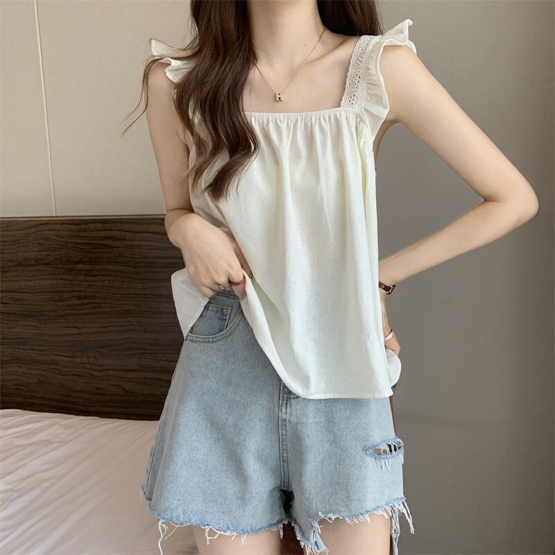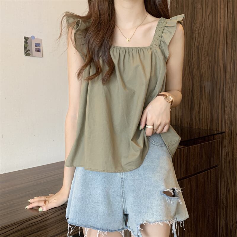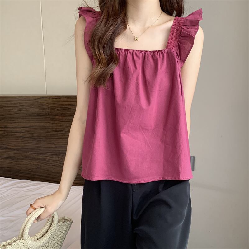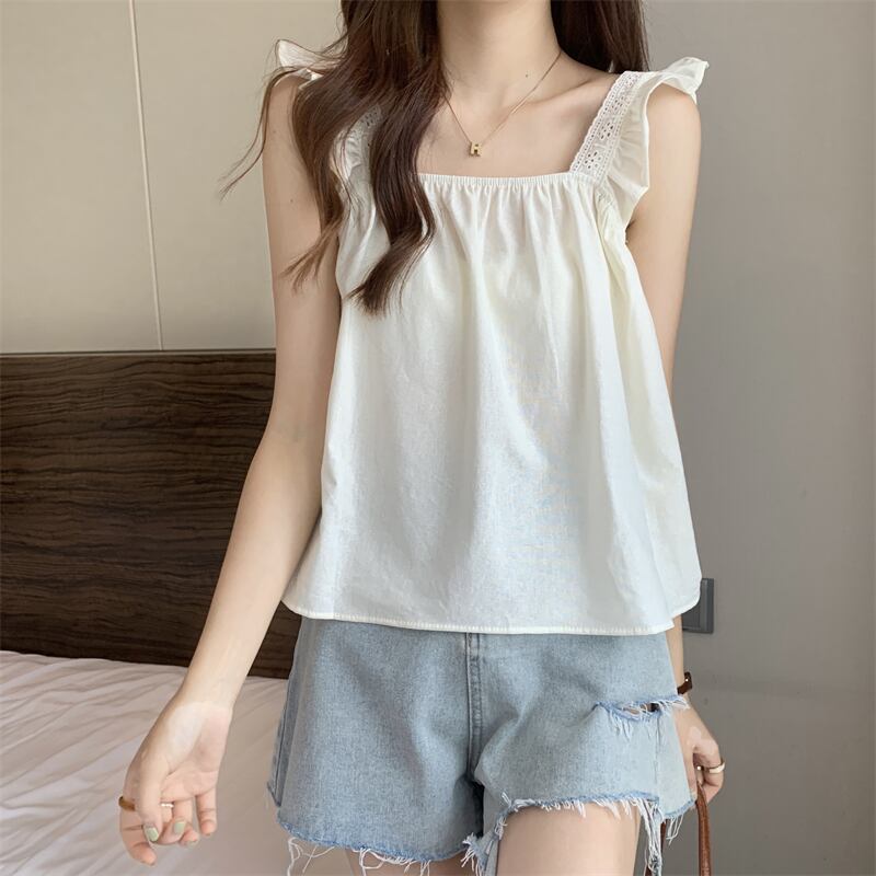ベビーシャツフレンチスクエアカラーノースリーブシャツ女性の夏のユニークなデザインシックな見事なサスペンダーショートスモールフライングスリーブトップ サマー 夏物 スクウェア 7460052542816806 | framboise21