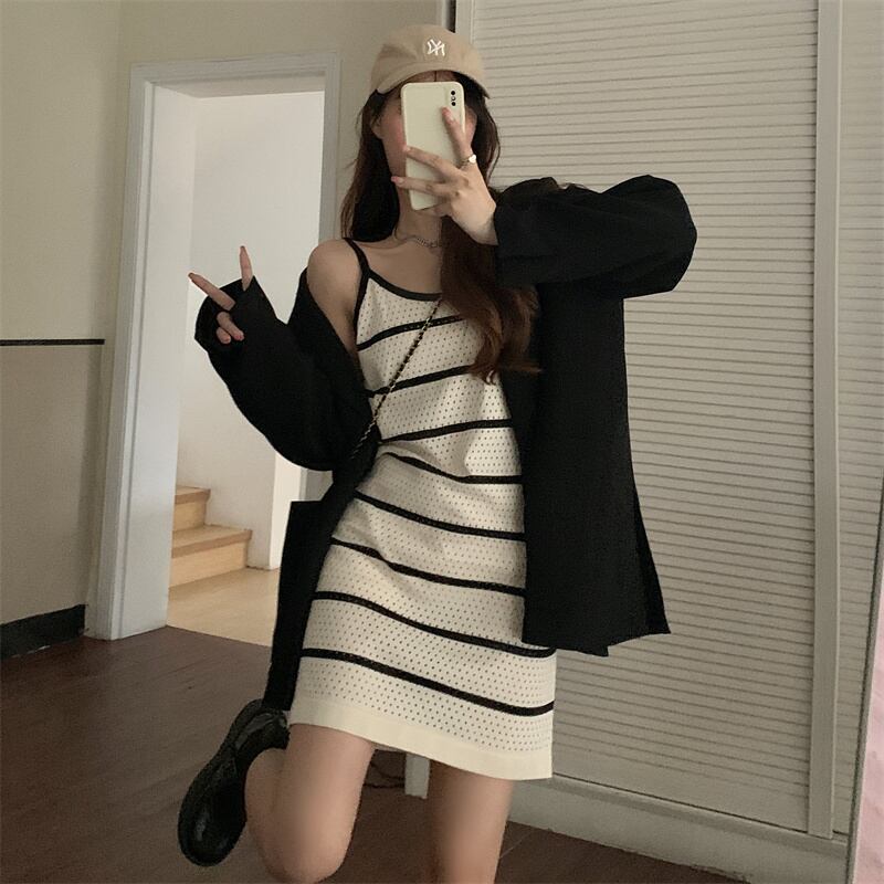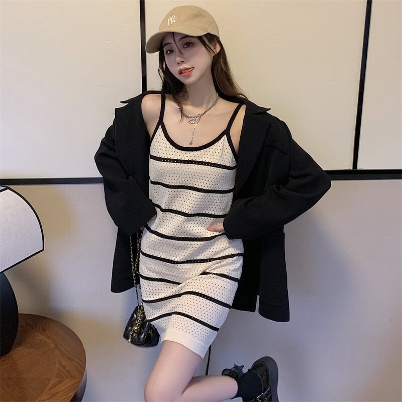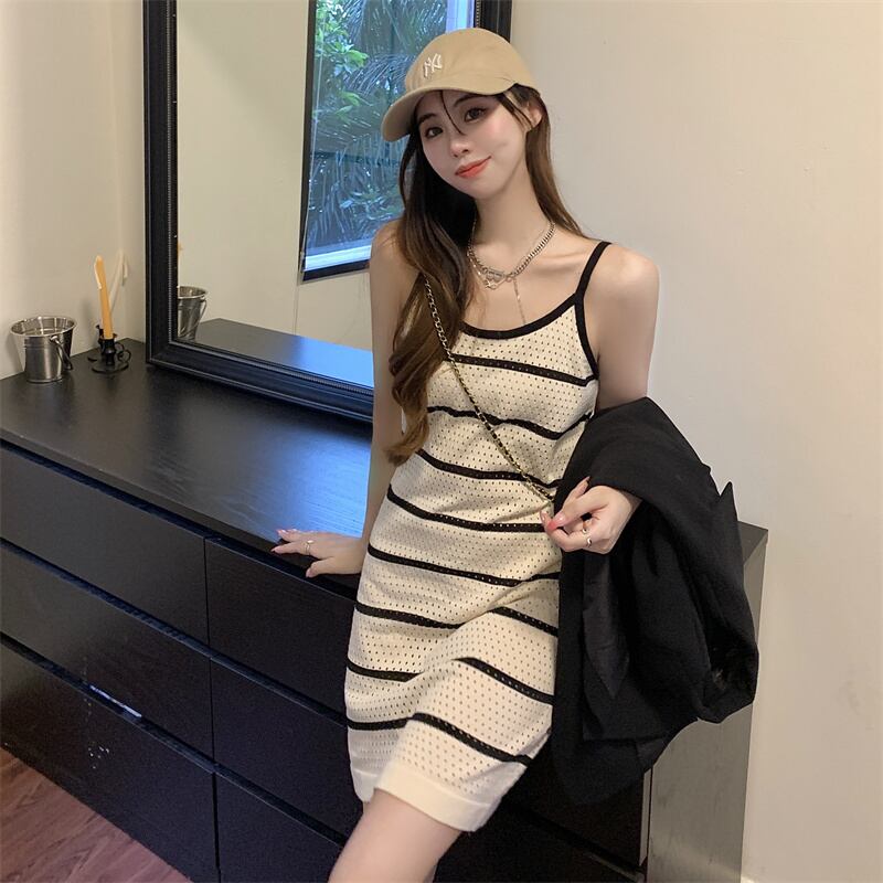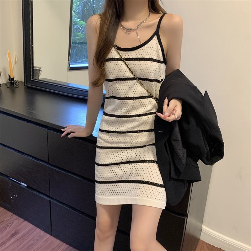 白のストライプのドレスの女性の夏の薄い中空サスペンダー スカート セクシーなヒップ ニット ベスト ショート スカート ホワイト サマー 夏物 7460091133895125 | framboise21