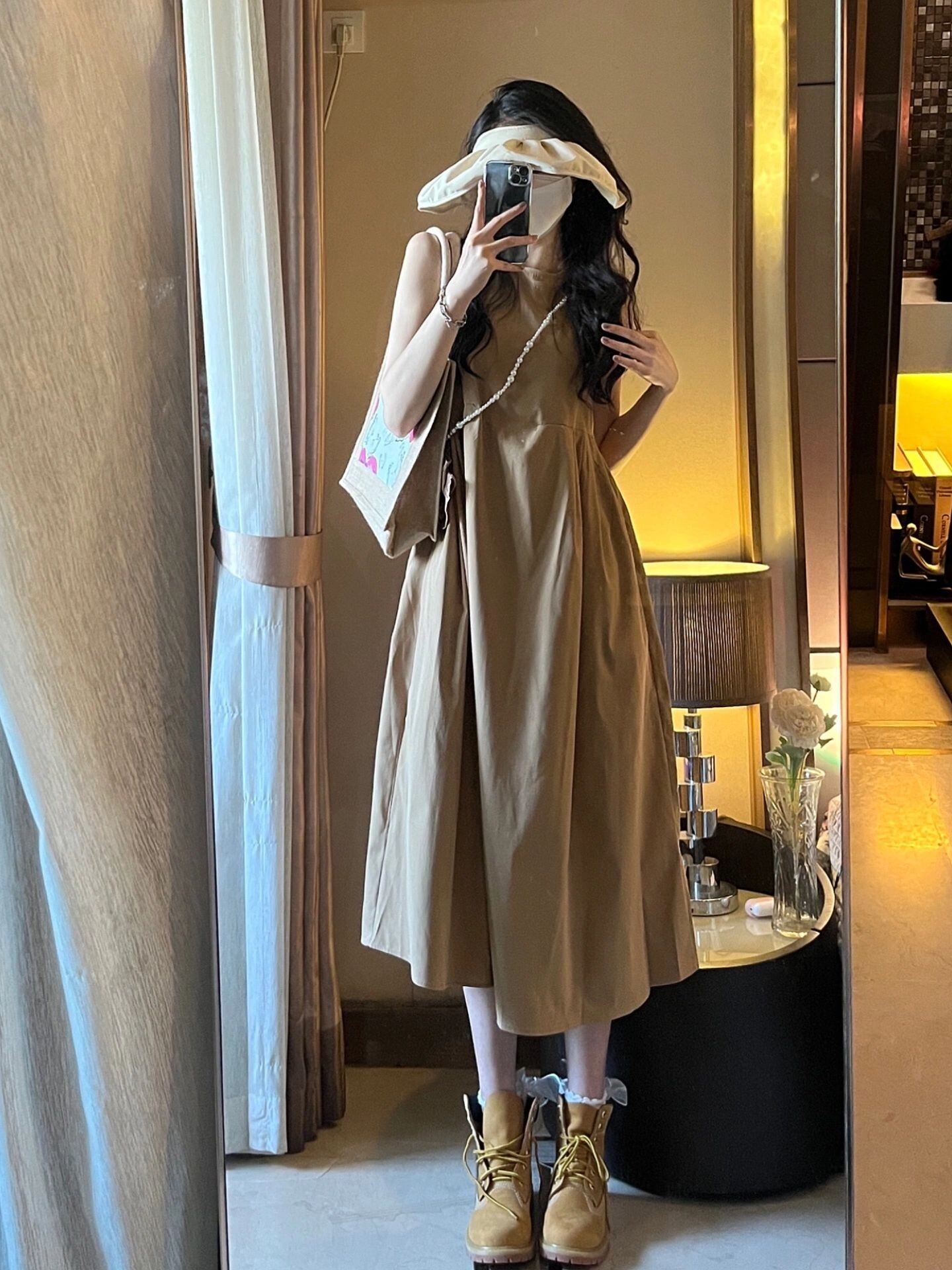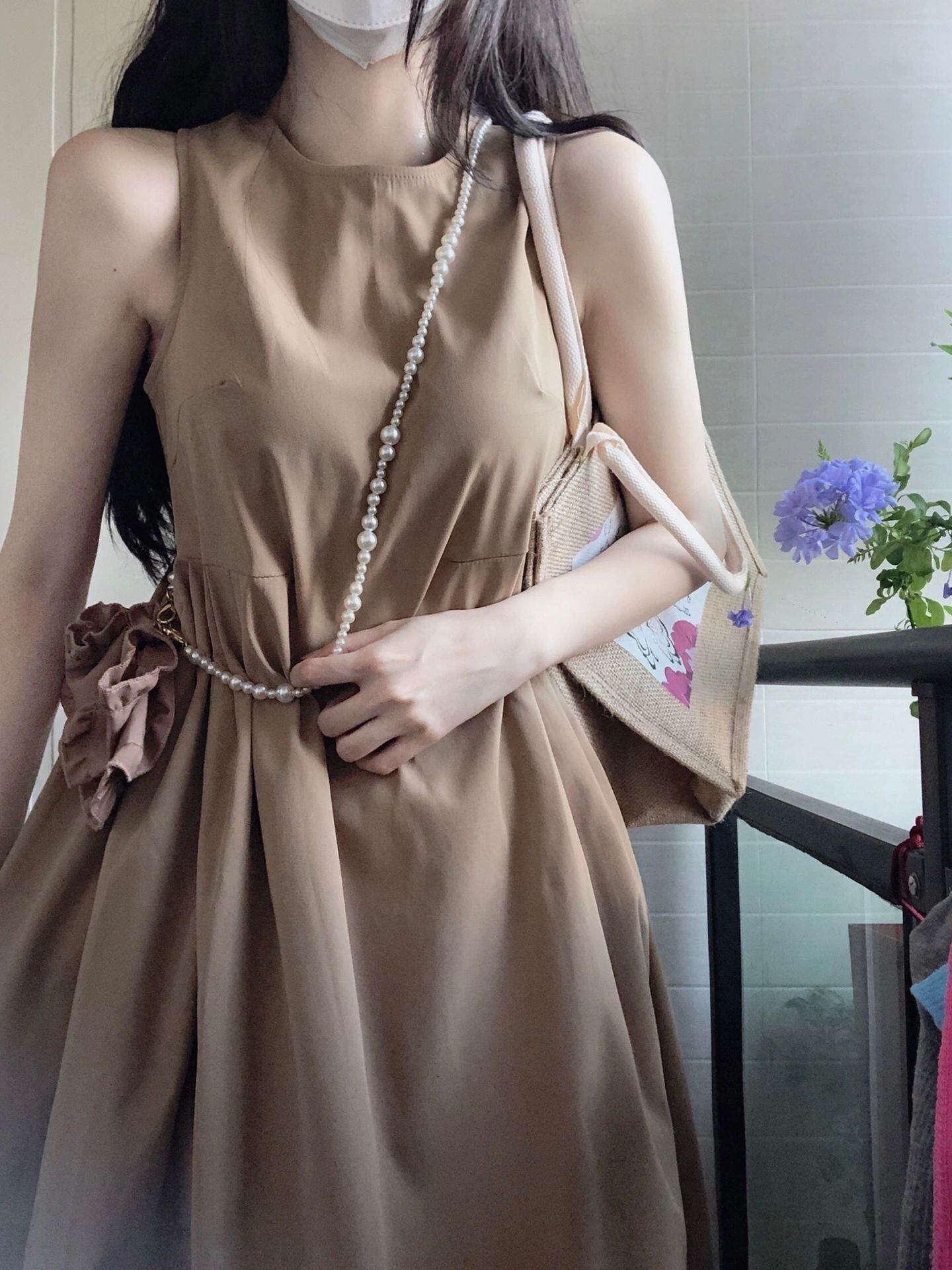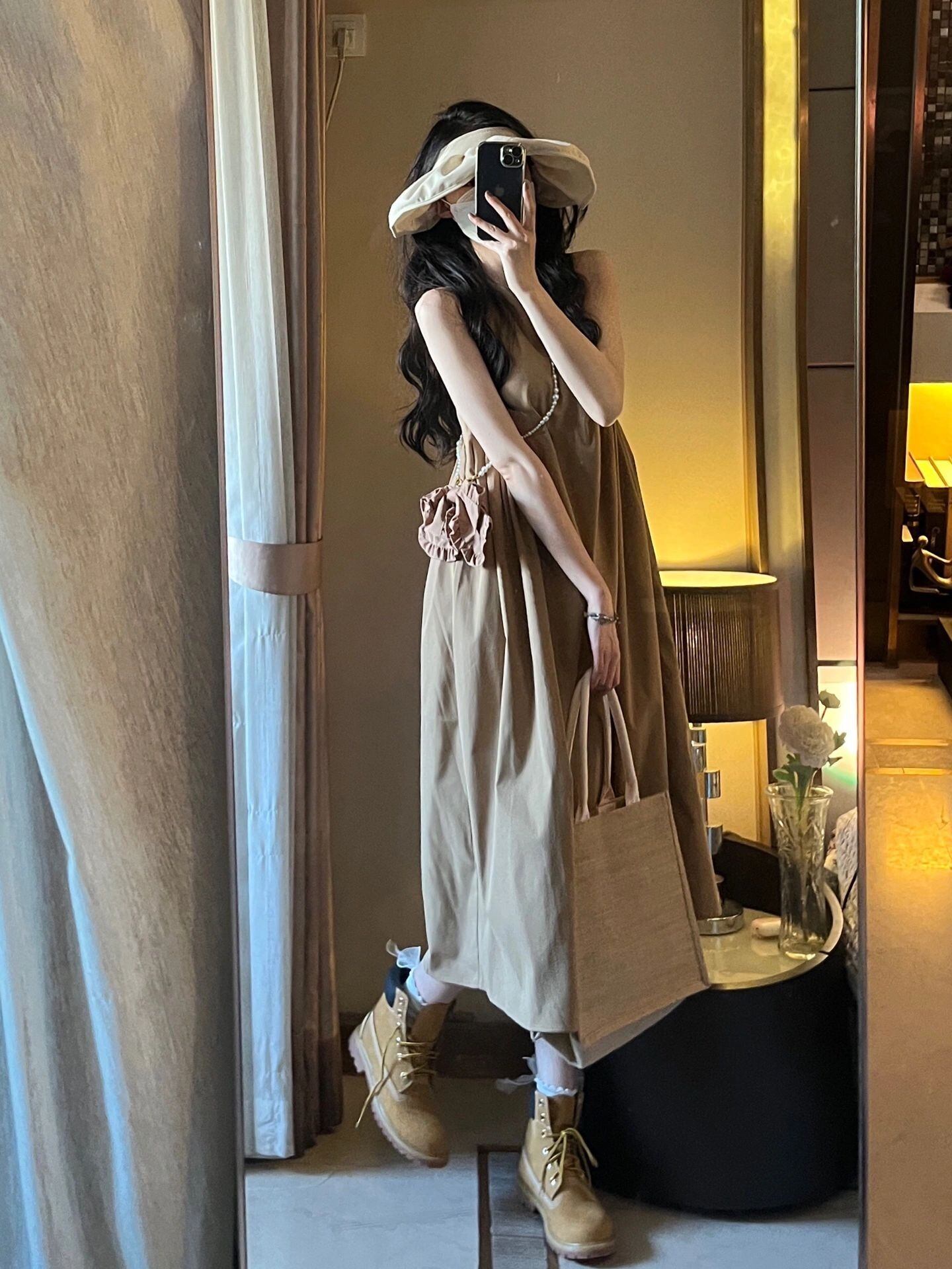 カーキ ノースリーブ ドレス レディース サマー フレンチ センセーション ニッチ 気質 ウエスト Aライン ロング タンクトップ スカート 夏物 7460027763600230 | framboise21