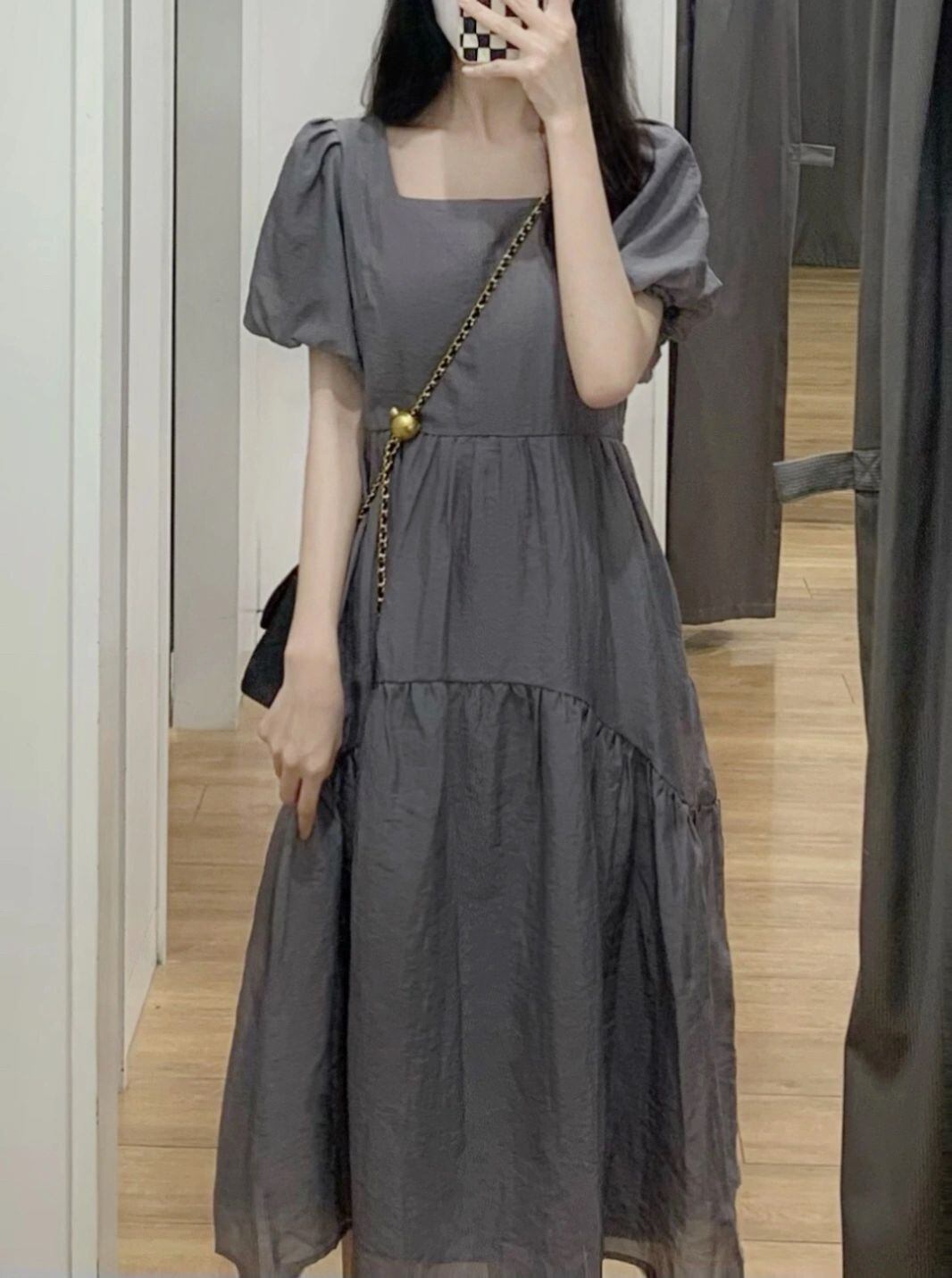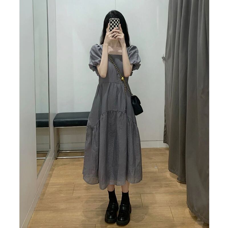 フランスのハイエンドの優しいスタイルのロングスカート 2022 新しいウエストの小さなスクエアカラーのグレーのドレスの女性の夏 サマー 夏物 スクウェア 7460095670555498 | framboise21