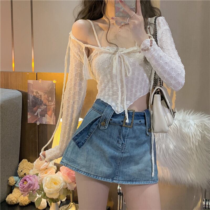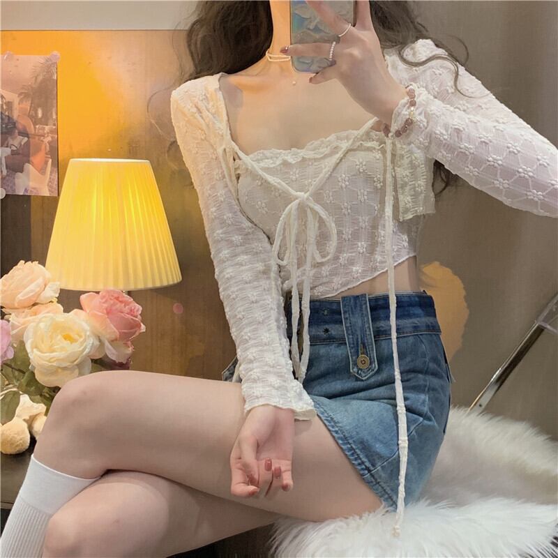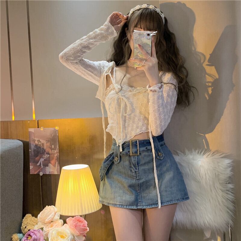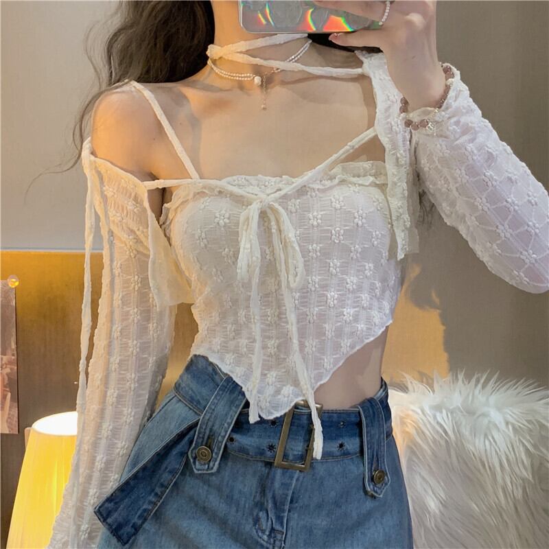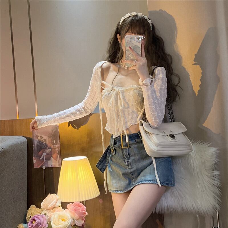 レースシャツの女性の春夏の純粋な欲望、甘くてスパイシーなセクシーなサスペンダー、ハイウエストのショートショールブラウス、2点セット 大人ガーリー スウィート キュート カジュアル スプリング 春物 サマー 夏物 ピュア 7460052433242813 | framboise21