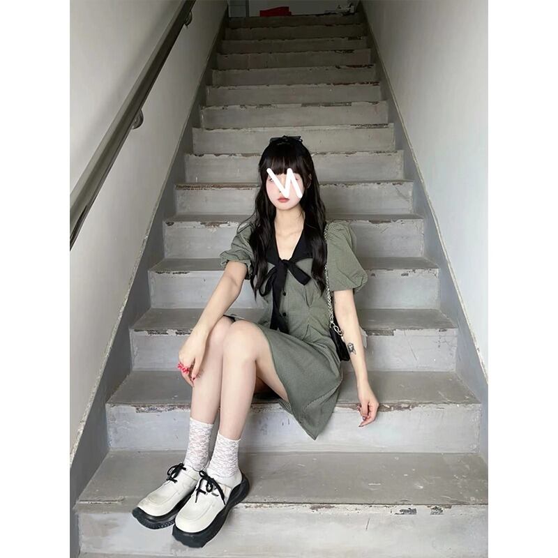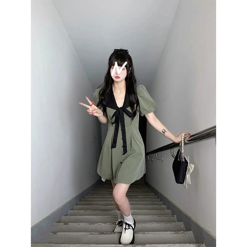 緑の千鳥格子のドレスの女性の2022年夏の新しいフランスのデザインは、スリムなウエストの弓の短いスカートを感じます ショート リボン サマー 夏物 グリーン 7460049352602024 | framboise21