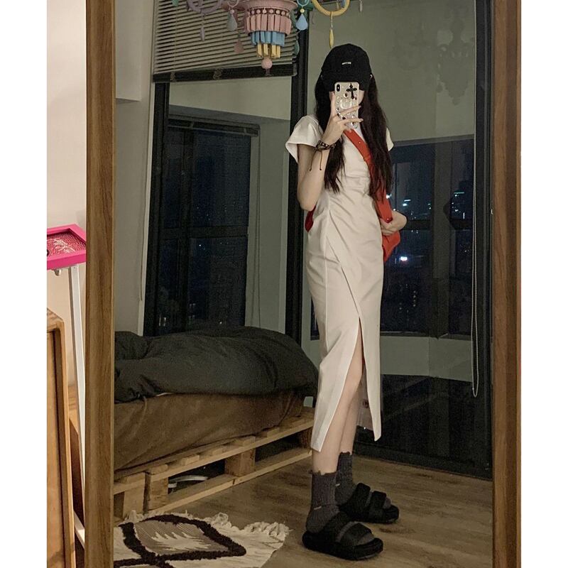 ホワイト スリット ワンピース レディース 夏 フレンチ デザイン センス ニッチ ウエスト スリム バッグ ヒップ スカート カジュアル Tシャツ スカート サマー 夏物 7460061081172247 | framboise21