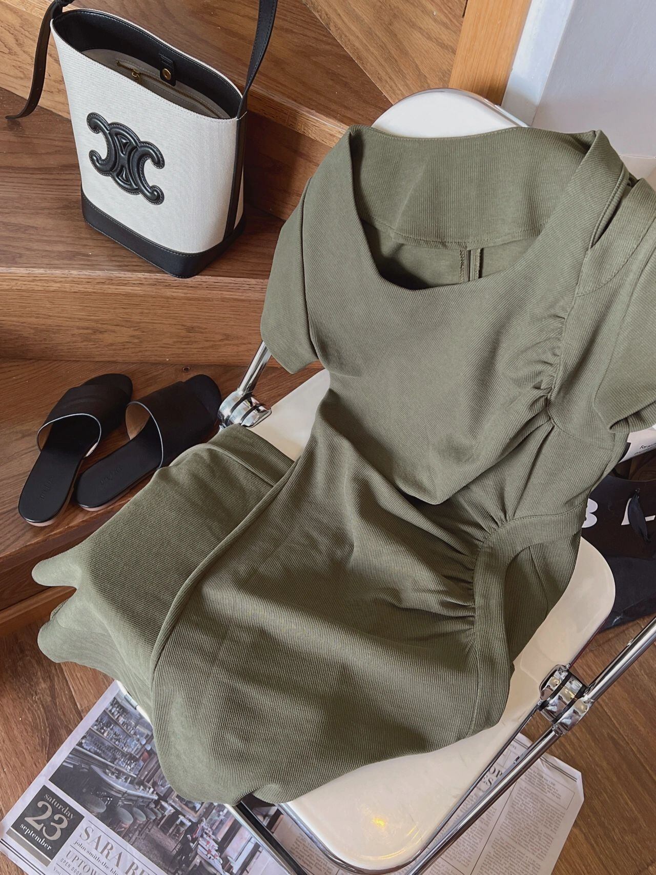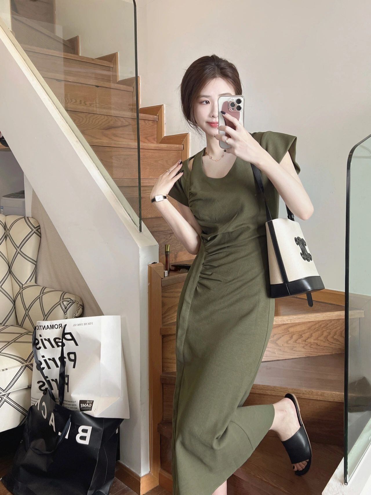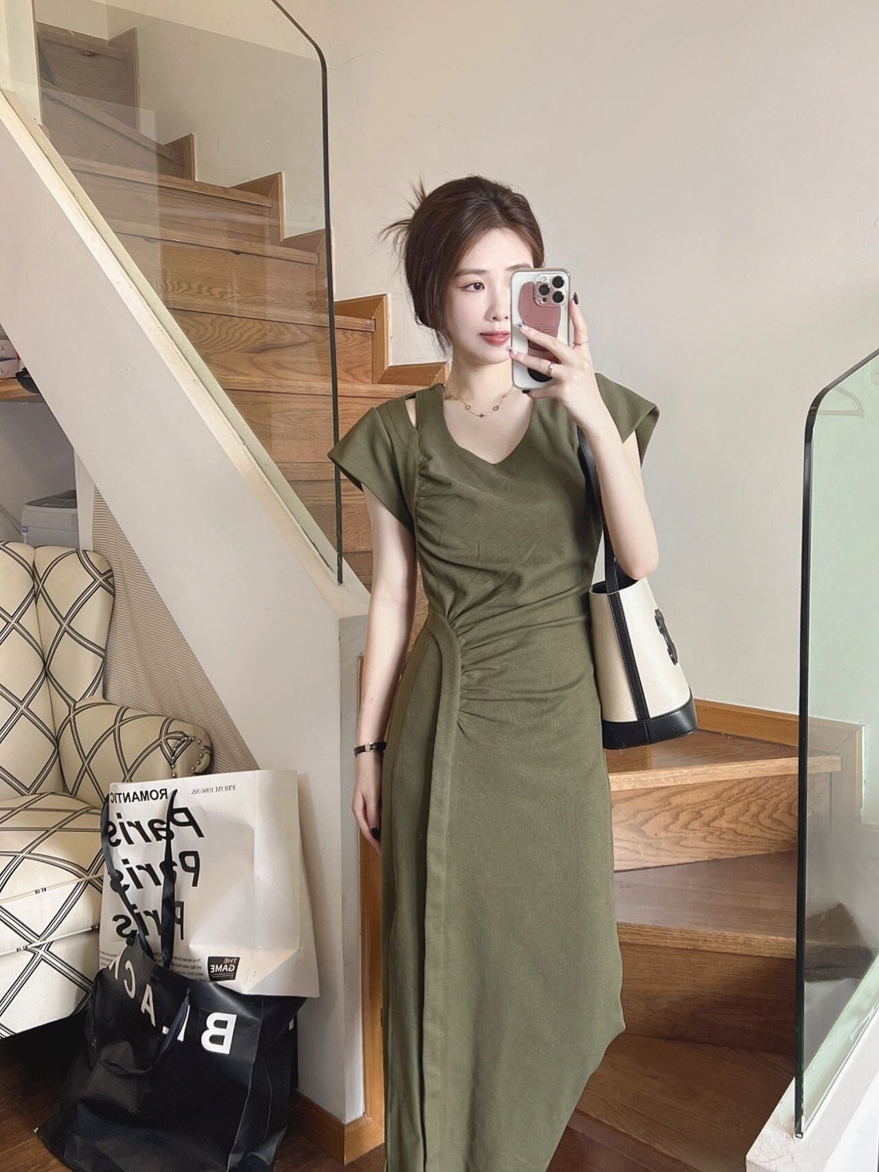緑の小さなフライング スリーブ ドレス女性の 2022 年夏の新しい純粋な欲望風デザイン センス ウエスト スリム v ネック ロング スカート サマー 夏物 Vネック ピュア グリーン 746003072283379 | framboise21