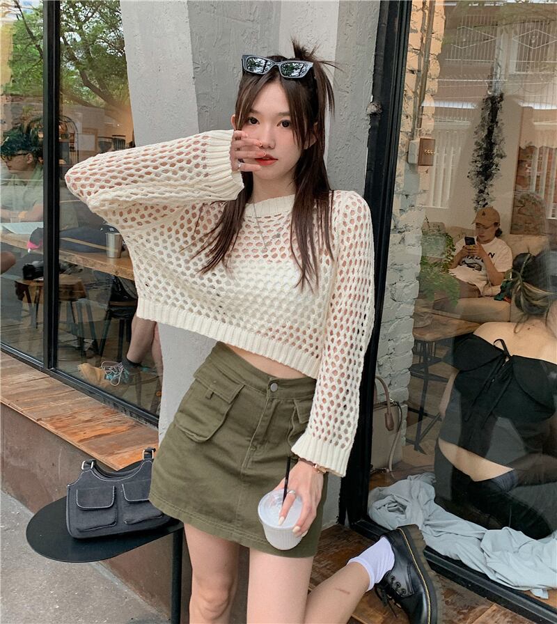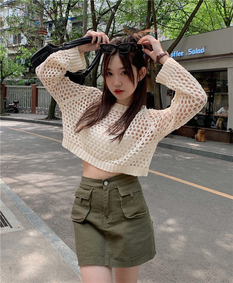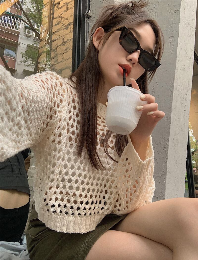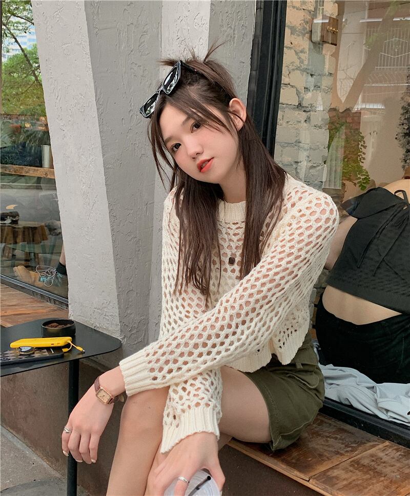 ホワイト日焼け止めブラウスレディース夏デザイン感のある薄手の長袖トップスとくり抜いたショート丈のアイスシルクニットTシャツ ロング サマー 夏物 7460067042581812 | framboise21