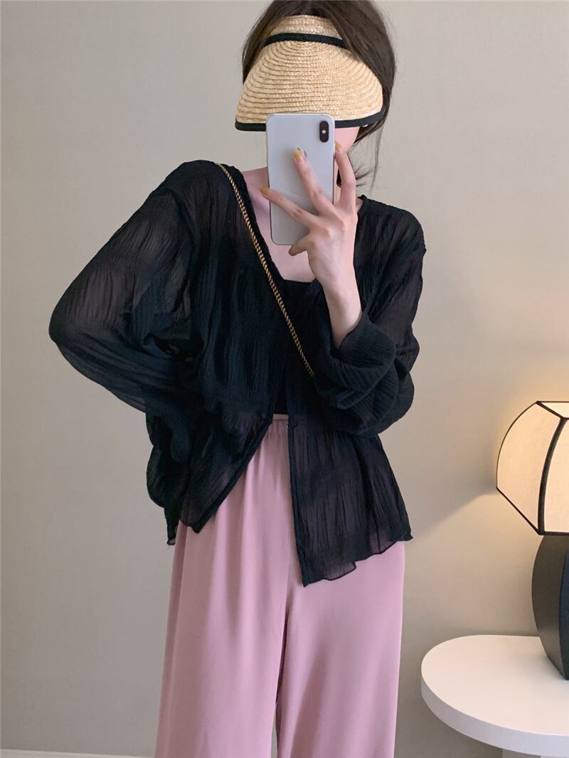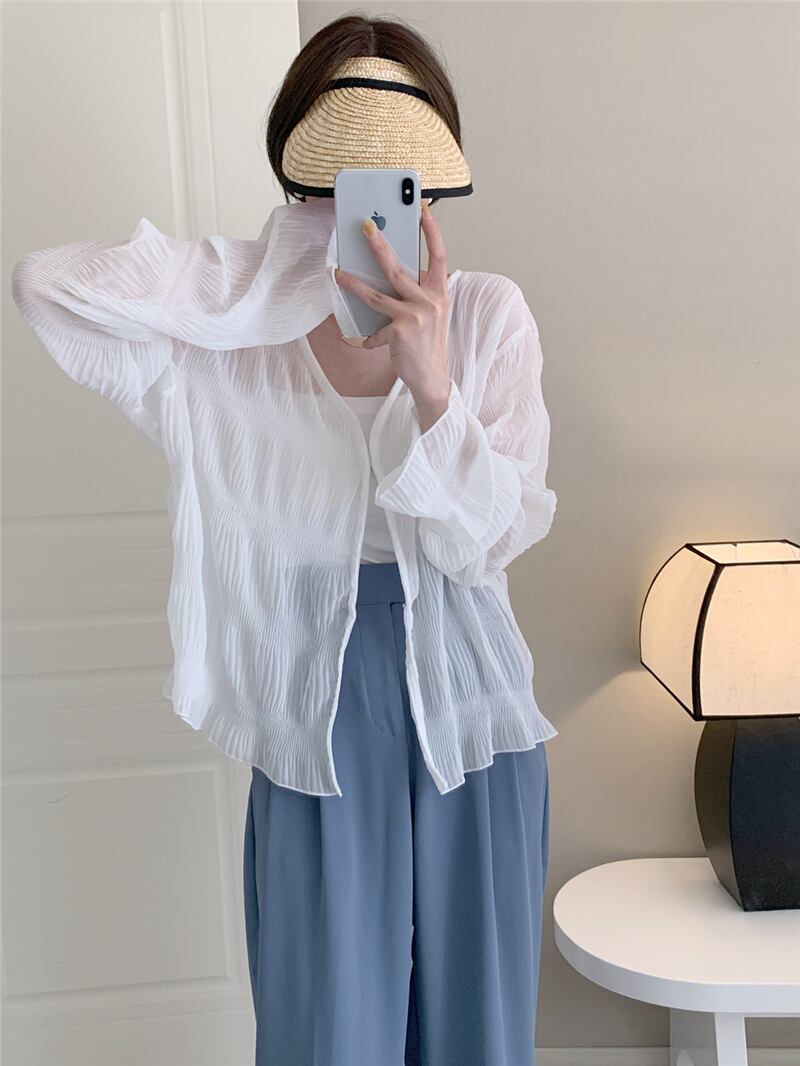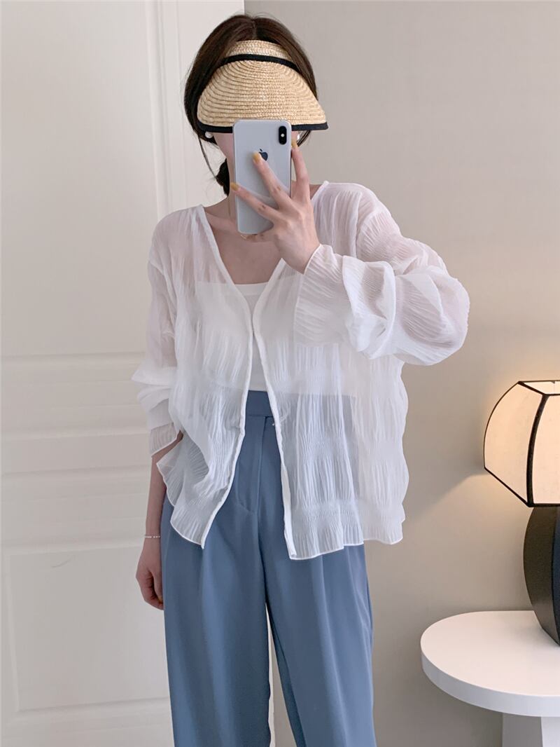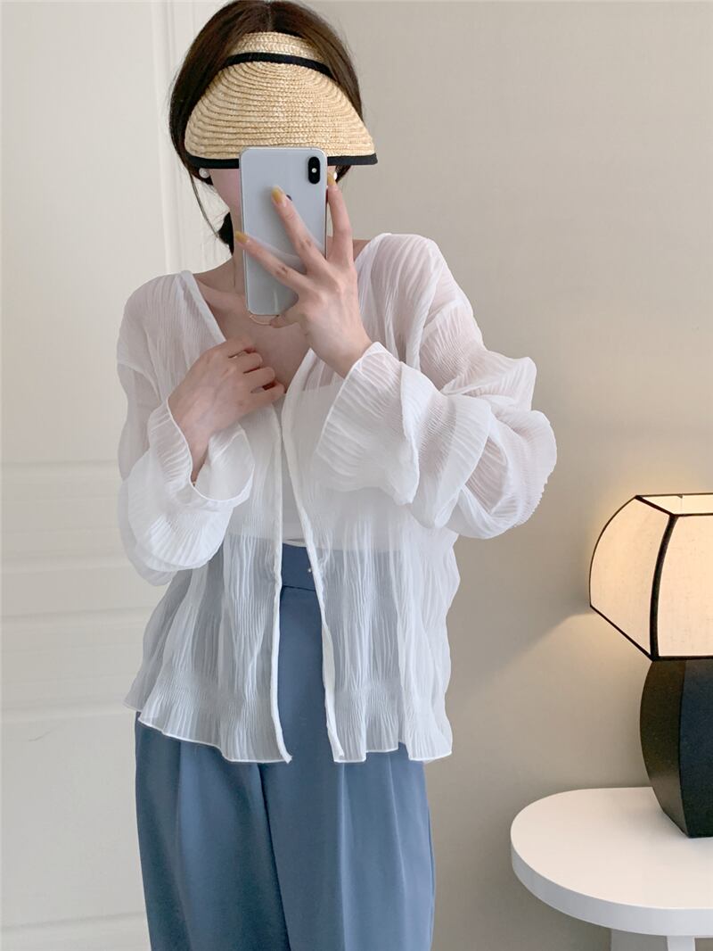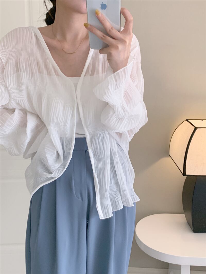 ホワイト Vネック 日焼け止め カーディガン レディース 夏用 薄手 シフォン 長袖シャツ プリーツデザイン 通気性 空調シャツ トップス ロング サマー 夏物 7460084838766447 | framboise21