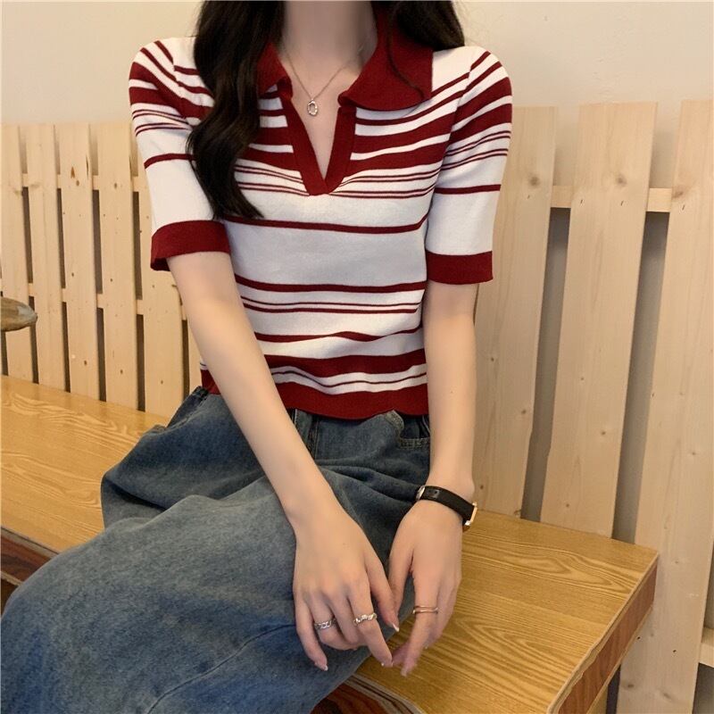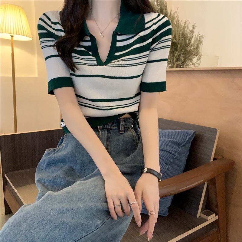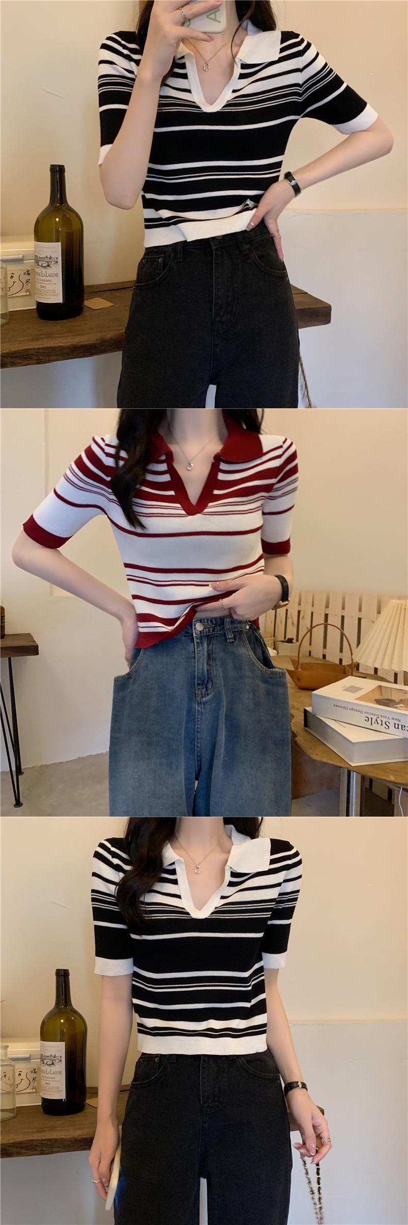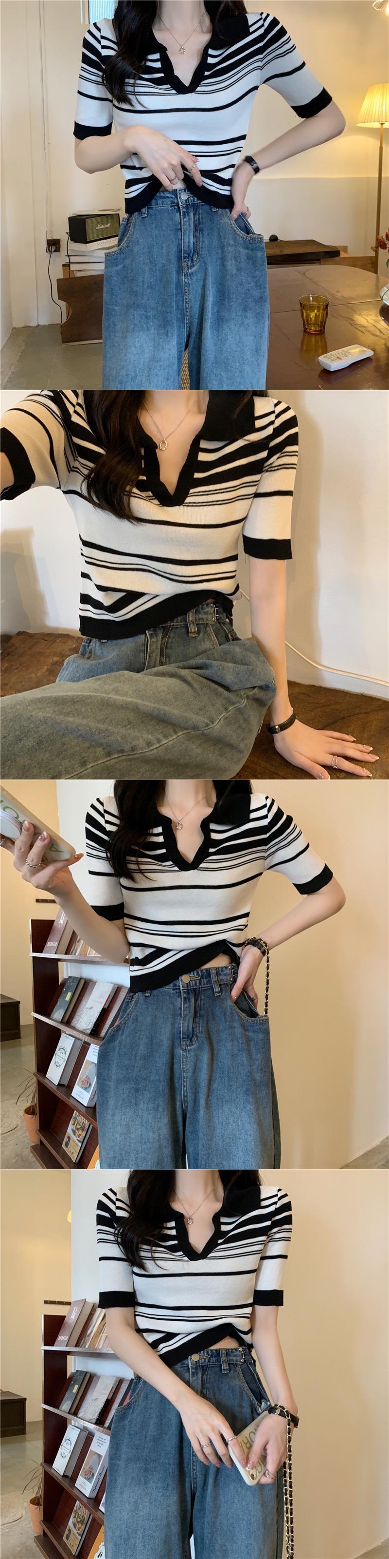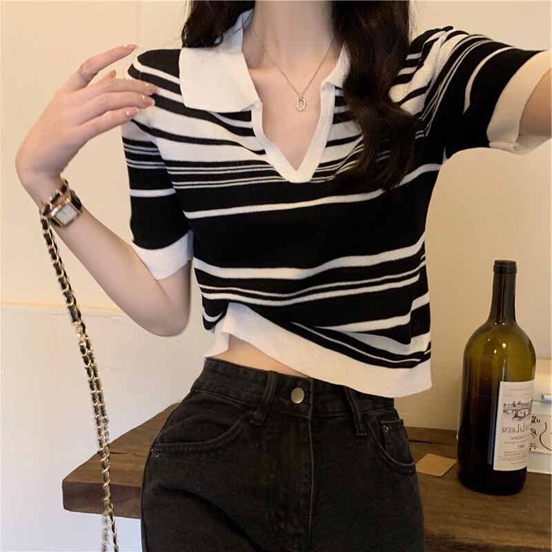 白黒 ストライプ ポロシャツ 半袖 Tシャツ レディース 夏 デザイン ニッチ フロント ショルダー Vネック スリム ハイウエスト ショート トップス ハイウェスト ホワイト ブラック サマー 夏物 746001903696587 | framboise21