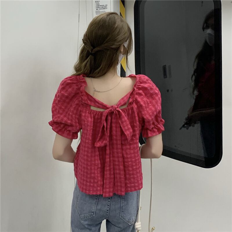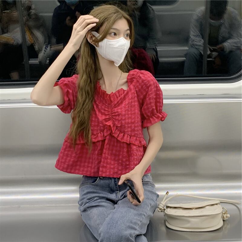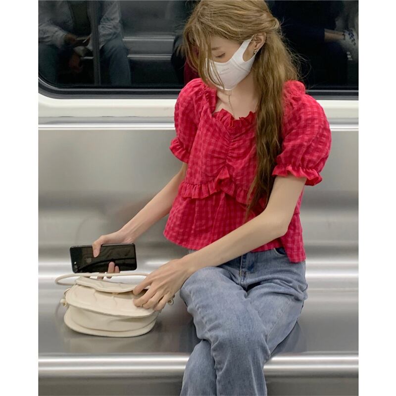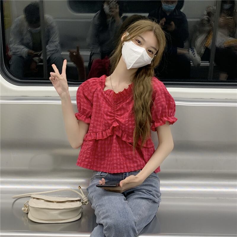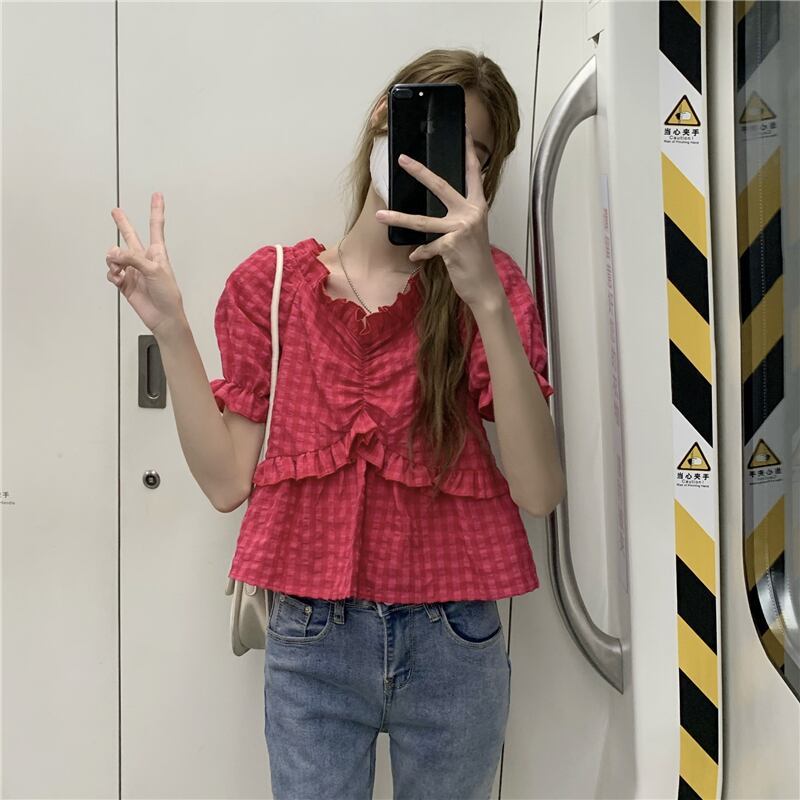 ドラゴンフルーツカラーパフスリーブシフォンシャツレディースサマーチェック柄半袖シャツドールシャツスイートフェアリーショートトップ 大人ガーリー スウィート キュート カジュアル 夏物 7460036252591911 | framboise21