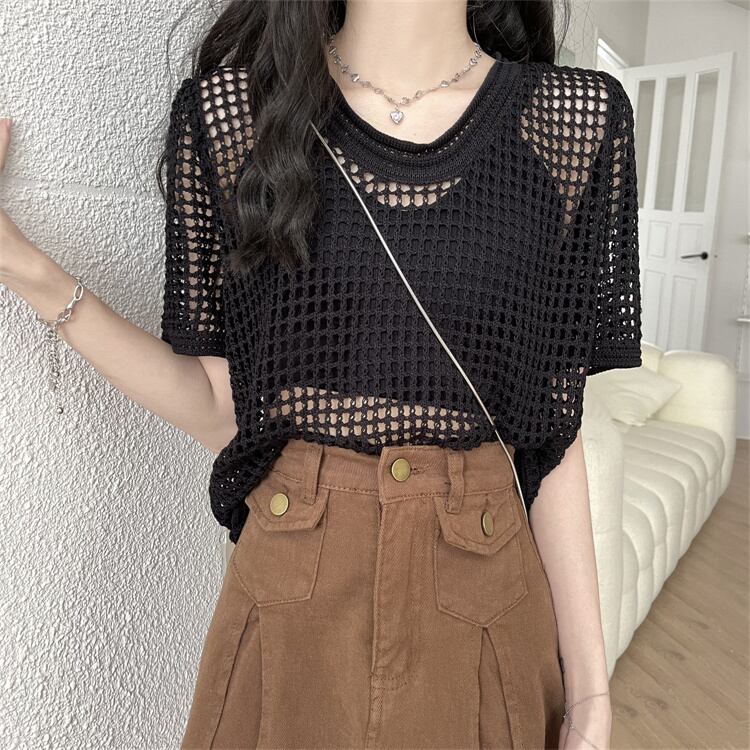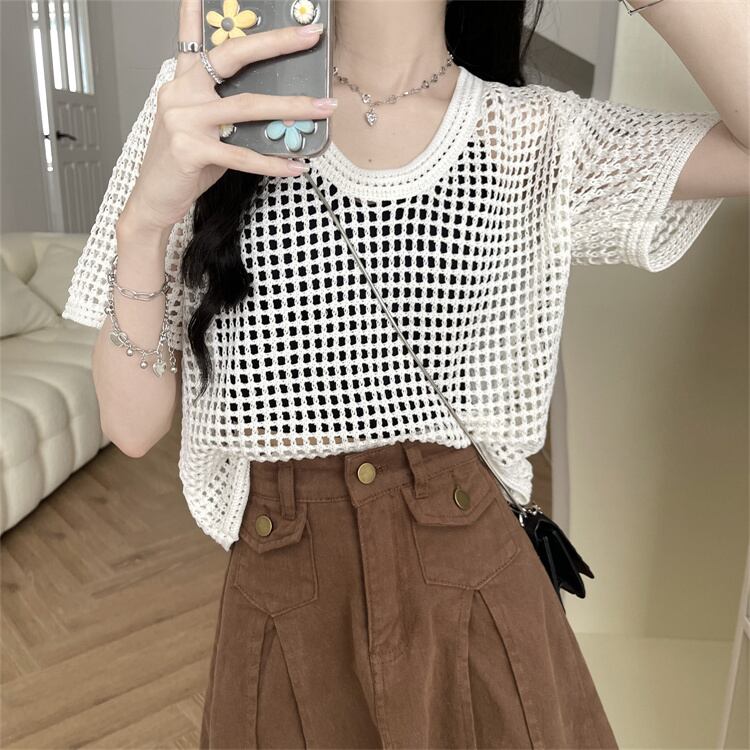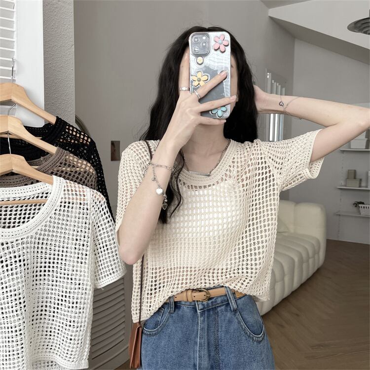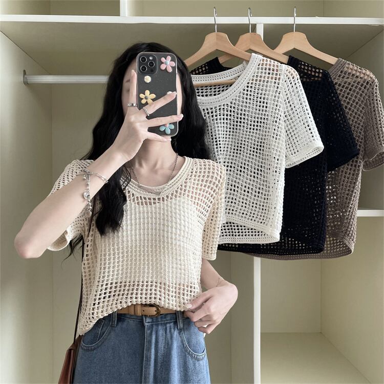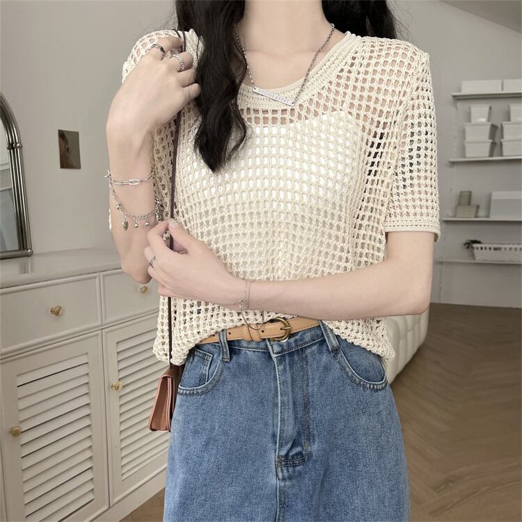 アウター ブラウス 夏 薄手 中空 半袖 Tシャツ レディース デザインニッチ アイスシルク ニット 日焼け止め ショートトップ サマー 夏物 7460017703975963 | framboise21