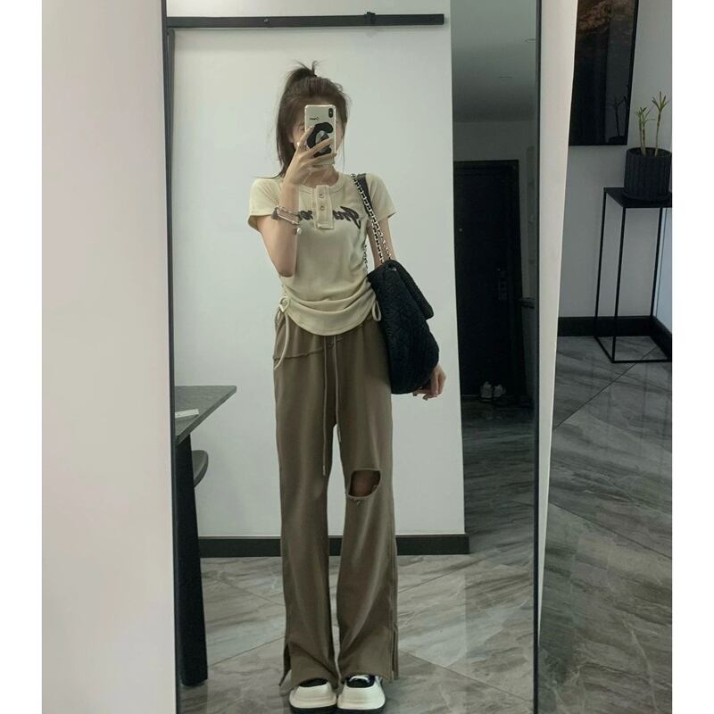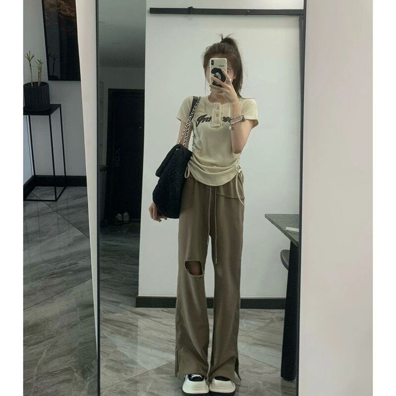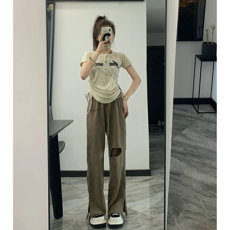 中空カーキスポーツパンツ薄手夏レディース潮ブランドルーズストレートチューブドレープワイドレッグパンツカジュアルスウェットパンツ サマー 夏物 7460029045916292 | framboise21