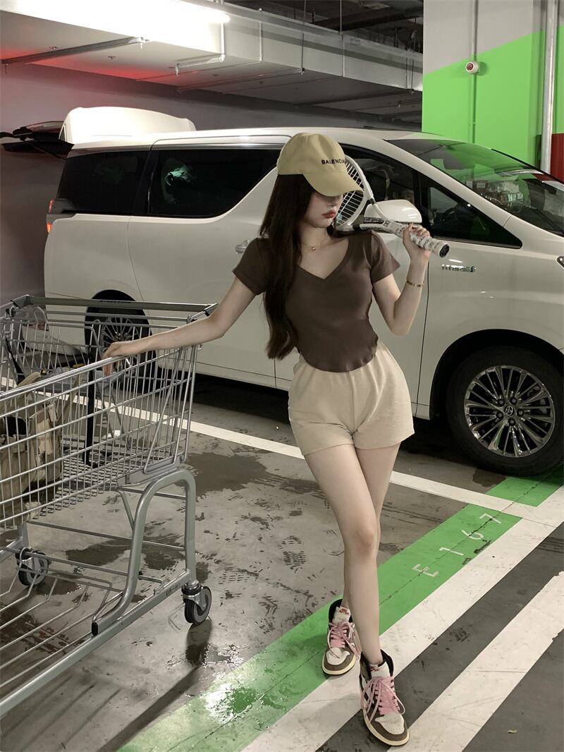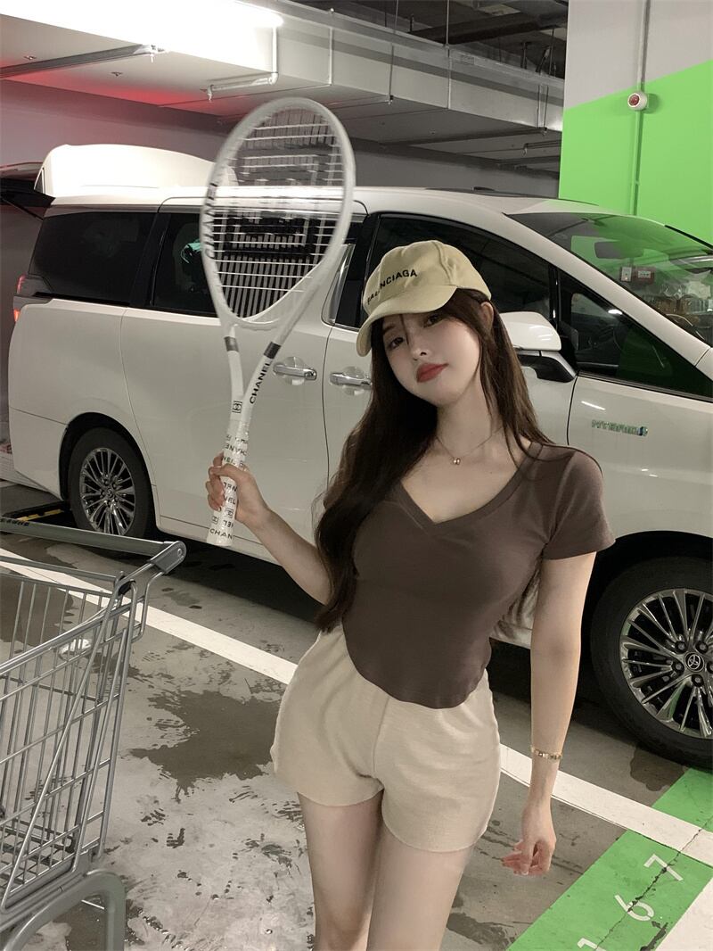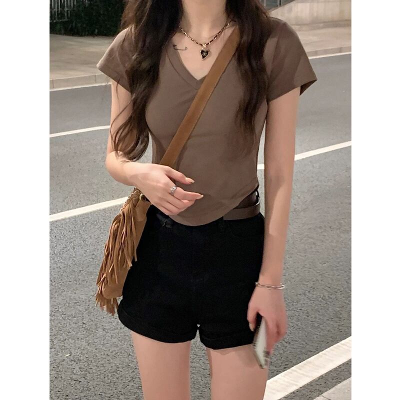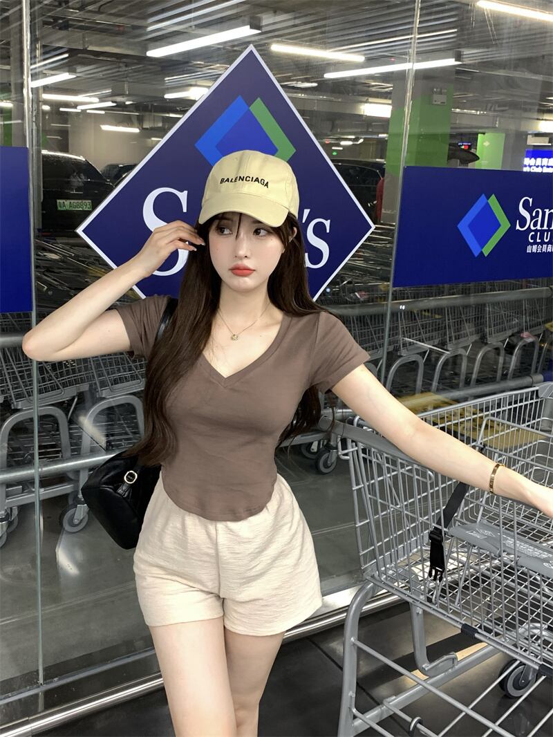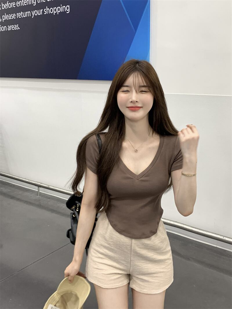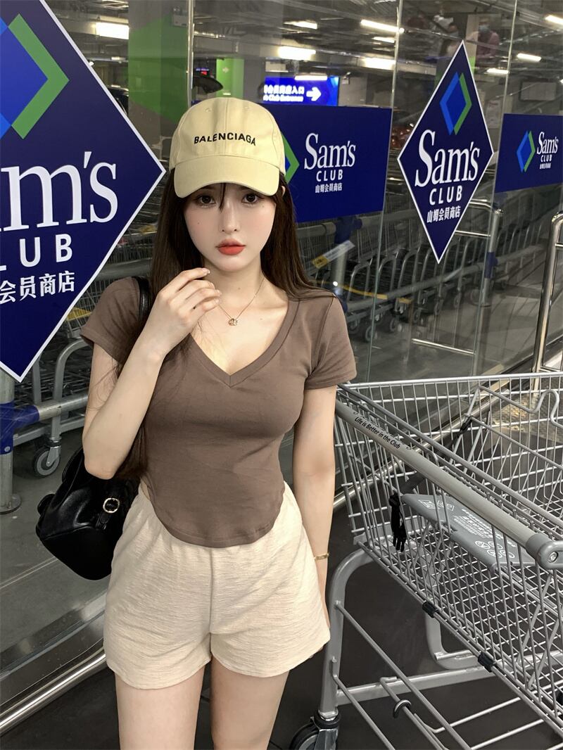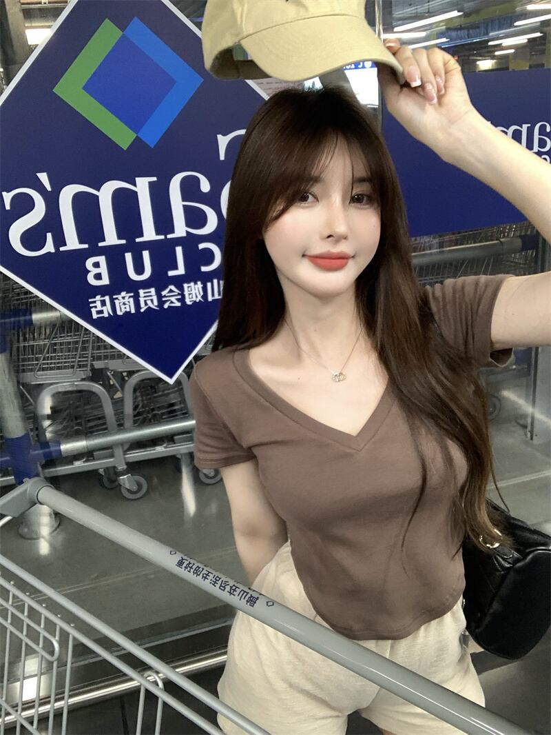 イレギュラーな半袖Tシャツレディース2022年夏新作ピュアデザイアデザインスリムフィットと薄手のVネックフロントショルダートップ サマー 夏物 7460018454995406 | framboise21