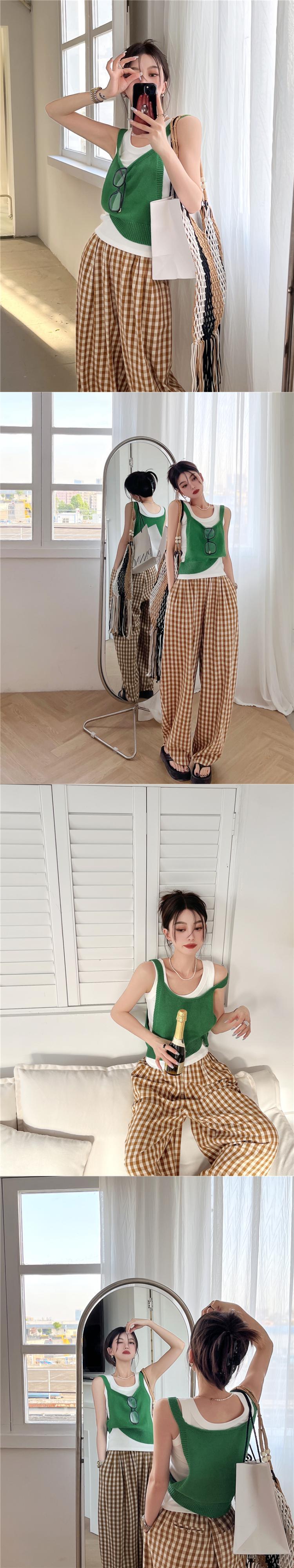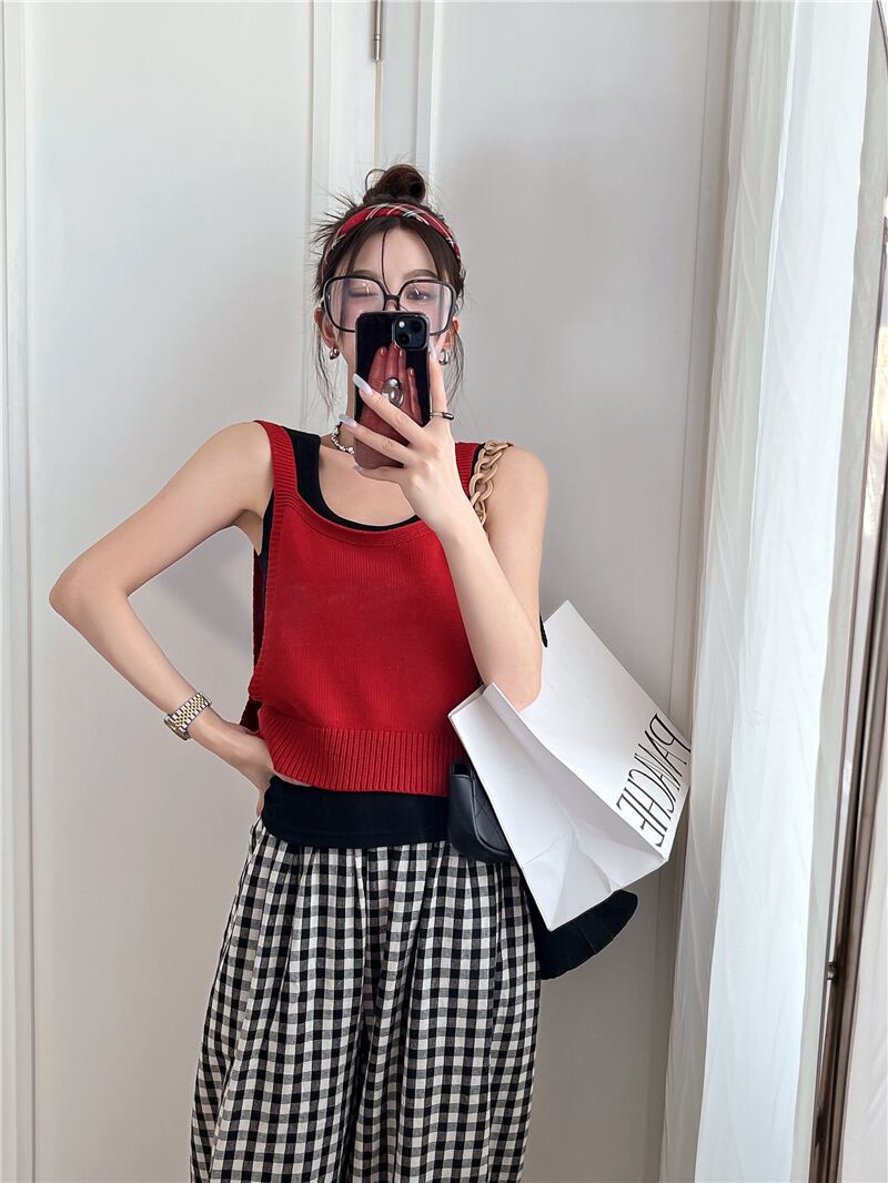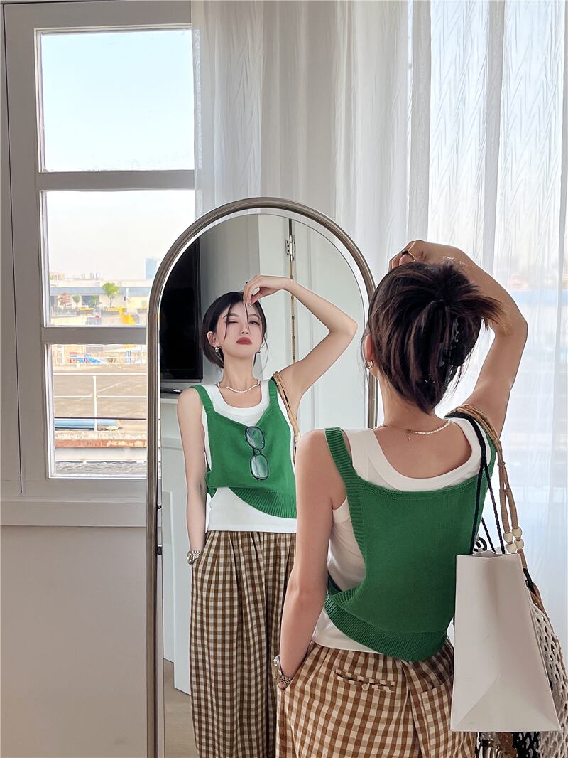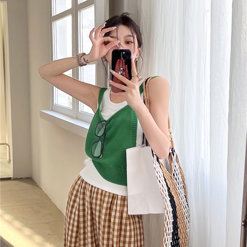 グリーンフェイクツーピースノースリーブニットベストTシャツレディース2022年夏新デザインセンスニッチスタッキングシントップ サマー 夏物 7460020982044394 | framboise21
