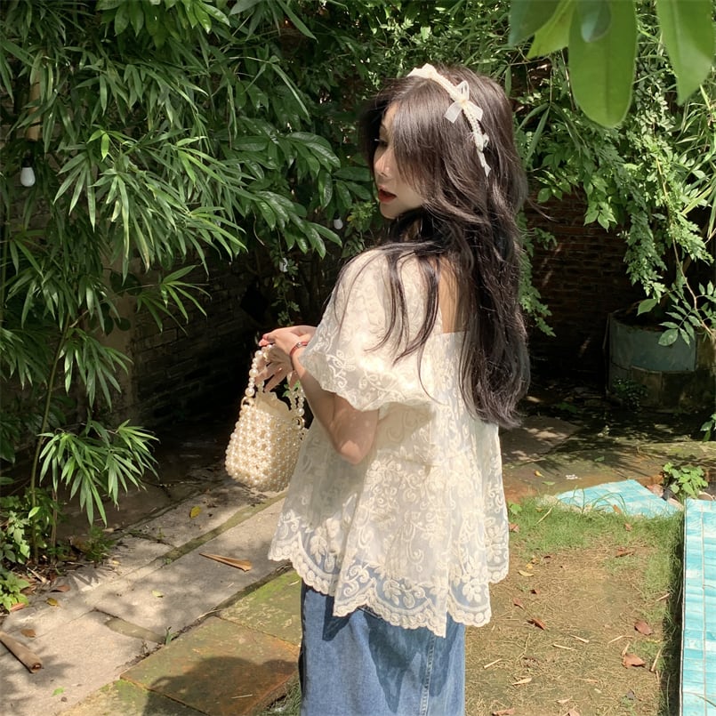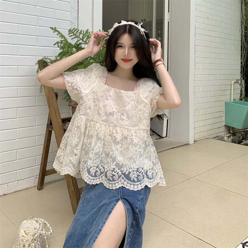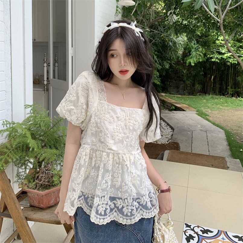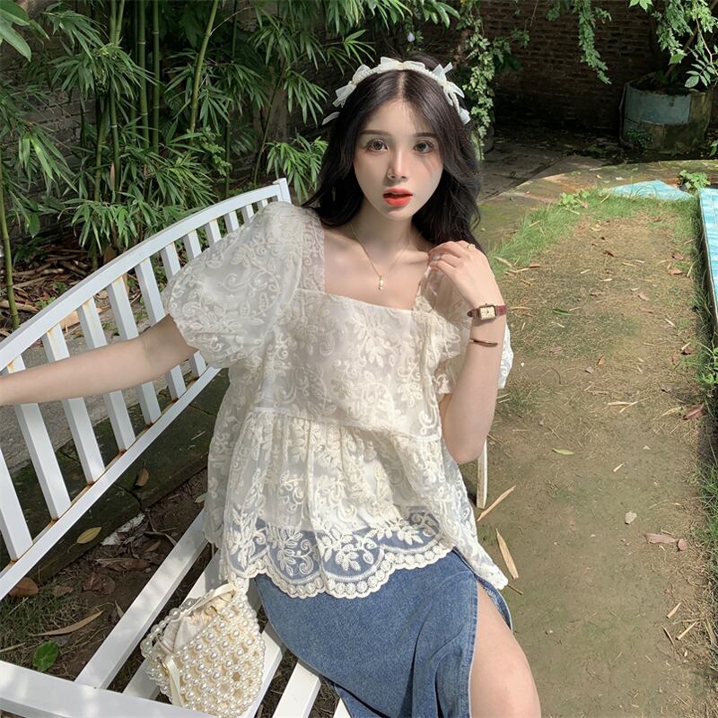 スクエアネック レース パフスリーブ シフォンシャツ レディース フレンチ 優しい 小さめシャツ ウエストスカート ドールシャツ トップス 夏 薄手 サマー 夏物 スクウェア 7460053340705517 | framboise21