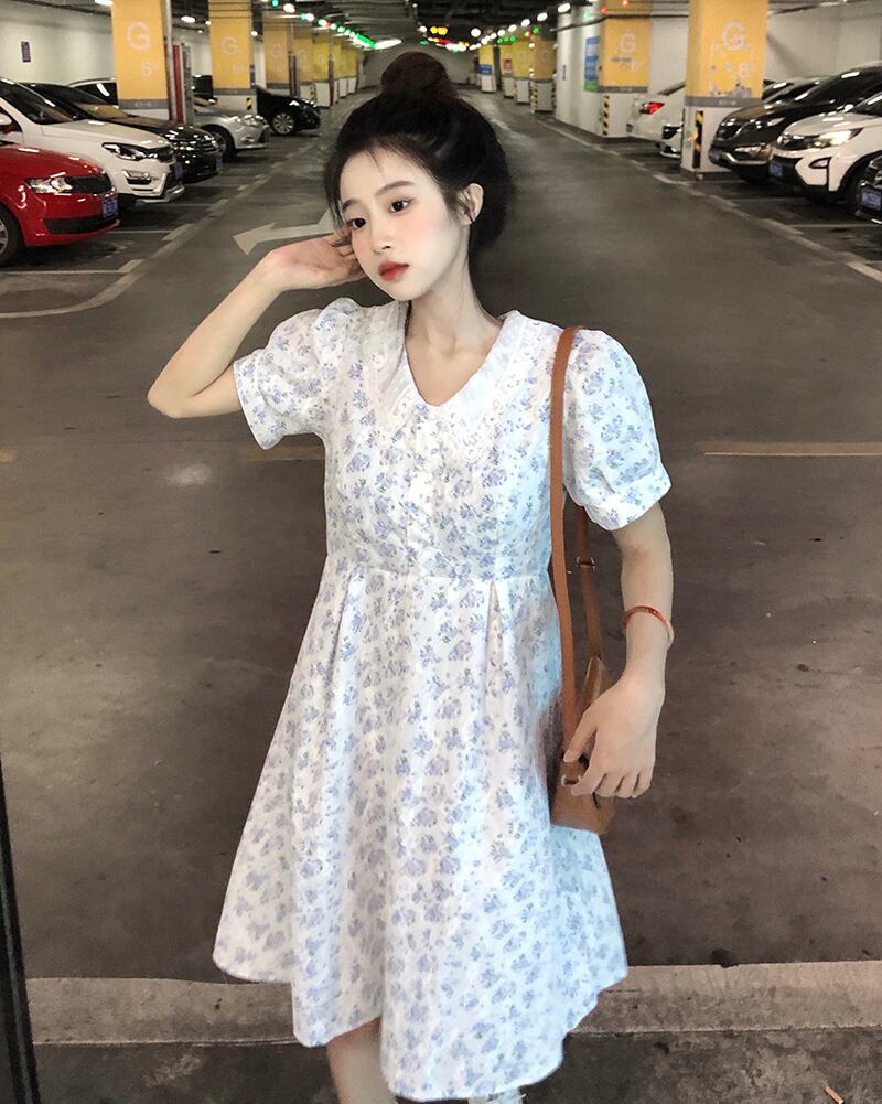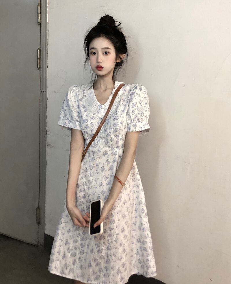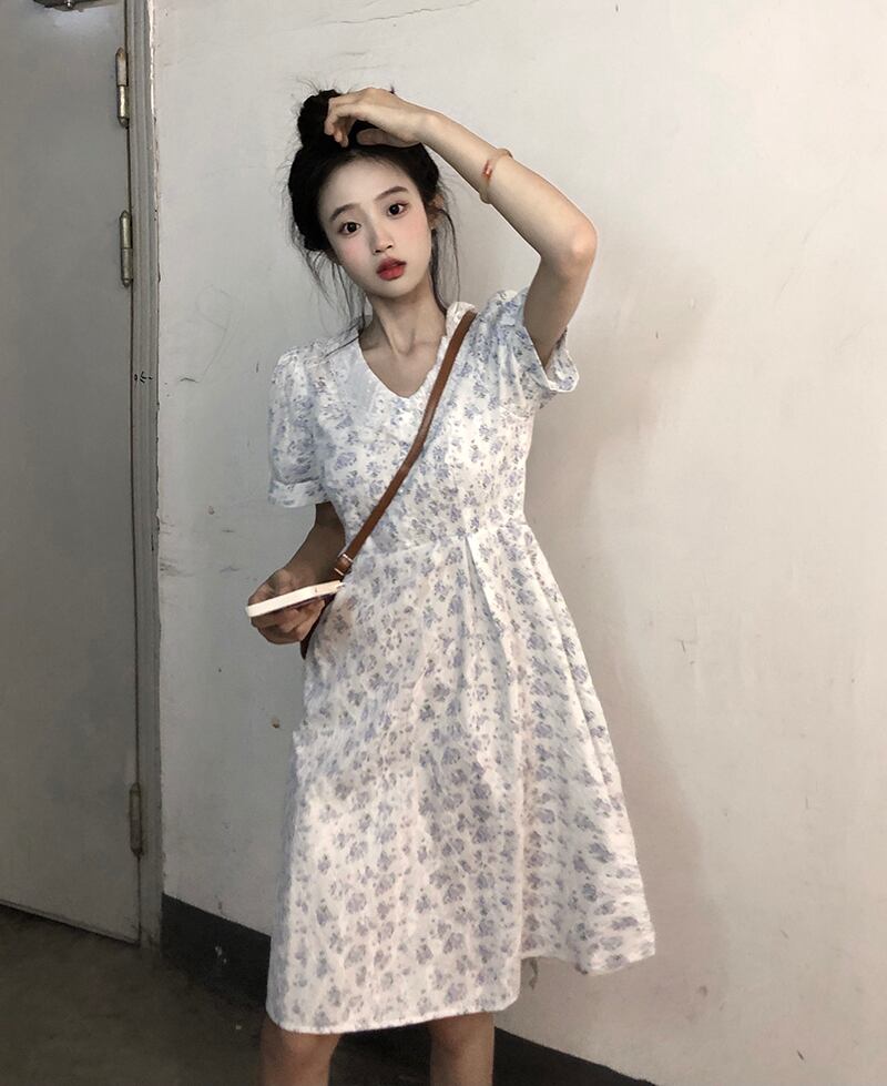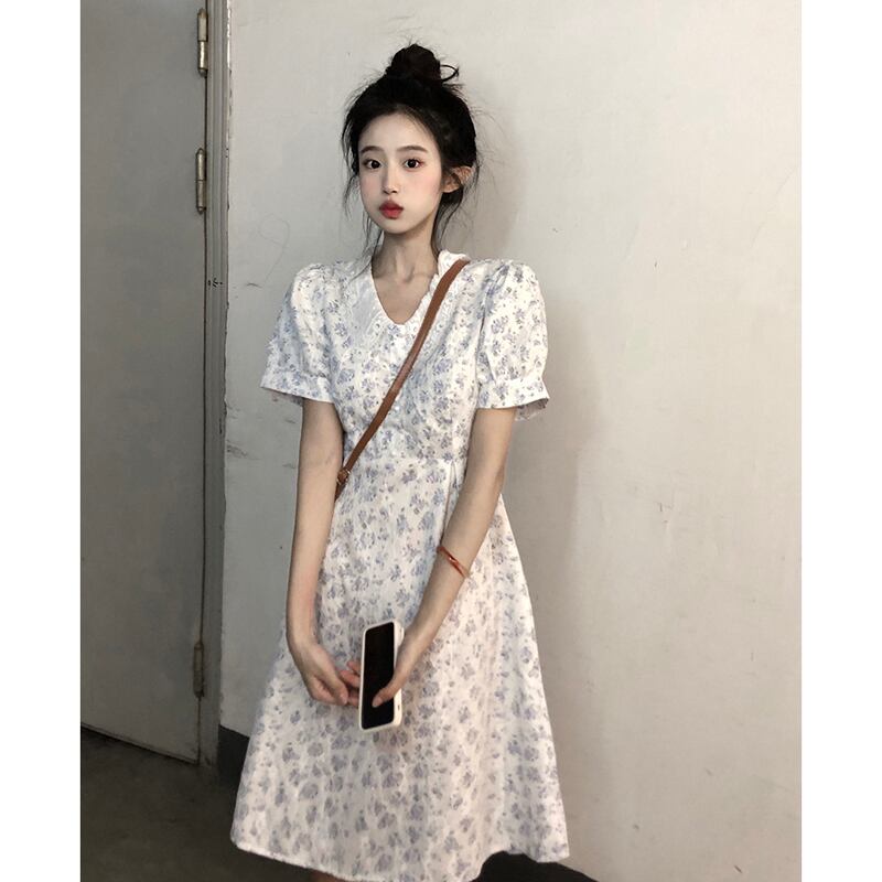 ポロカラーワンピース レディース 夏 薄手 花柄 ロングスカート フレンチ初恋 デザインセンス ウエストパフスリーブスカート ホワイト サマー 夏物 7460091599205718 | framboise21