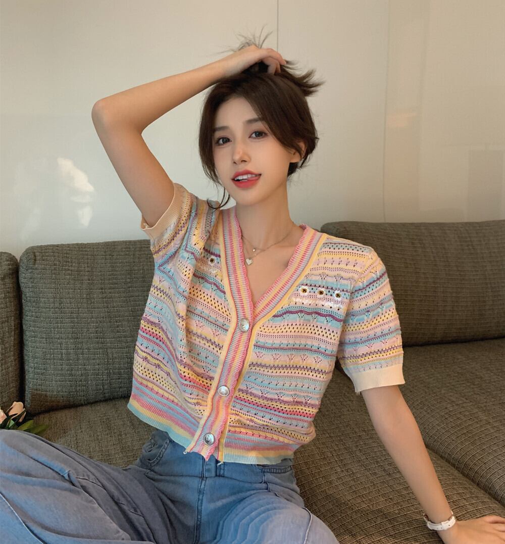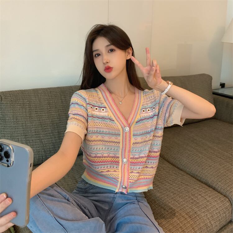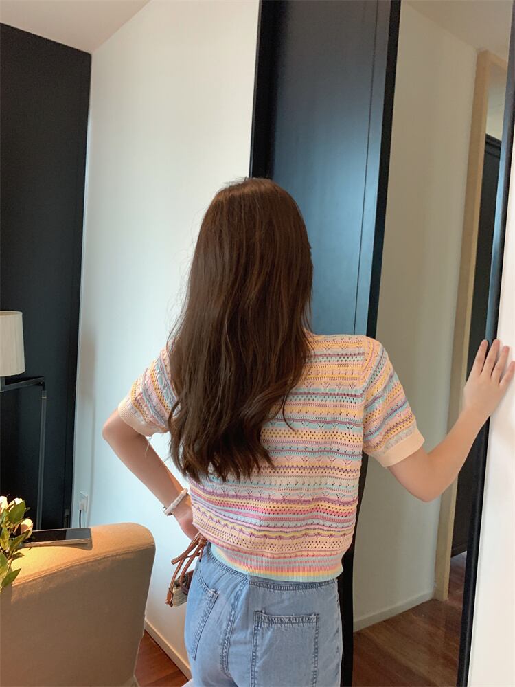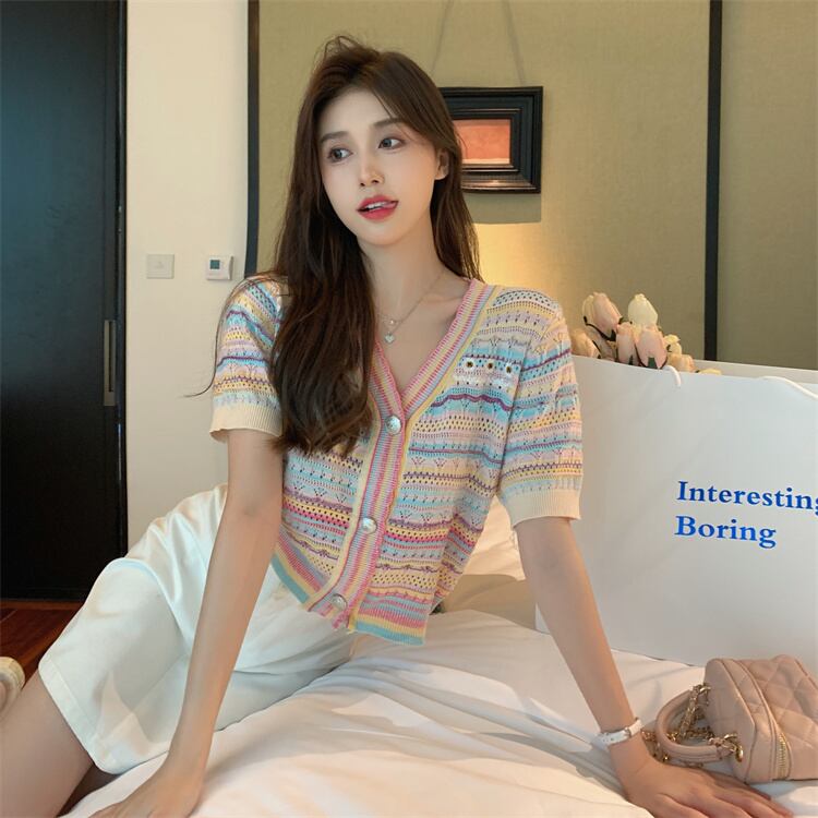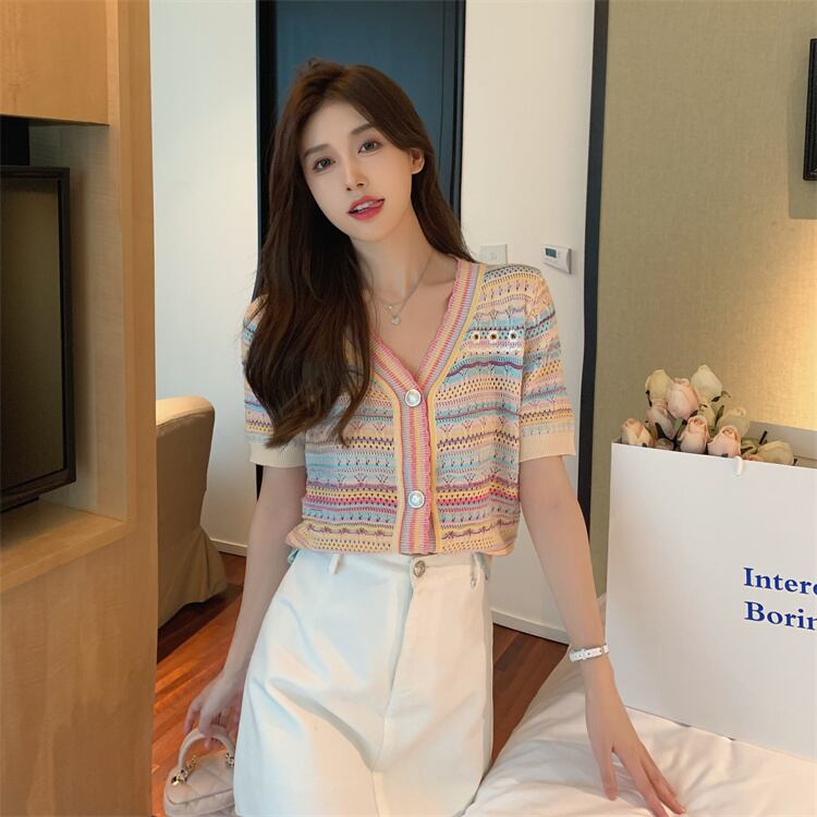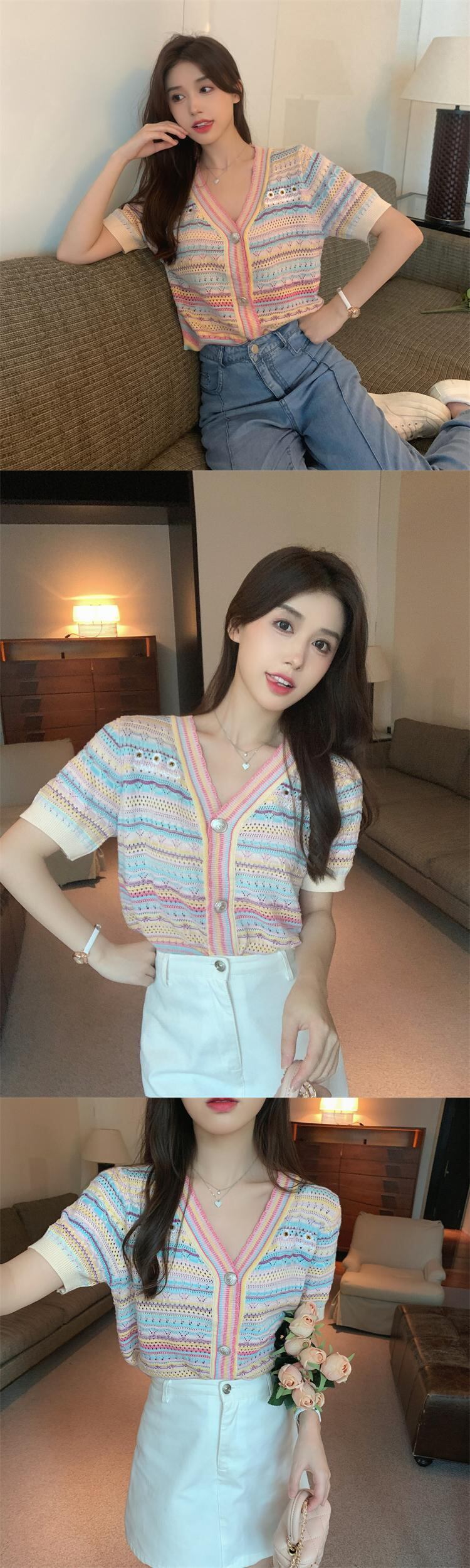 2022 新しい夏のハイエンド中空ショート v ネックトップ小さな香りストライプニット半袖アイスシルク tシャツの女性 サマー 夏物 Vネック 7460027370650858 | framboise21