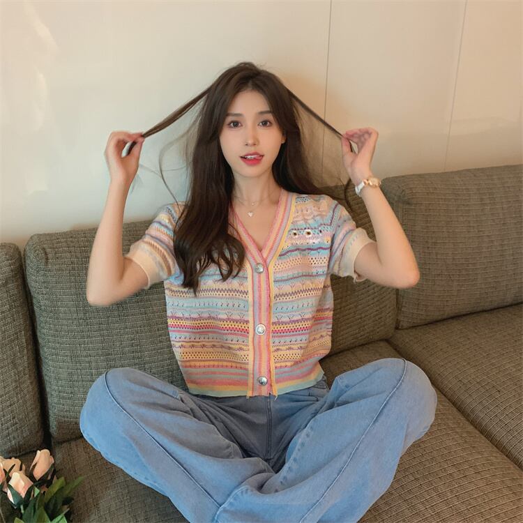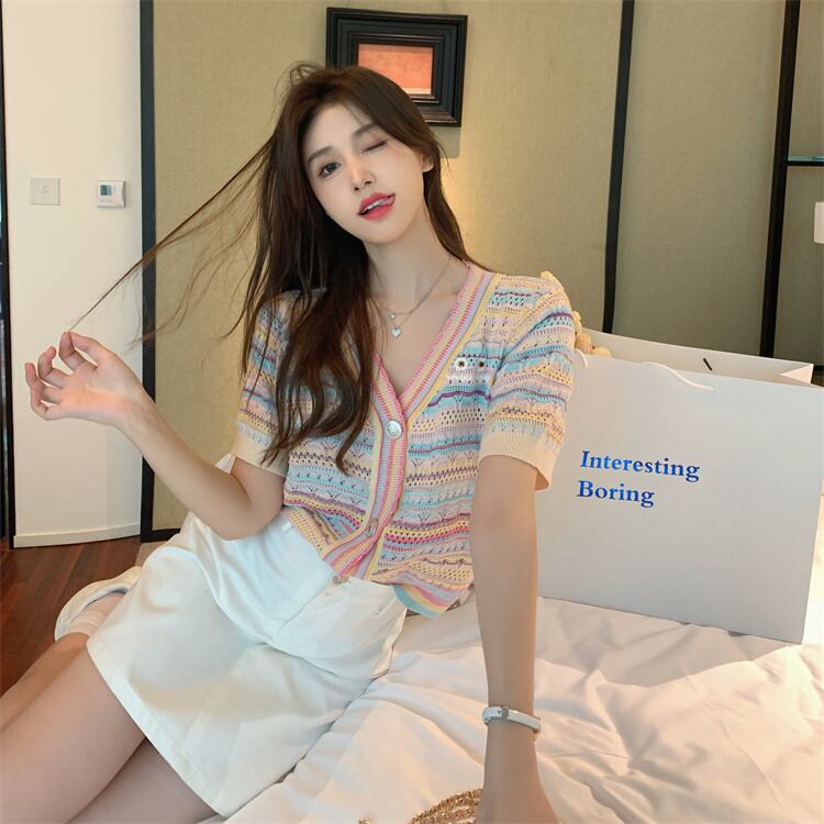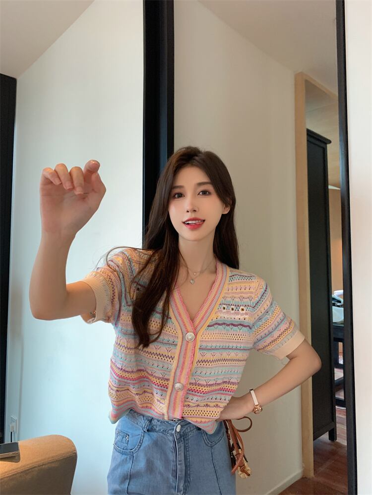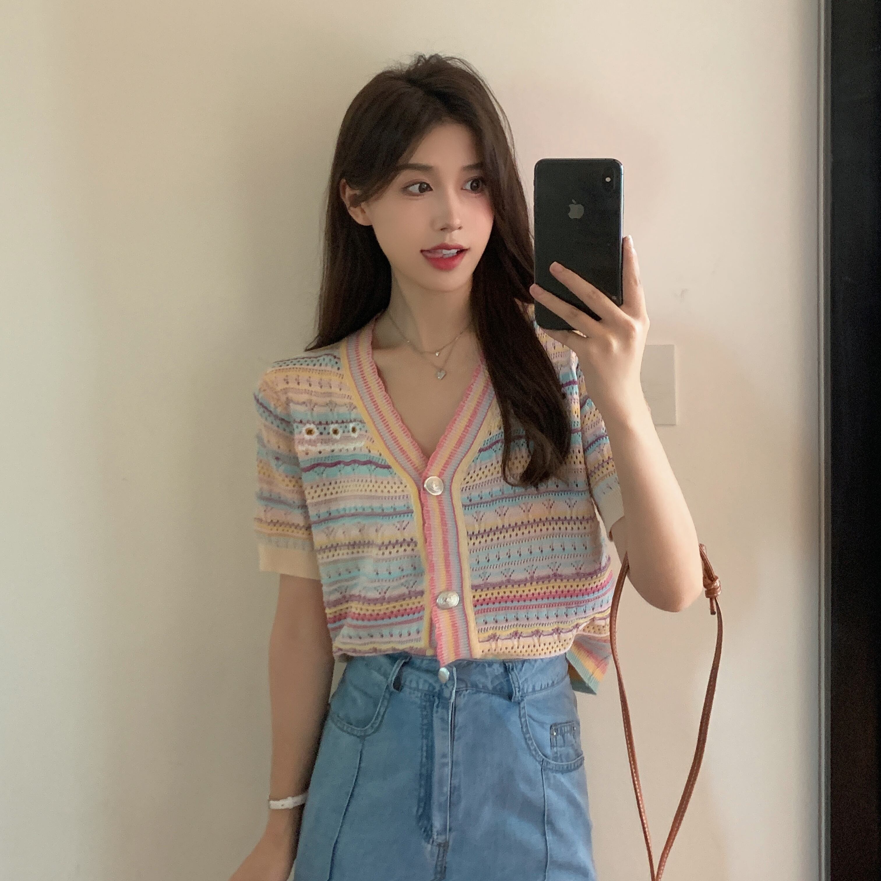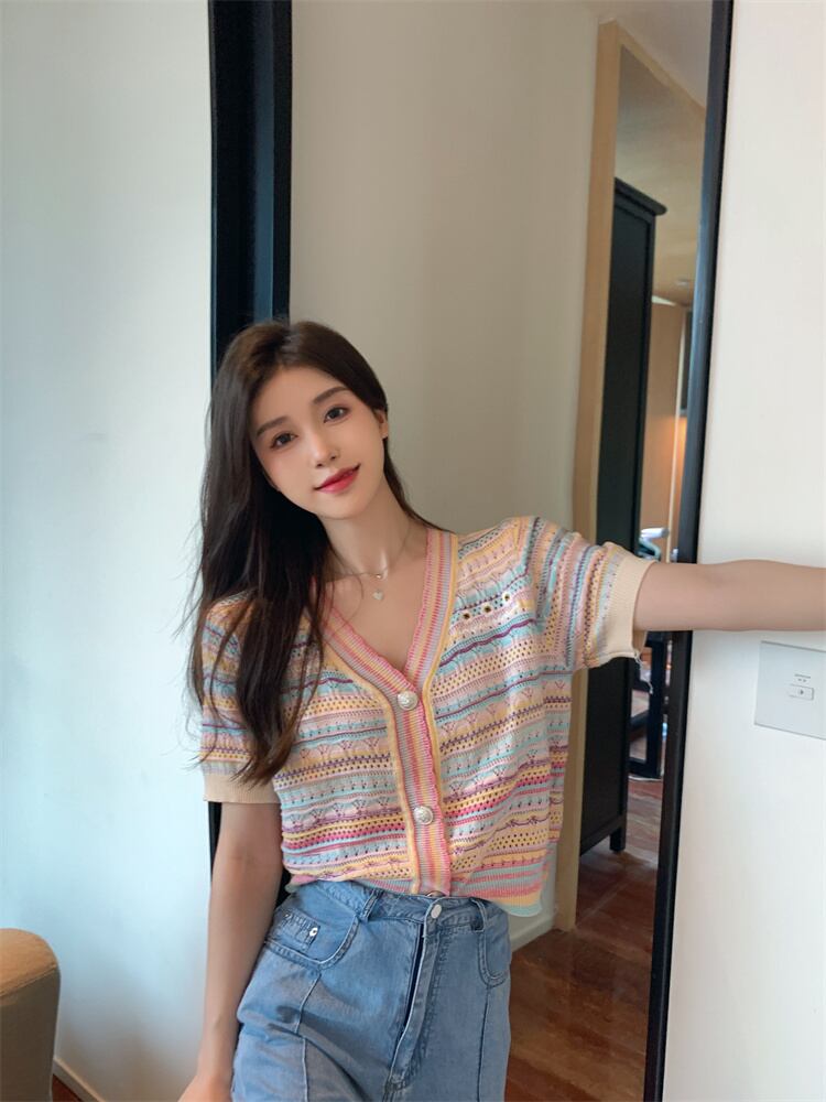 2022 新しい夏のハイエンド中空ショート v ネックトップ小さな香りストライプニット半袖アイスシルク tシャツの女性 サマー 夏物 Vネック 7460027370650858 | framboise21