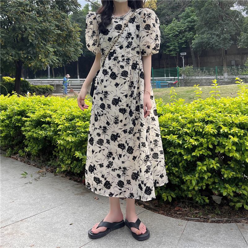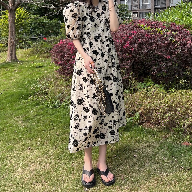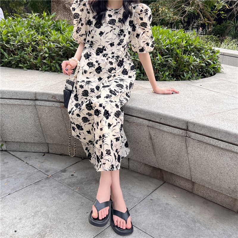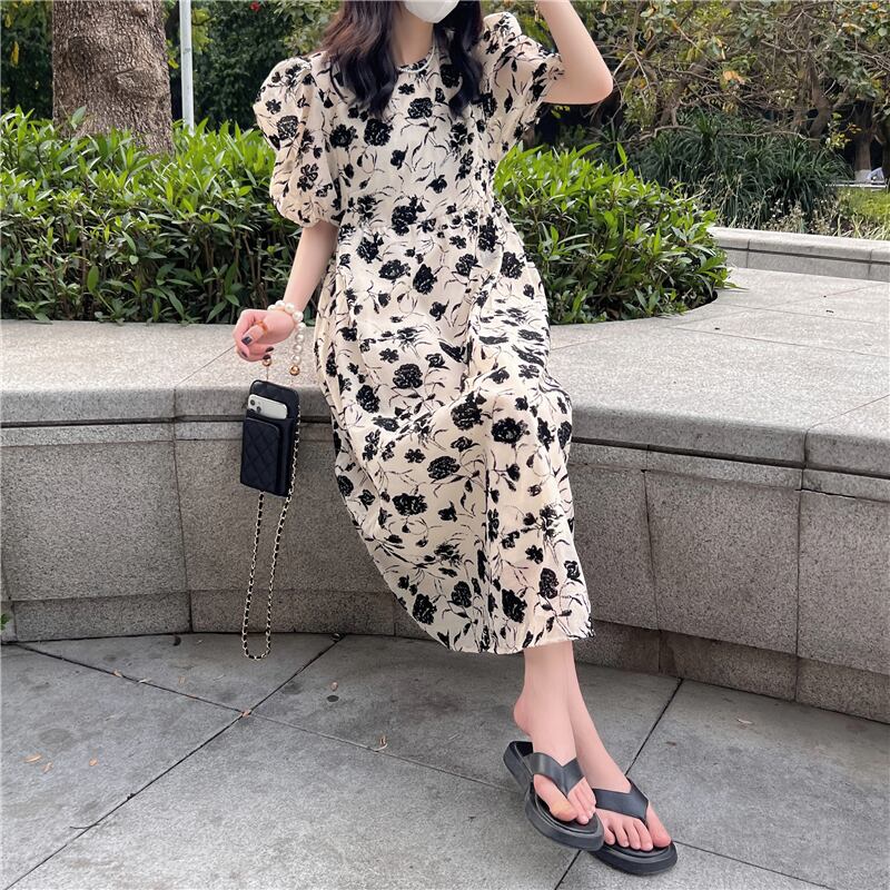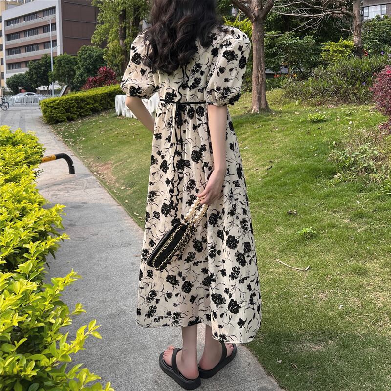 パフスリーブワンピース レディース 夏 フレンチオレンジ 茎花柄スカート レトロなデザインセンス ウエスト細めロングスカート サマー 夏物 7460073731909669 | framboise21