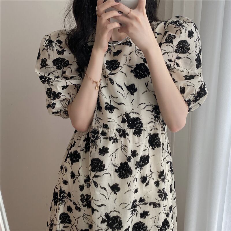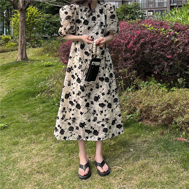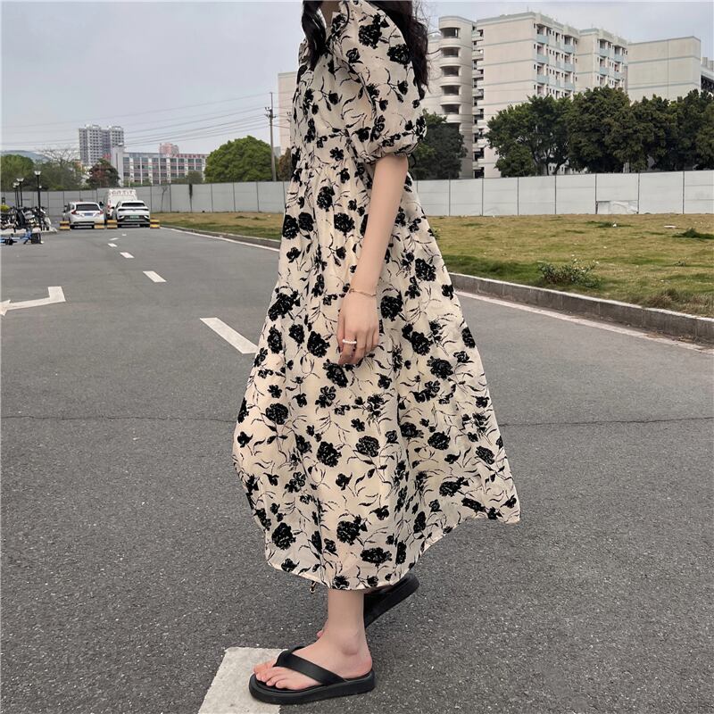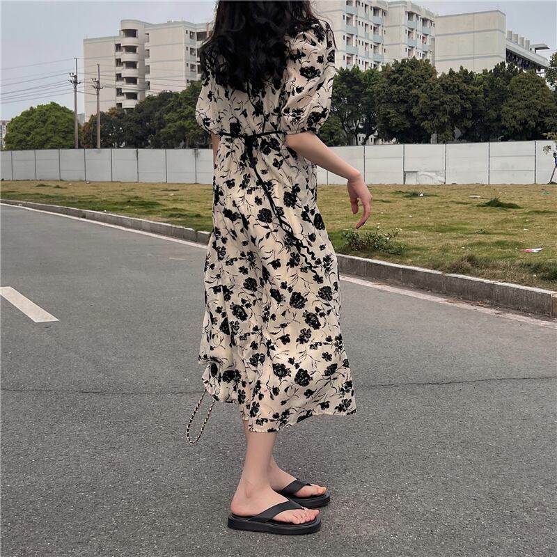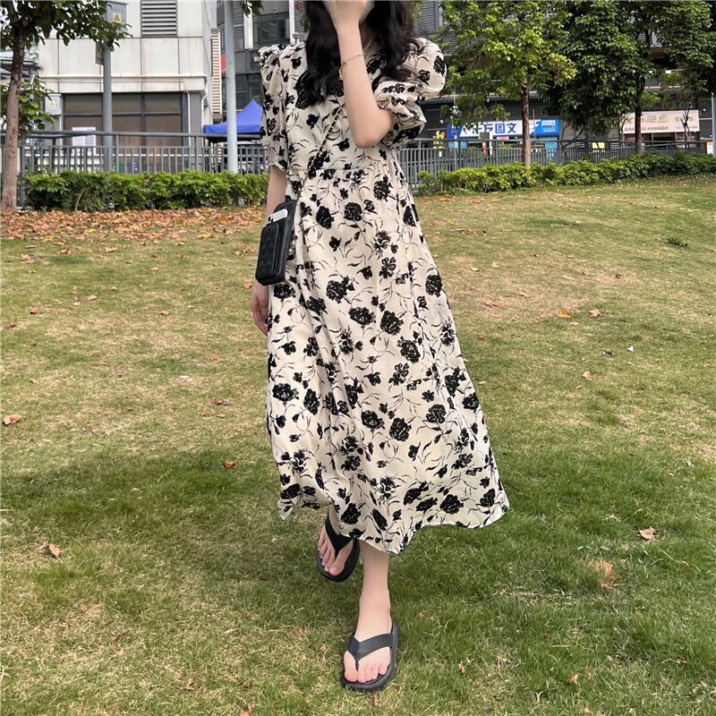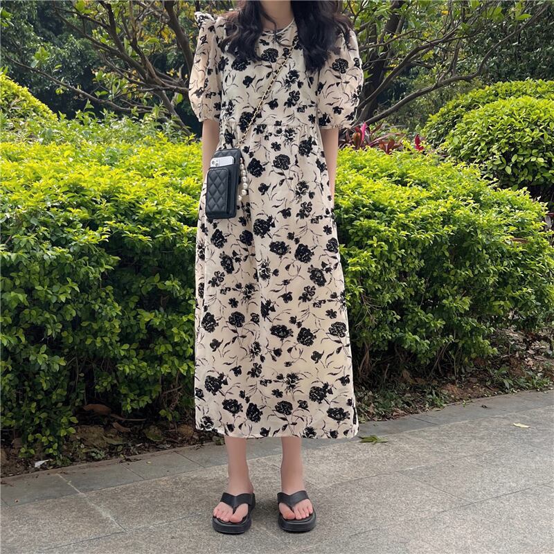 パフスリーブワンピース レディース 夏 フレンチオレンジ 茎花柄スカート レトロなデザインセンス ウエスト細めロングスカート サマー 夏物 7460073731909669 | framboise21