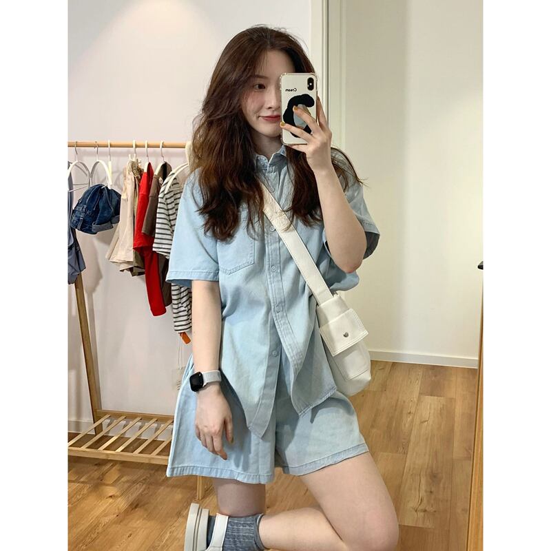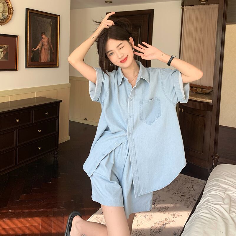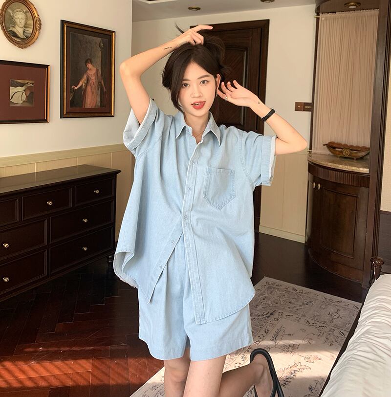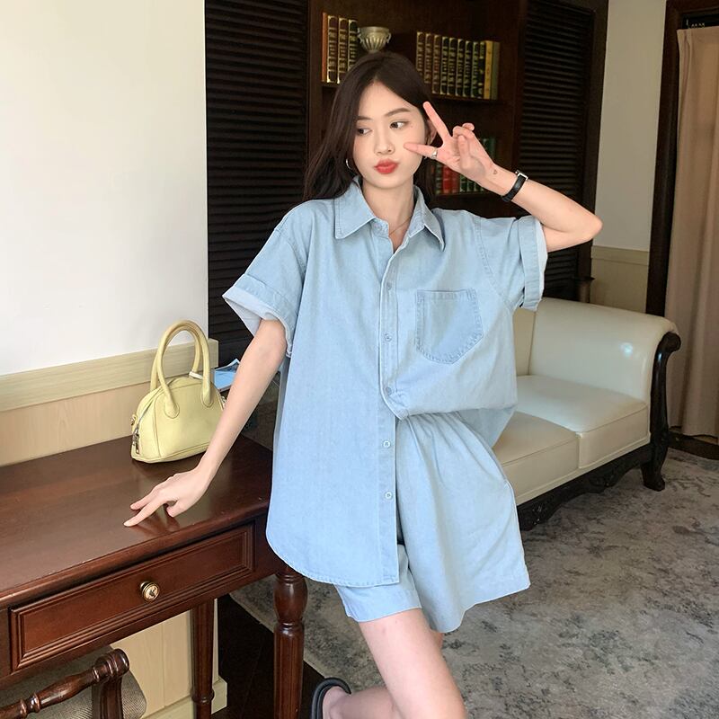 夏 2022 新ファッションスーツ薄い半袖デニムシャツコートハイウエストワイドレッグショーツツーピーススーツ ハイウェスト サマー 夏物 ブルマー ワイドパンツ 7460017847772842 | framboise21