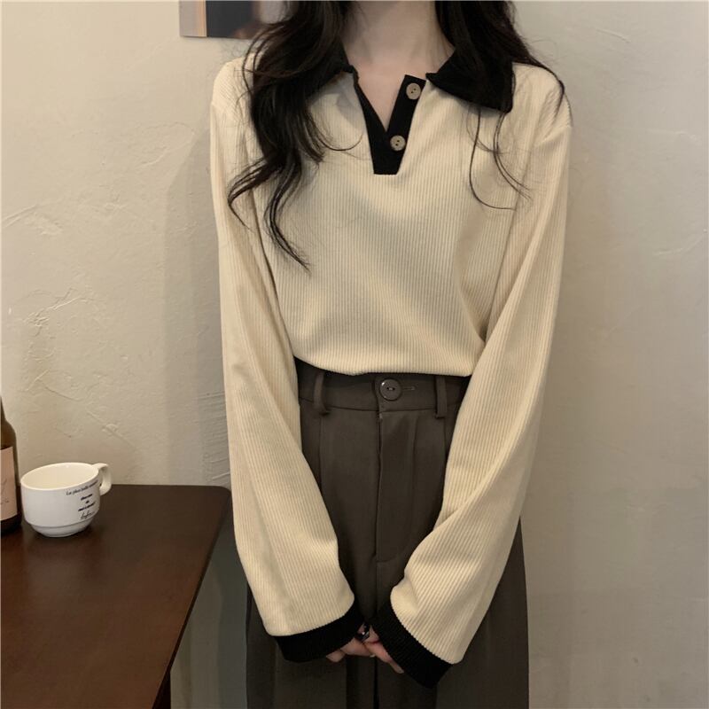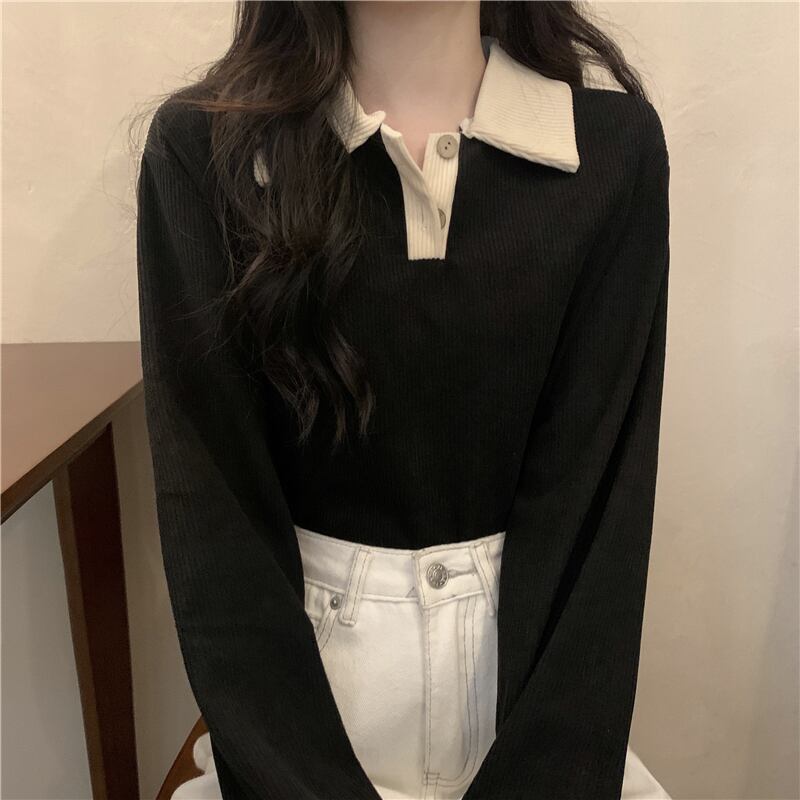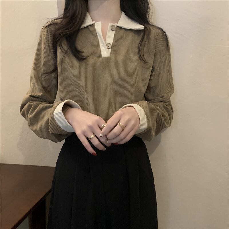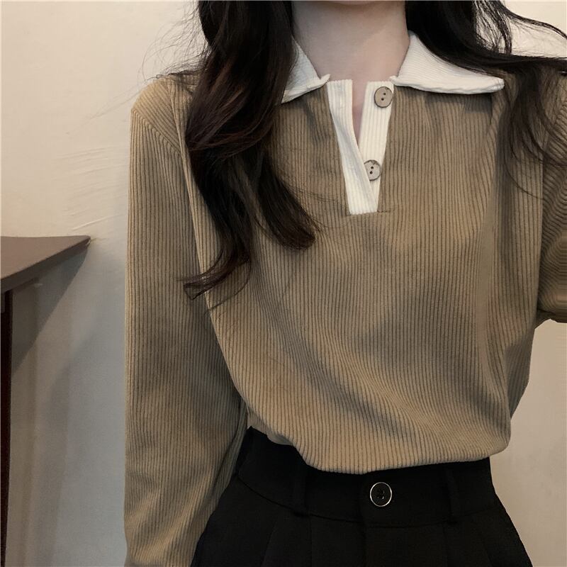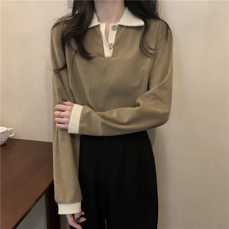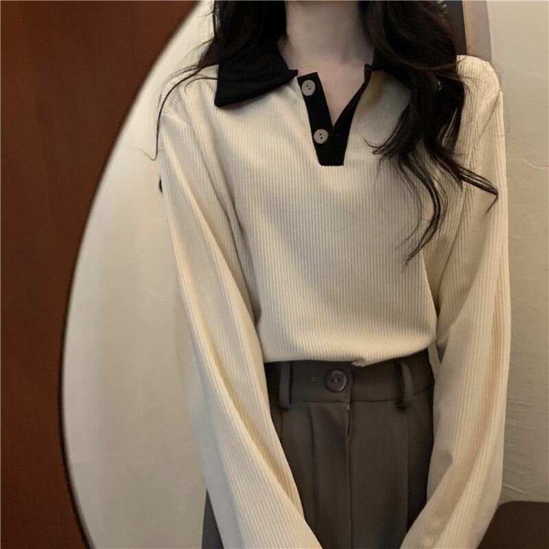 2022 春と秋の新しいフランスのニッチな配色 POLO 襟コーデュロイ トップ女性の洋風ゆったり長袖 T シャツ ロング スプリング 春物 オータム 秋物 Tシャツ 746001427767406 | framboise21