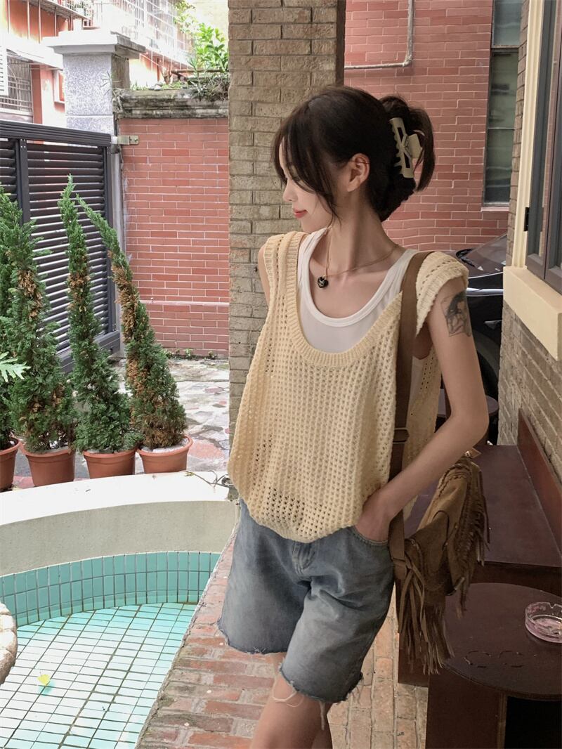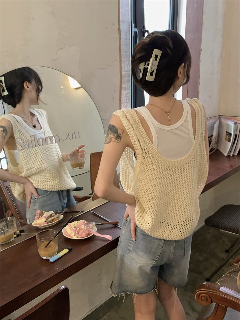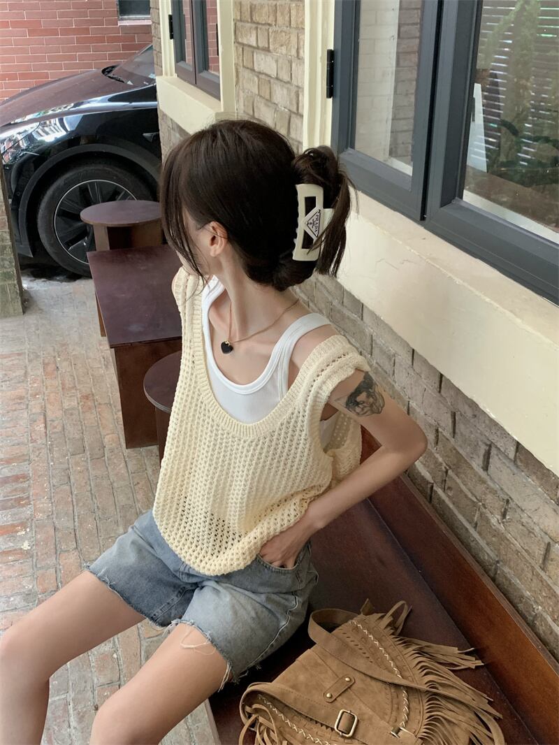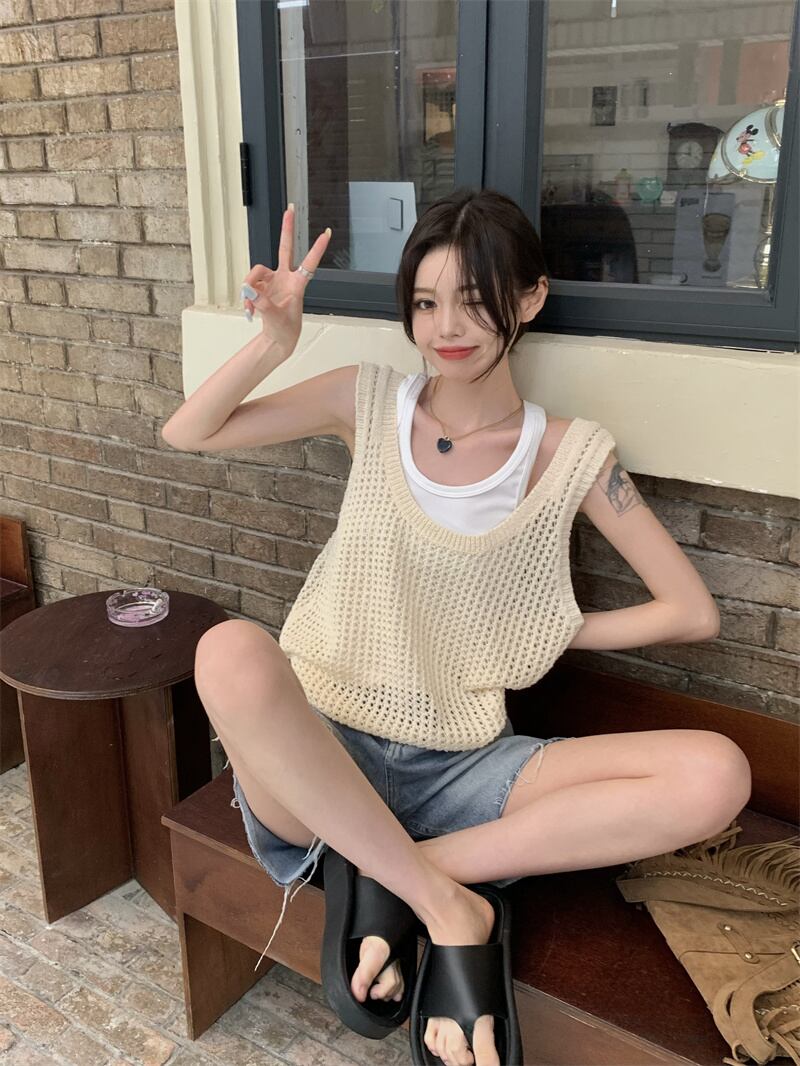 ホット中空ニット キャミソール ベスト女性夏夏アウター ノースリーブ ベスト デザイン センス ニッチ アイス シルク トップ サマー 夏物 7460023808591870 | framboise21
