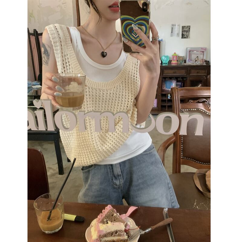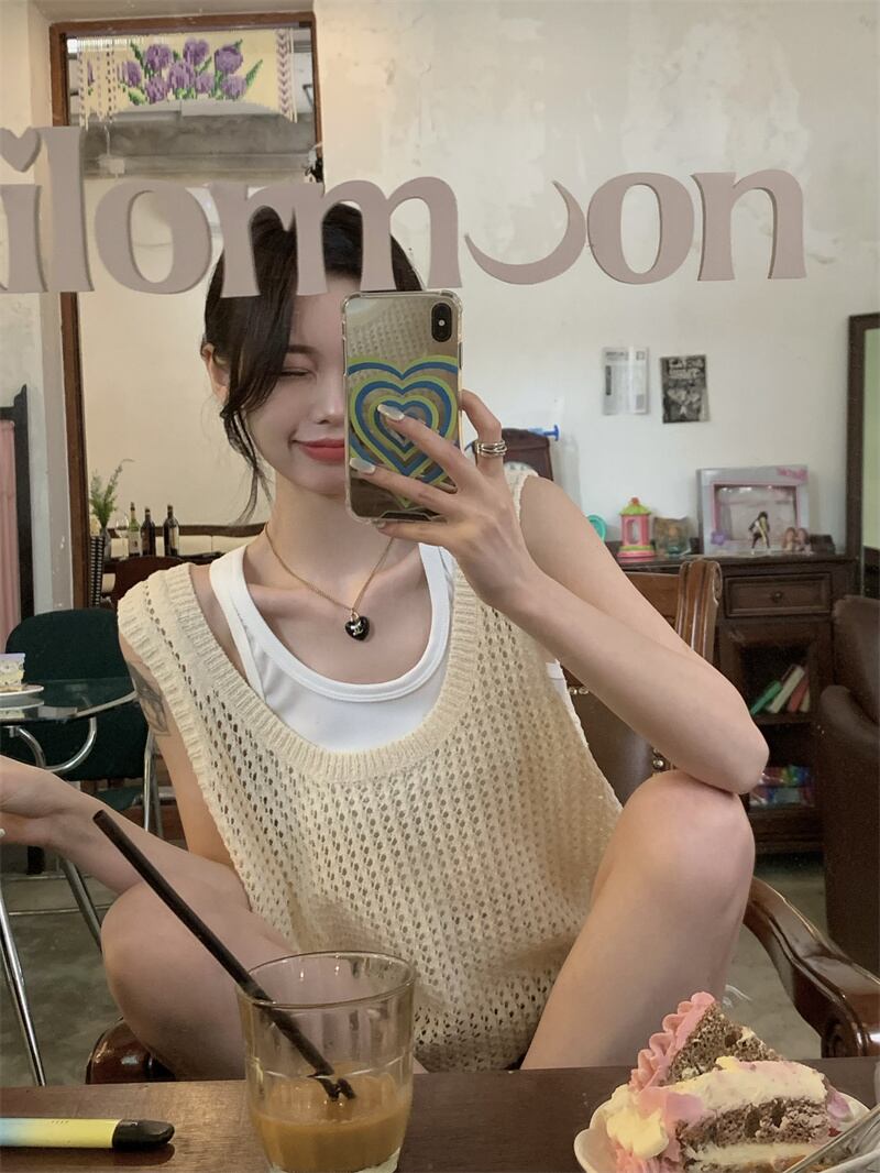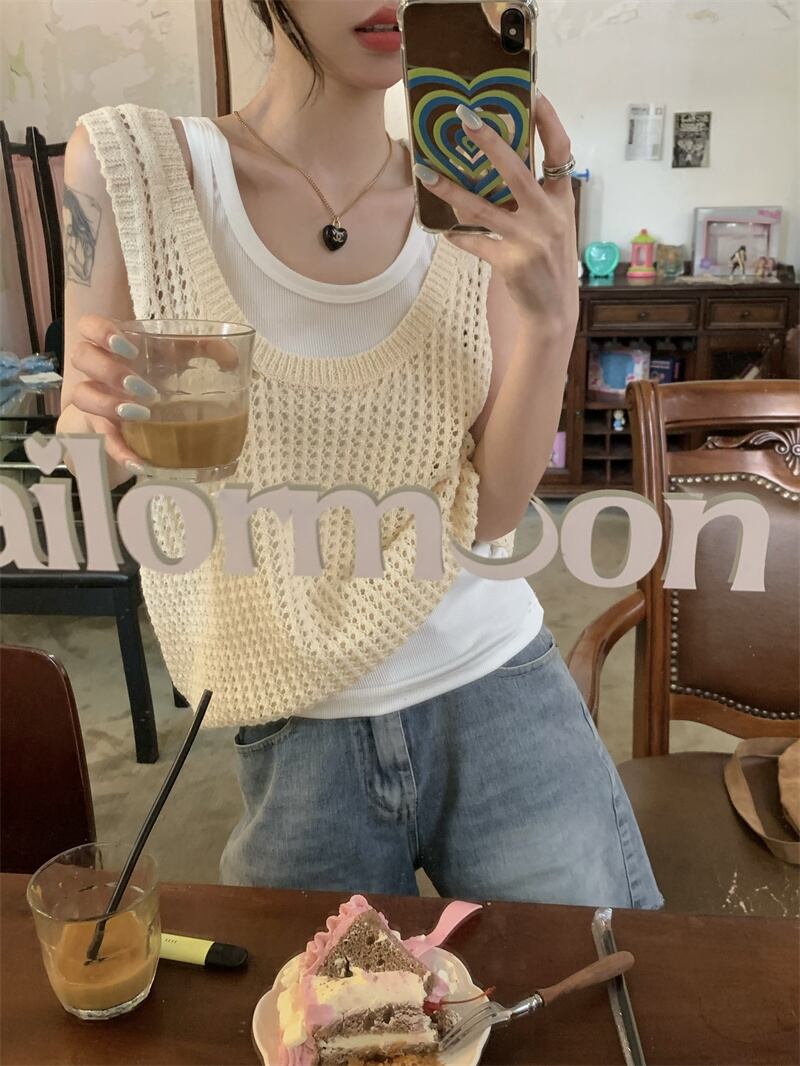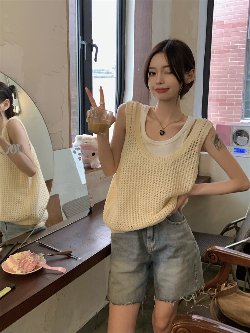 ホット中空ニット キャミソール ベスト女性夏夏アウター ノースリーブ ベスト デザイン センス ニッチ アイス シルク トップ サマー 夏物 7460023808591870 | framboise21