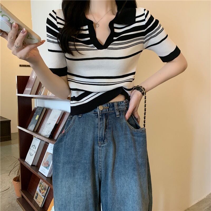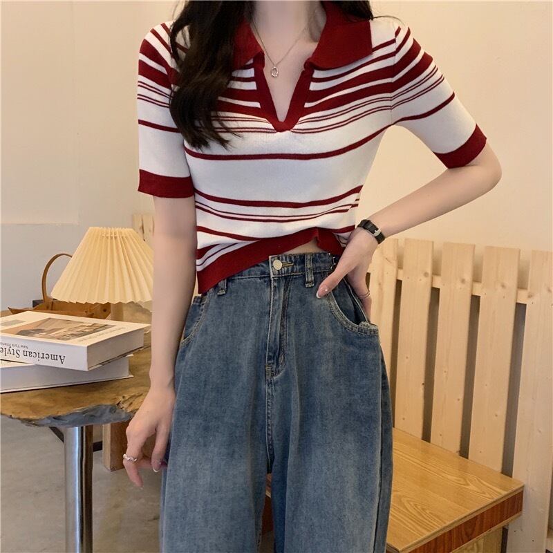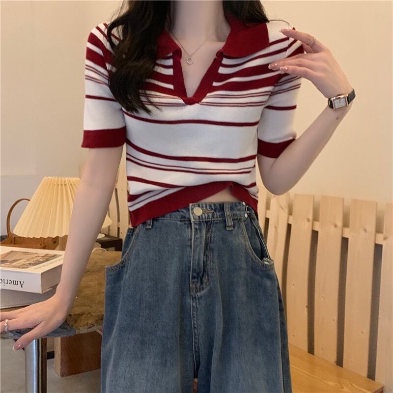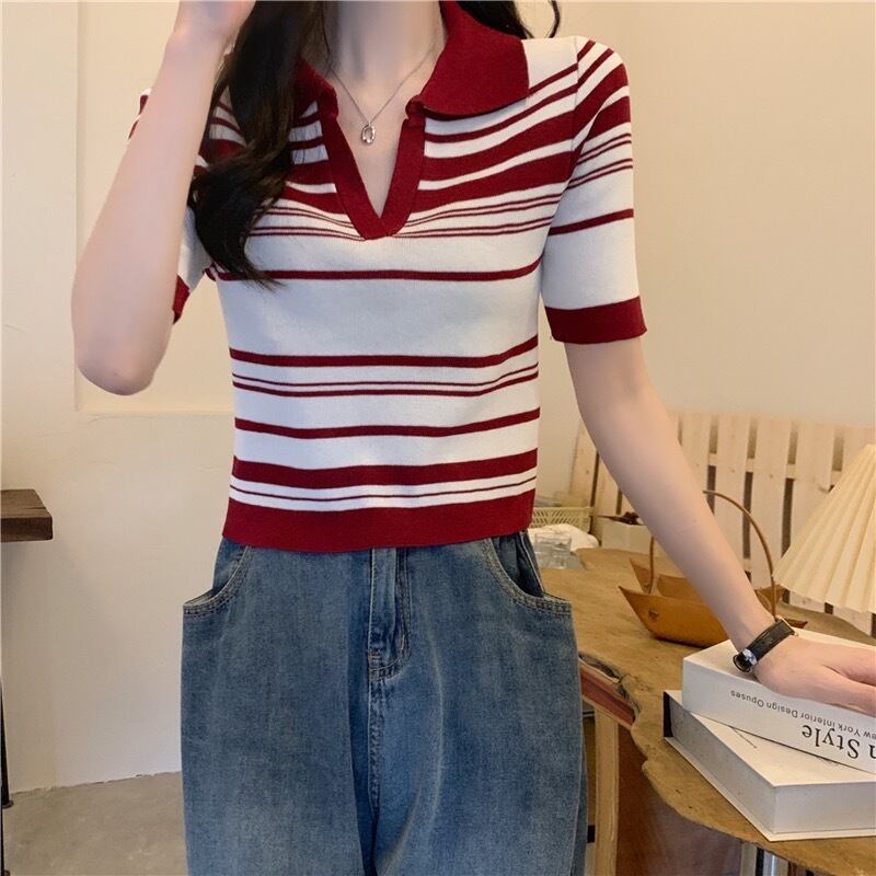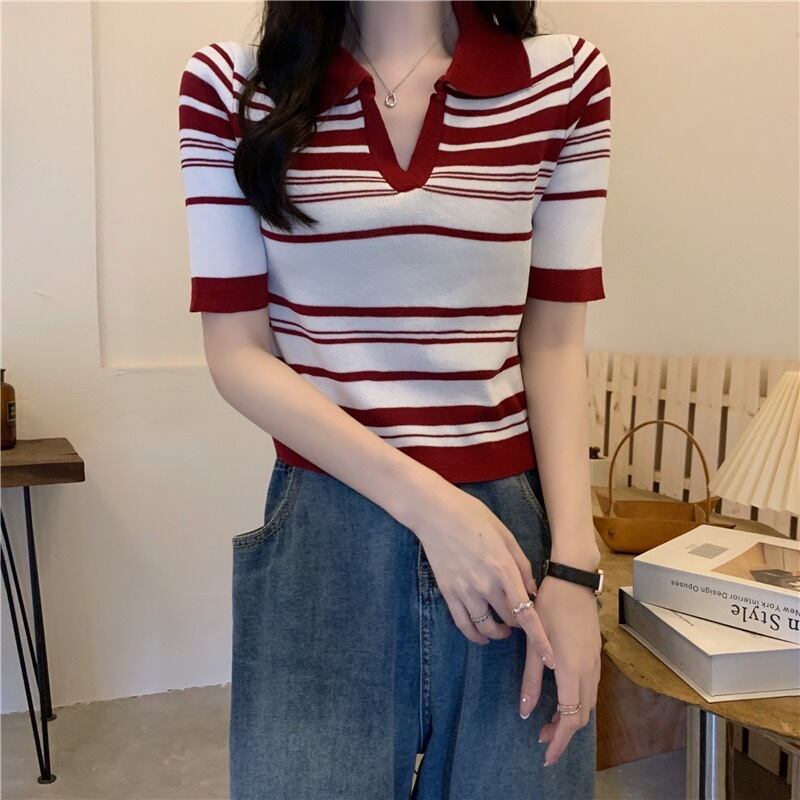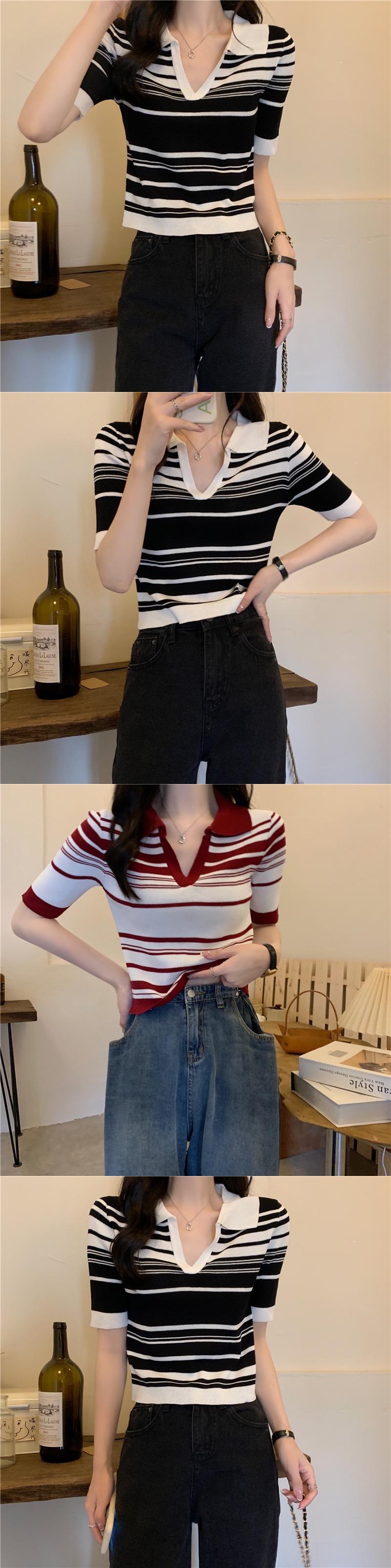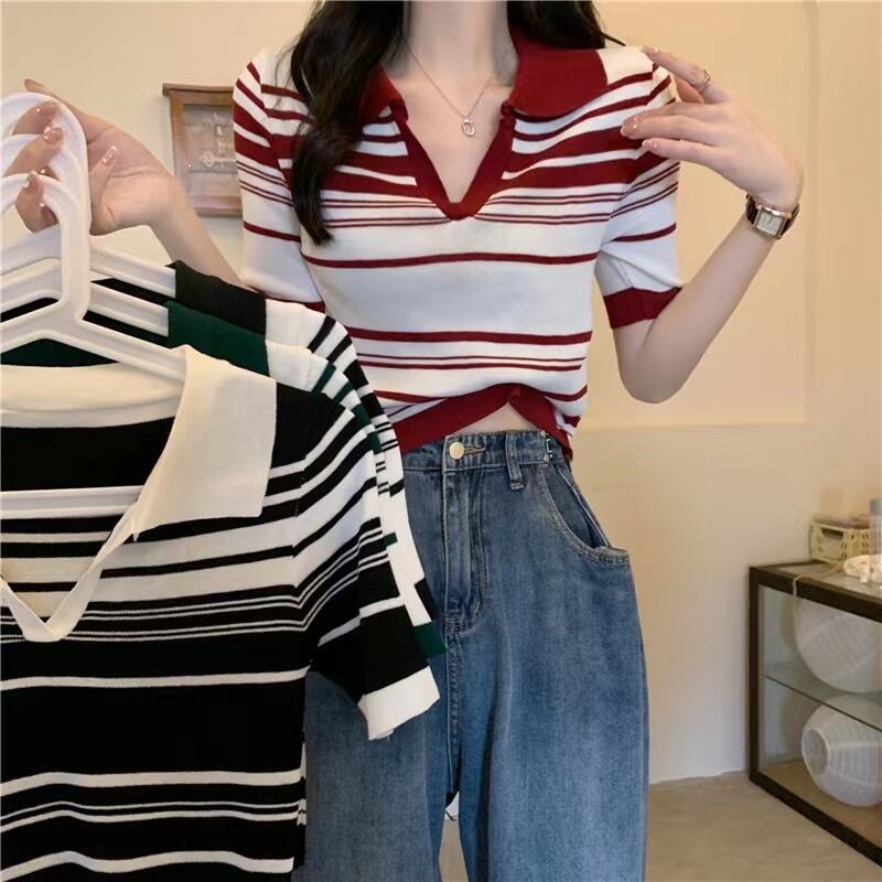 フロントショルダーストライプ半袖 Tシャツの女性の夏スリム薄手のコットンポロシャツシックな美しいショートトップ夏 ハーフスリーブ サマー 夏物 7460036710131461 | framboise21