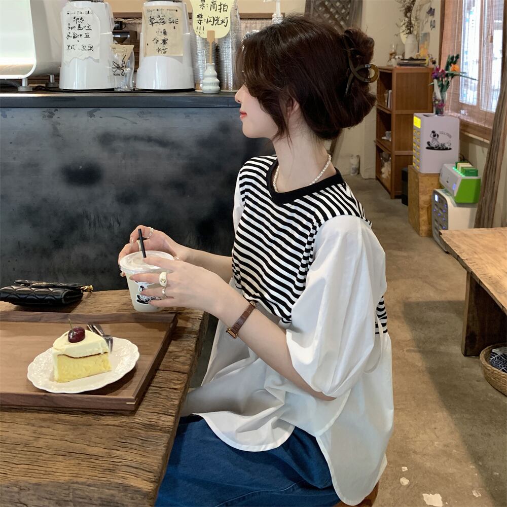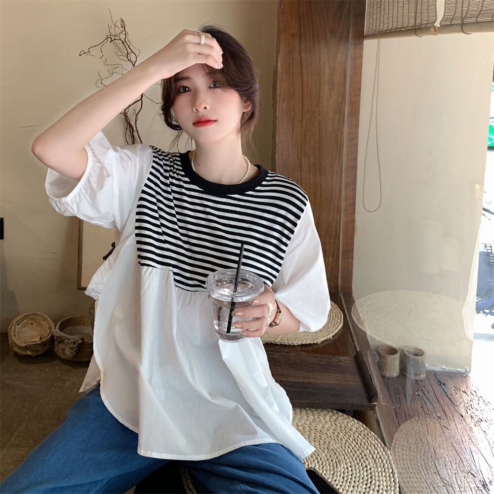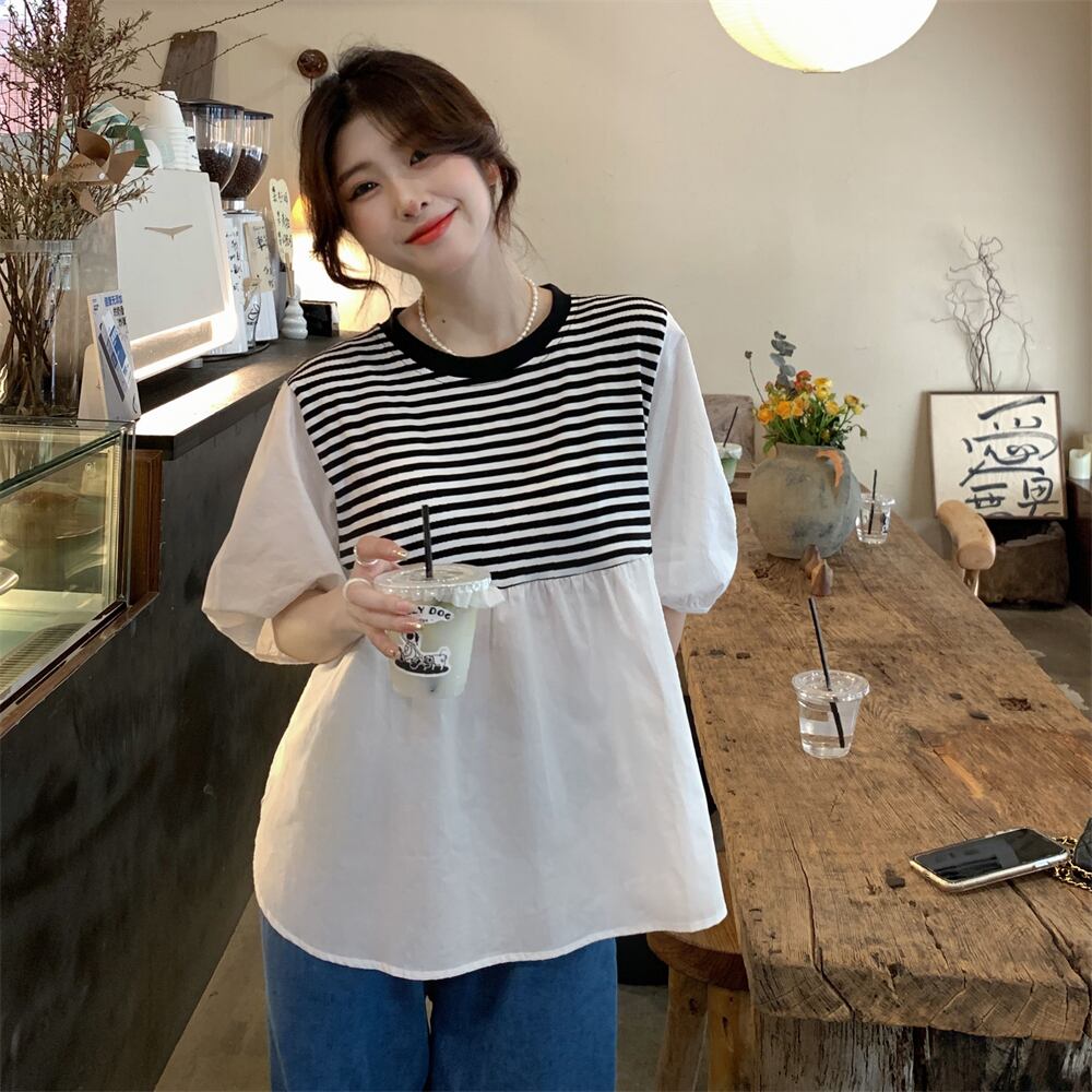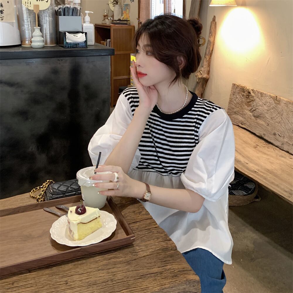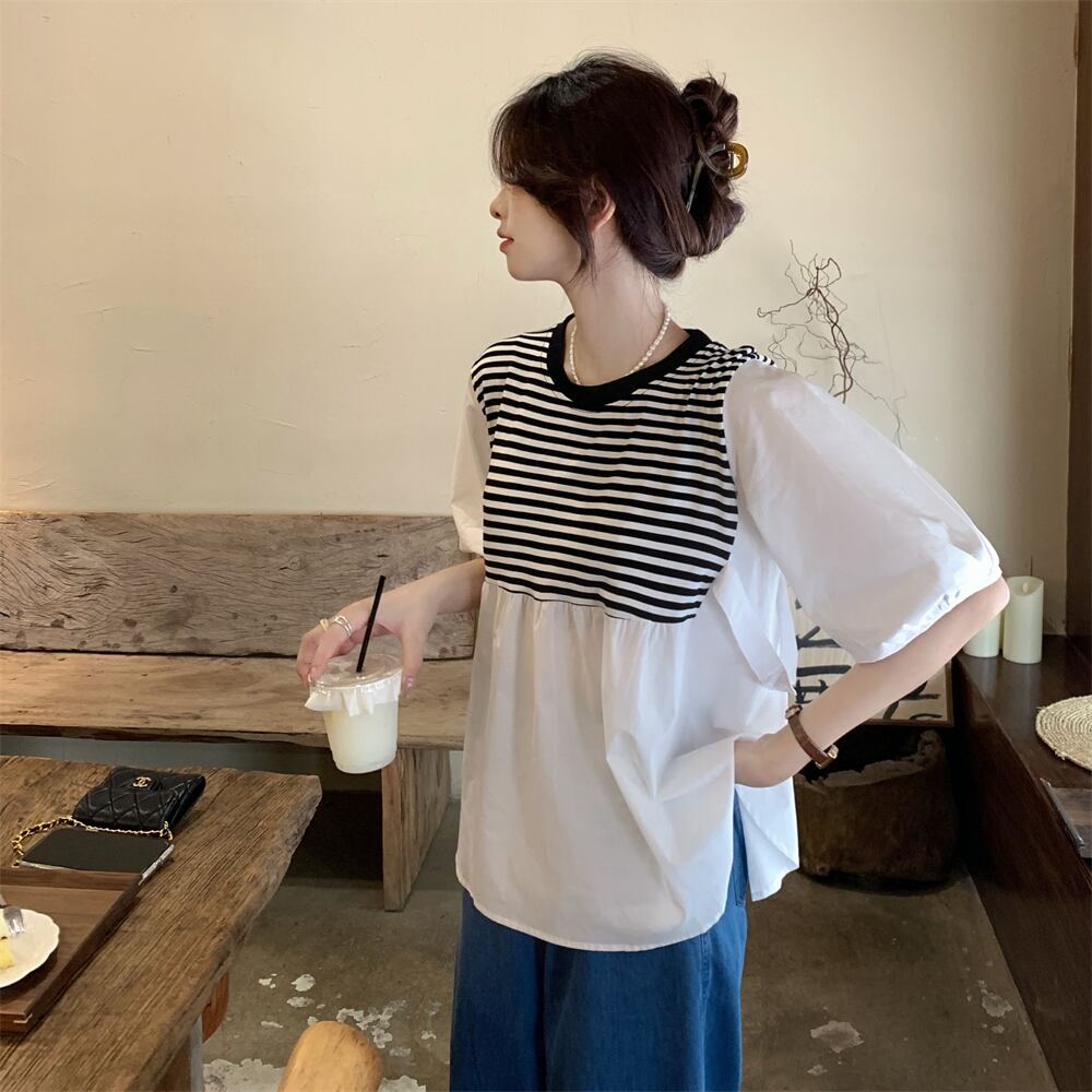 -end シックで綺麗なストライプシャツ 半袖 ベビーシャツ レディース 夏 フレンチ 優しいシフォン トップス ルーズ tシャツ サマー 夏物 7460088762377451 | framboise21