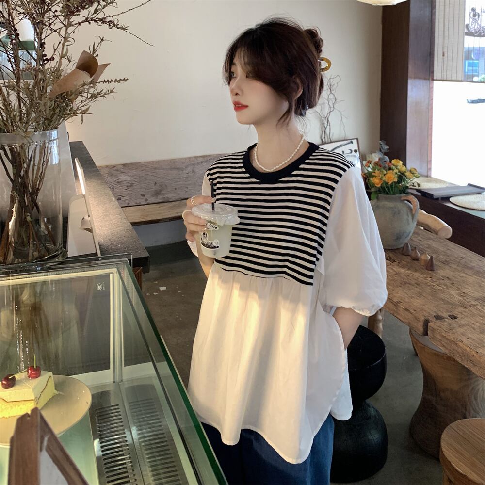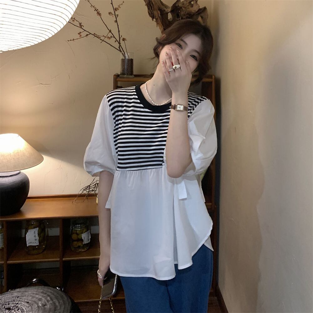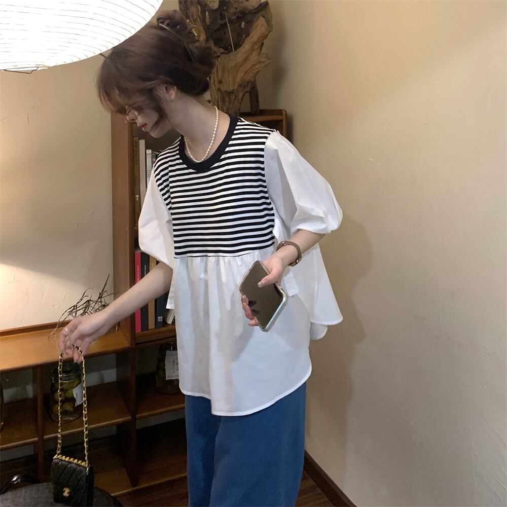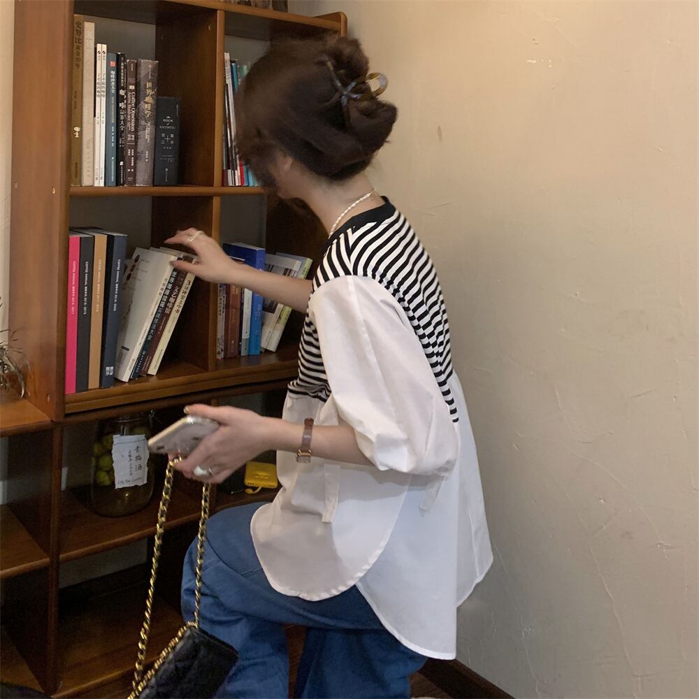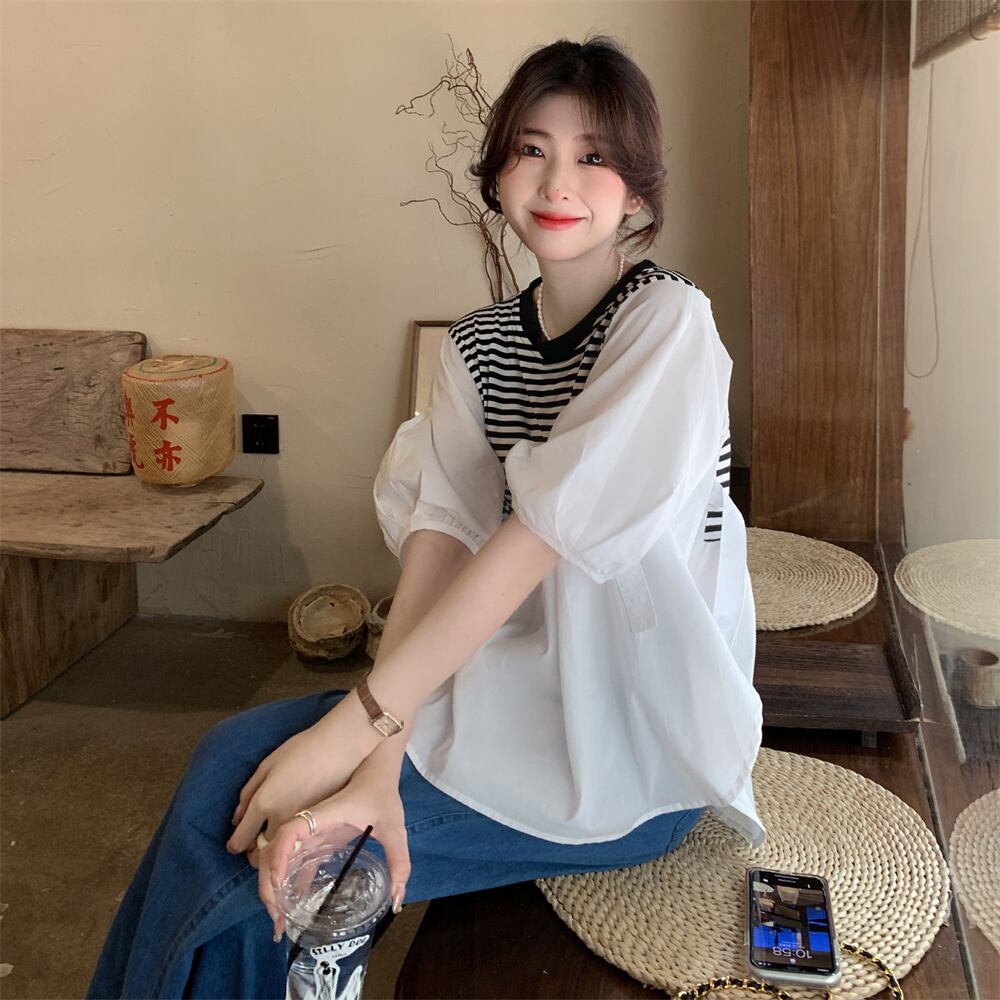 -end シックで綺麗なストライプシャツ 半袖 ベビーシャツ レディース 夏 フレンチ 優しいシフォン トップス ルーズ tシャツ サマー 夏物 7460088762377451 | framboise21