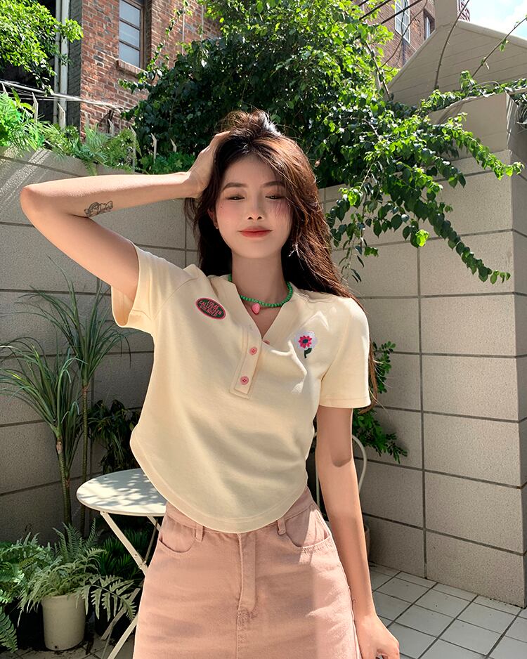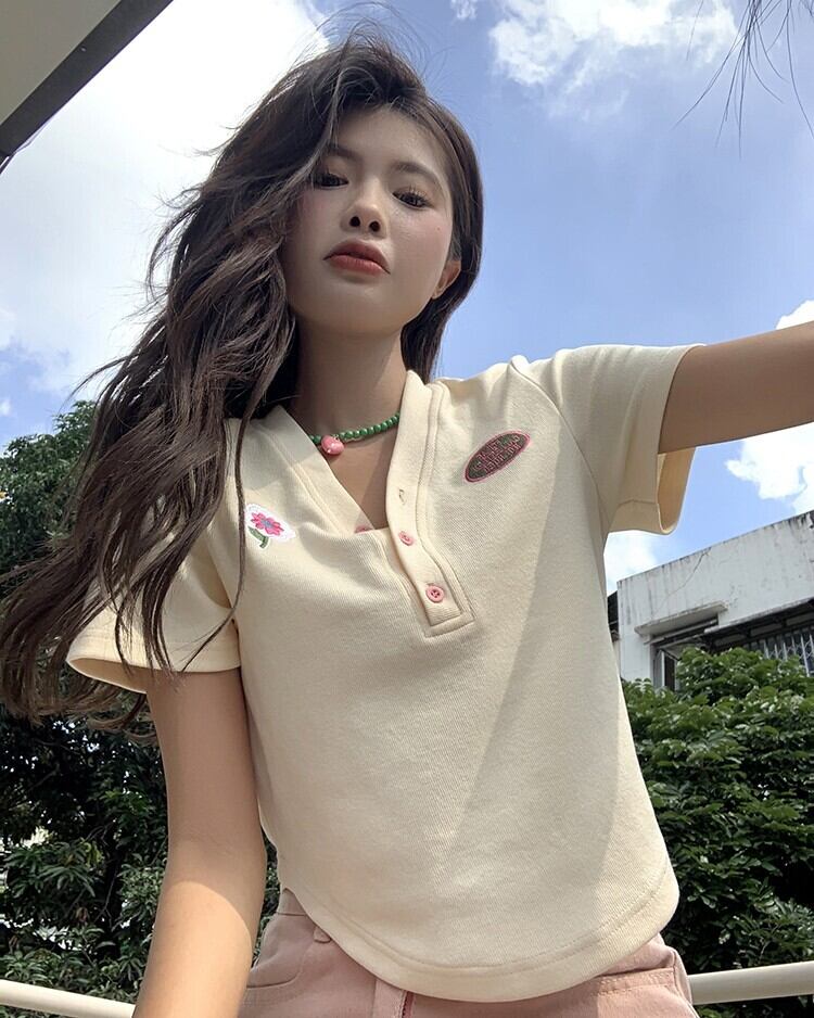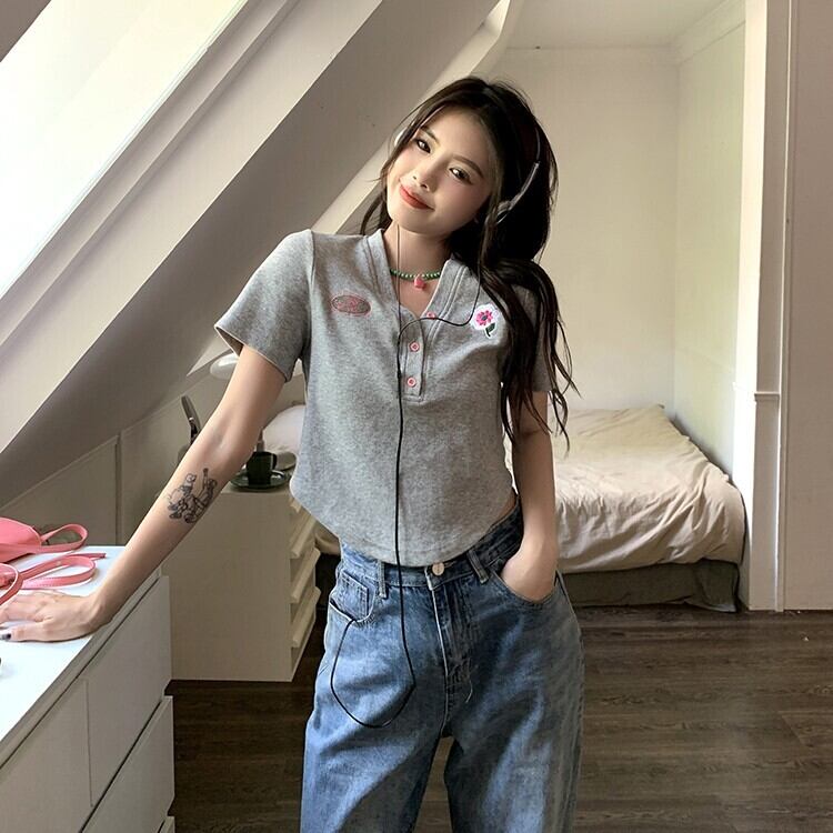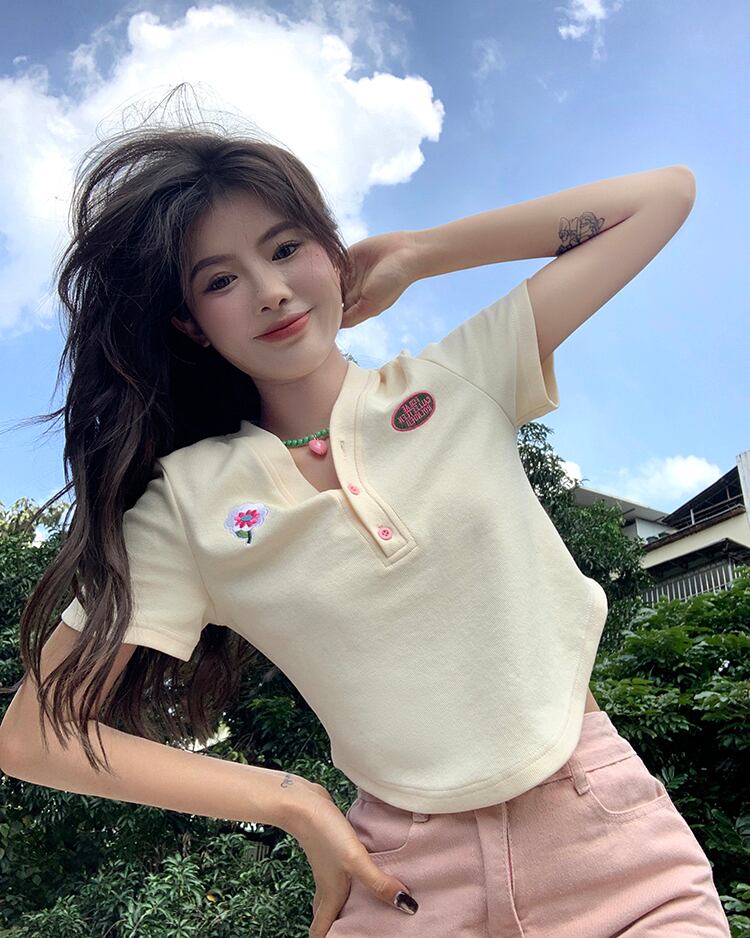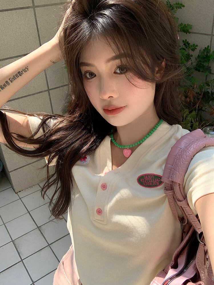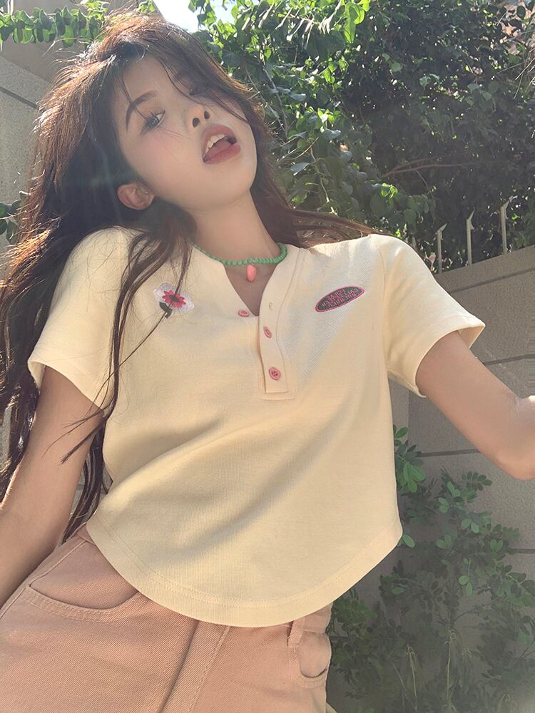 アメリカンVネックフロントショルダー半袖Tシャツレディースサマーデザインニッチなサマースタイルイレギュラーシックな肉まみれ甘辛トップス 大人ガーリー スウィート キュート カジュアル 夏物 7460045901762740 | framboise21