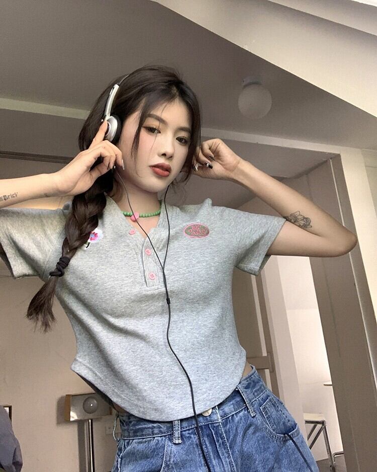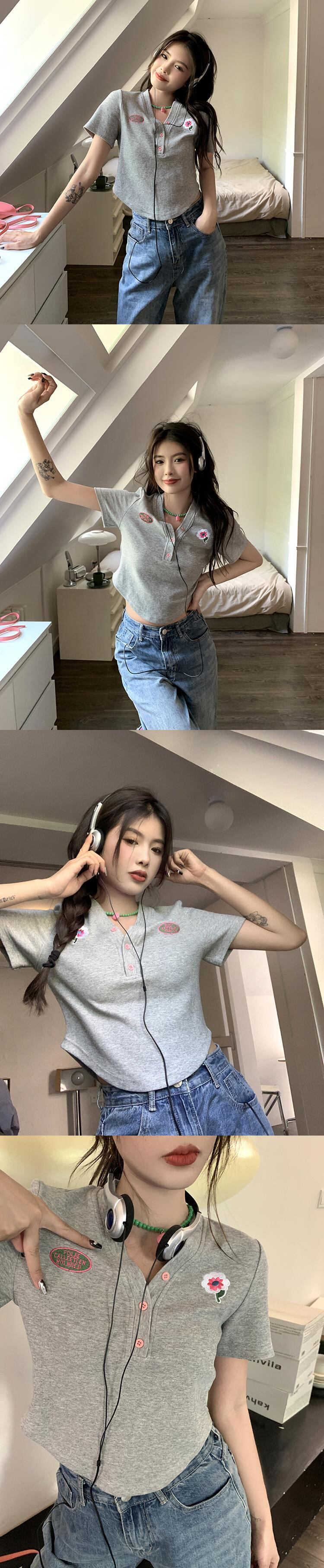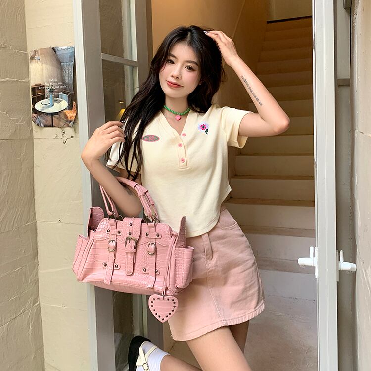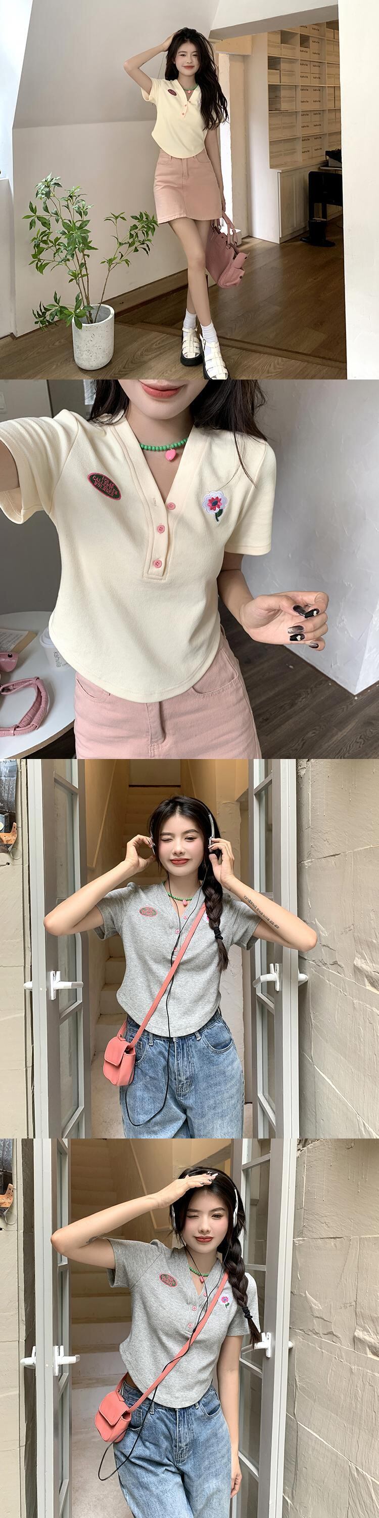 アメリカンVネックフロントショルダー半袖Tシャツレディースサマーデザインニッチなサマースタイルイレギュラーシックな肉まみれ甘辛トップス 大人ガーリー スウィート キュート カジュアル 夏物 7460045901762740 | framboise21