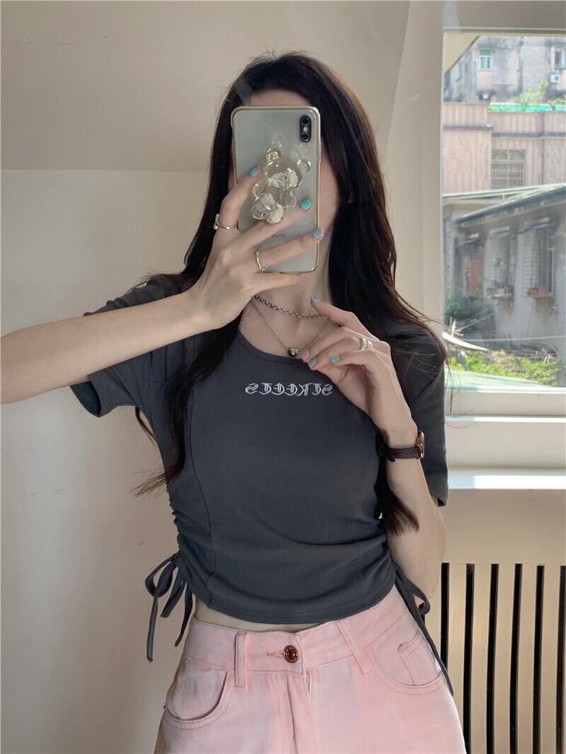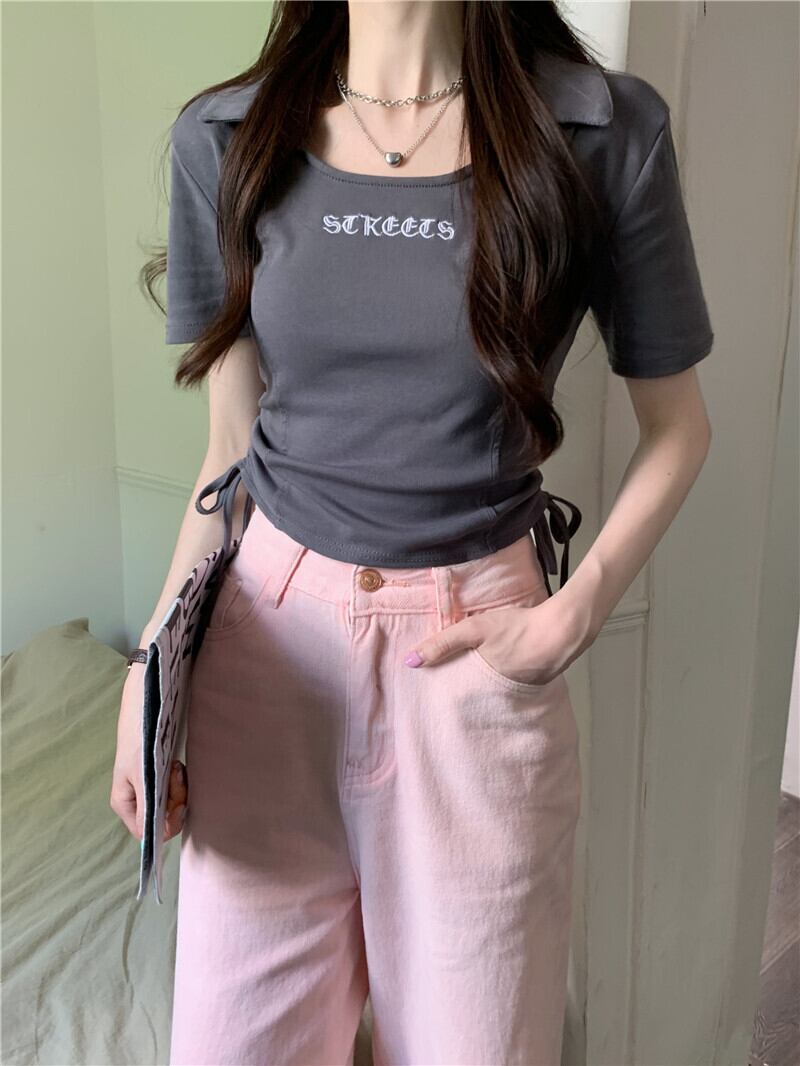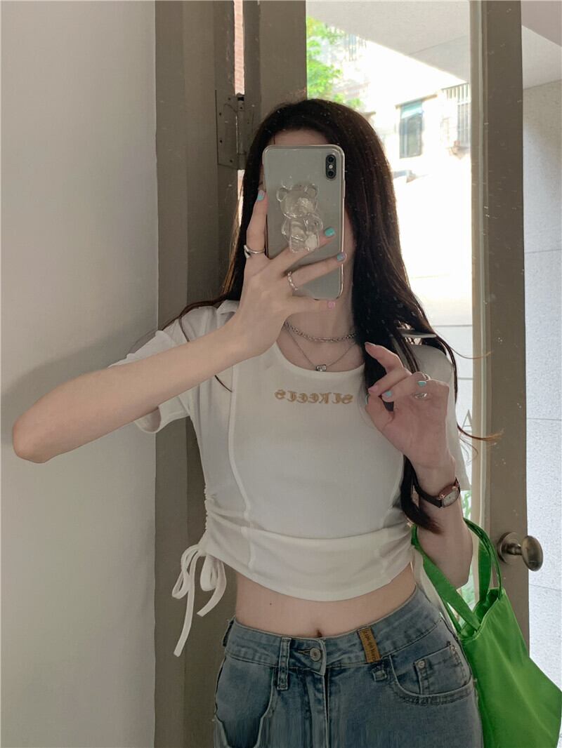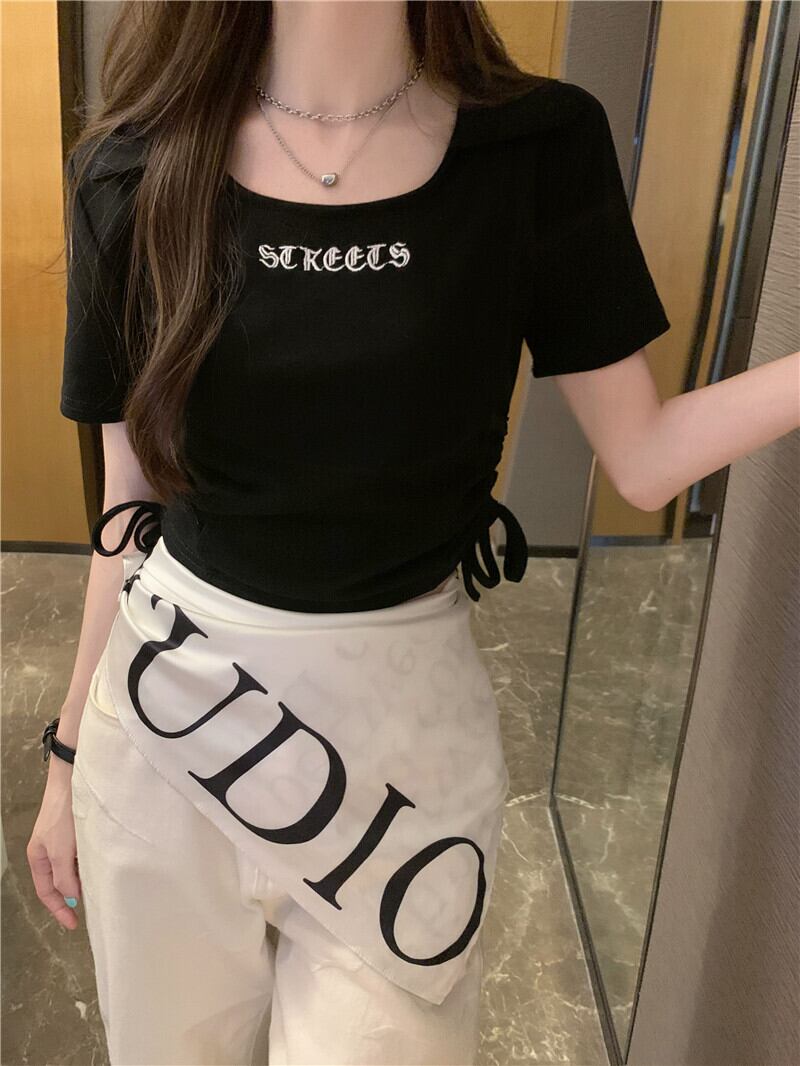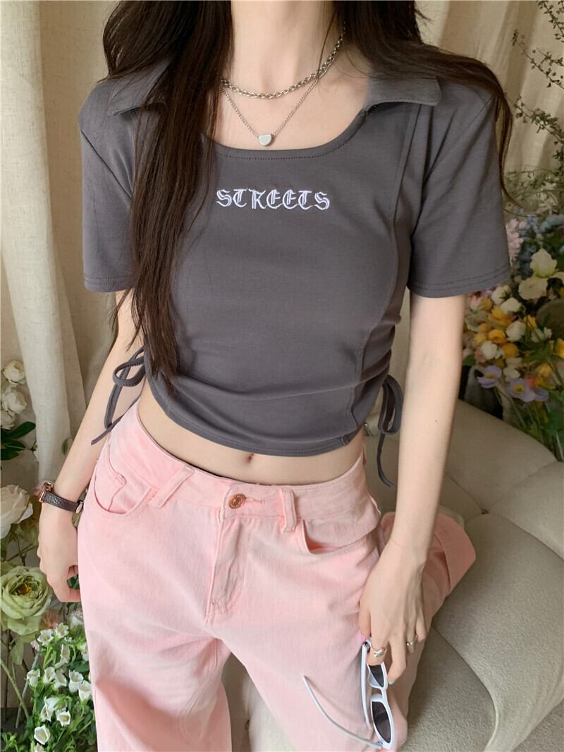 ラペル 半袖 フロントショルダー Tシャツ レディース スリム デザイン 小さめ 甘い 巾着 へそ ハイウエスト ショート トップス 夏 ハイウェスト 大人ガーリー スウィート キュート カジュアル サマー 夏物 7460080207585328 | framboise21