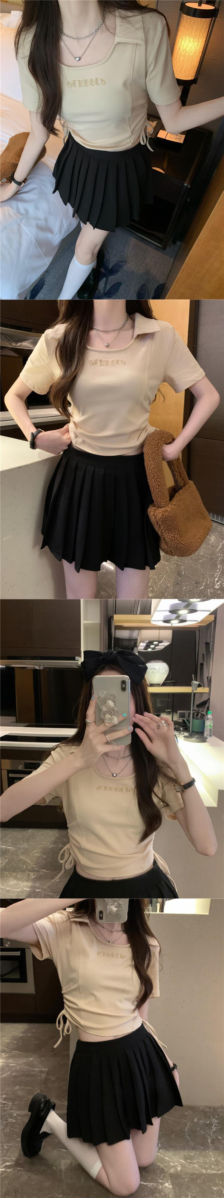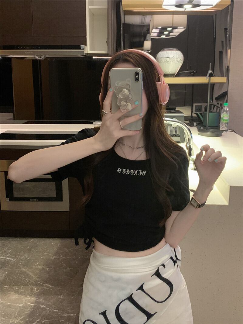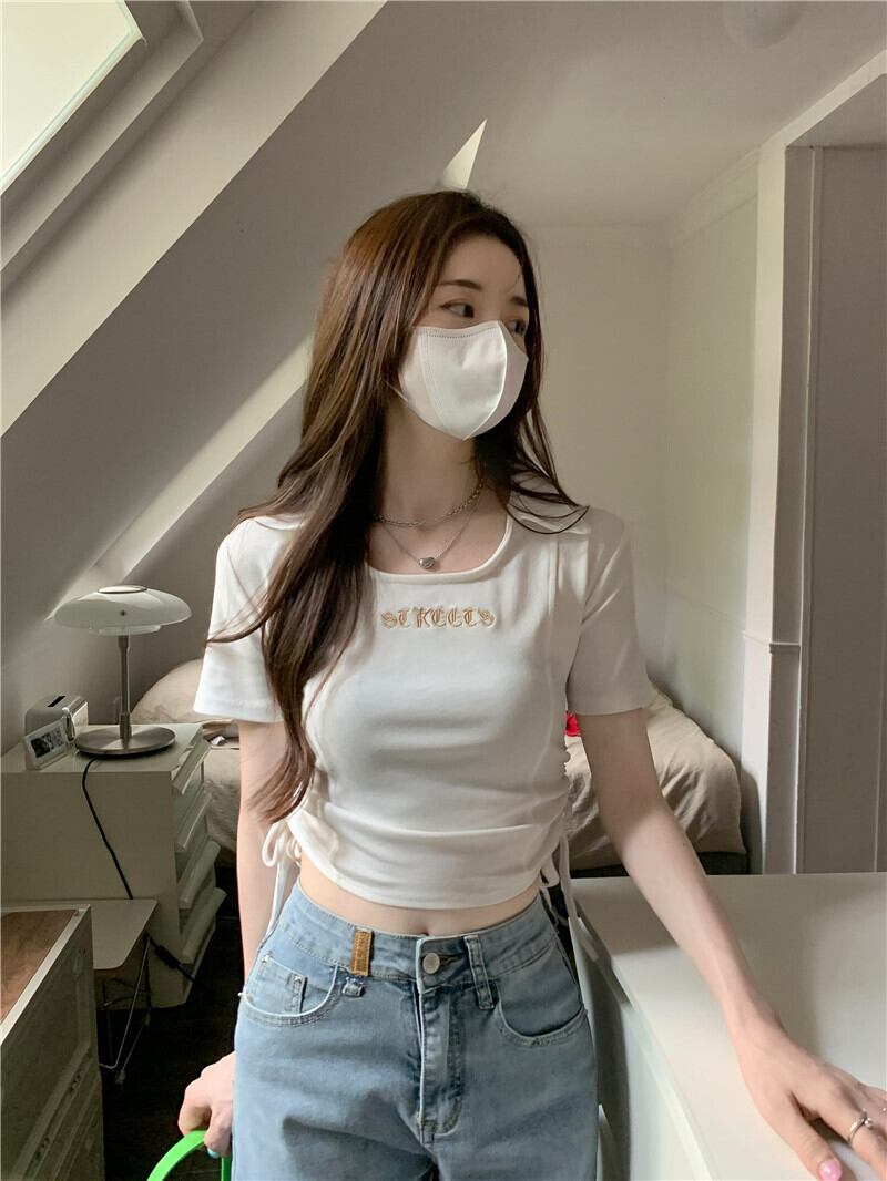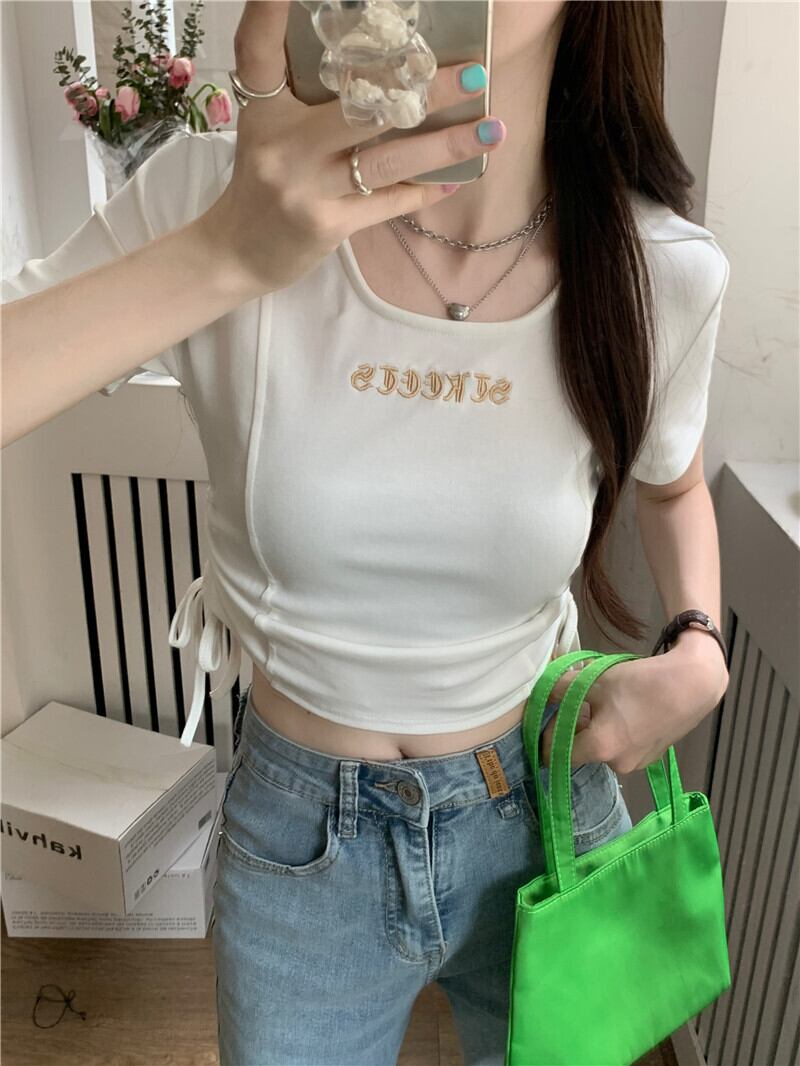 ラペル 半袖 フロントショルダー Tシャツ レディース スリム デザイン 小さめ 甘い 巾着 へそ ハイウエスト ショート トップス 夏 ハイウェスト 大人ガーリー スウィート キュート カジュアル サマー 夏物 7460080207585328 | framboise21